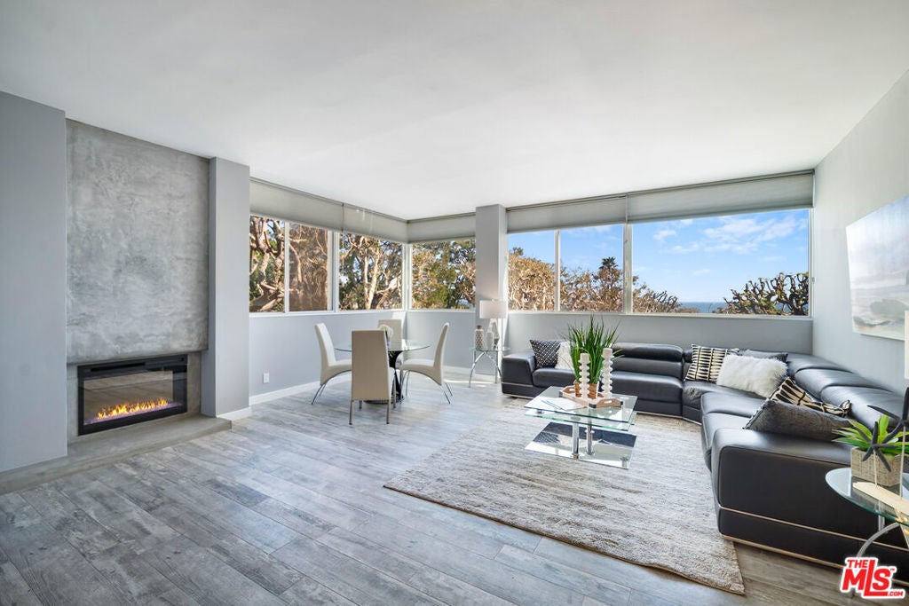 Perched above the Pacific at the iconic Edgewater Towers, this reimagined 2-bed, 2-bath coastal retreat spans 1,261 sq ft of light-filled living space with breathtaking ocean, mountain, and treetop views. Large windows that slide open invite in the ocean breeze, bathing the open-concept interiors in natural light. The sleek modern kitchen features rich cabinetry, quartz countertops, and an oversized waterfall island flowing effortlessly into the spacious living area anchored by a sculptural concrete fireplace. Both bathrooms have been tastefully redesigned with refined finishes, creating a timeless, elevated aesthetic throughout.Set on nine acres of lush blufftop grounds, Edgewater Towers offers resort-style living with 24-hour guard-gated security, two saltwater pools and spas, a fitness center, tennis and basketball courts, private hiking trails, BBQ areas, and manicured gardens all moments from the beach and Palisades Village. A rare opportunity to experience California coastal living at its finest. Moments from the best shops, beaches, and restaurants at the Palisades Village, Malibu, Rustic Canyon, and more!