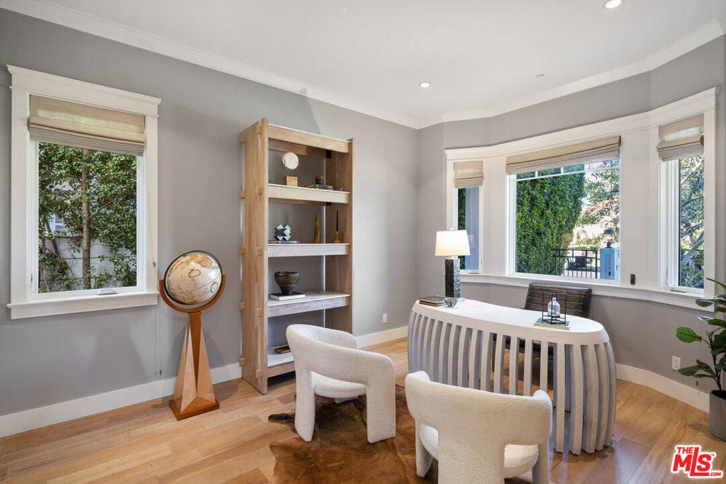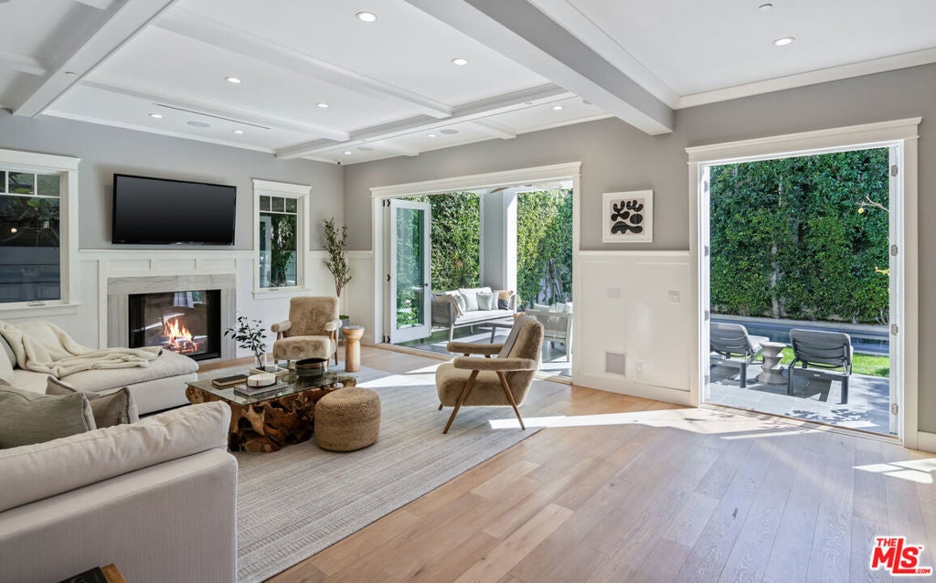 Tucked away in the highly coveted Beverly Grove neighborhood, this Cape Cod-inspired residence blends timeless design with modern luxury, creating the ideal setting for elevated family living. The entry level welcomes you with a grand two-story foyer and a thoughtfully designed floor plan featuring formal living and dining rooms, a versatile en suite bedroom or home office, and an expansive great room that flows seamlessly into the kitchen. The chef's kitchen is a standout, equipped with a Bertazzoni Heritage 6-burner range with griddle, custom cabinetry, and elegant quartzite countertops that elevate both form and function. Beautiful oak floors flow effortlessly throughout the home, leading to folding glass doors that open to a private outdoor retreat. This tranquil sanctuary includes a covered patio with a new ceiling fan, a dedicated dining area, lush new turf and landscaping, and a sparkling pool and spa complete with a rebuilt pump enclosure and added child safety fencing - perfect for both entertaining and everyday enjoyment. Upstairs, the primary suite is a private retreat, featuring an expansive terrace, dual custom closets, and a newly reimagined spa-inspired bath with a soaking tub, custom vanity, plaster accents, updated lighting and mirrors, and a Toto bidet. Upstairs you'll find three additional en suite bedrooms - two with views of the iconic Hollywood Sign - along with a fully customized new laundry room with upgraded tile and cabinetry. Every detail has been thoughtfully enhanced, from retrofit LED lighting and whole-home screens and blinds to upgraded audio, video, and security systems - including DoorBird entry, 24/7 recording, and seamless smart app integration. The finished garage includes new cabinetry, decorative lighting, a workbench, Tesla-ready 240V charger, and a brand-new door and motor. Additional highlights include new private front and side gates with stucco privacy walls, a generator connection at the main panel, multi-zone climate control, and fully paid solar providing energy efficiency and long-term savings. Securely gated and just moments from LA's premier dining, shopping, and entertainment, this move-in-ready home combines classic elegance, contemporary convenience, and the warmth of true family living.