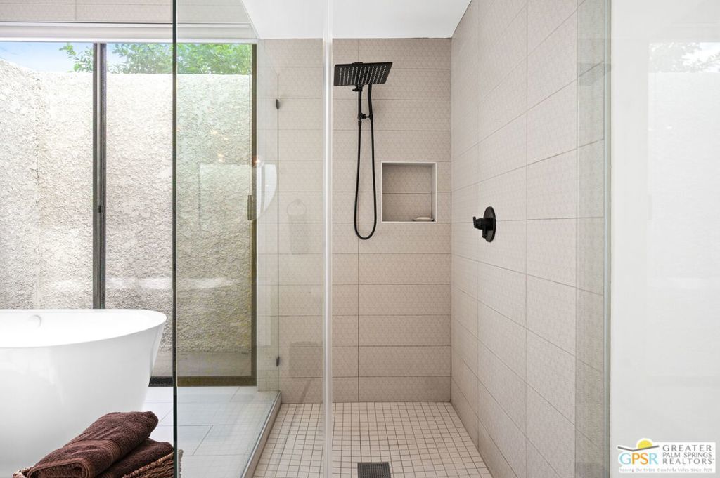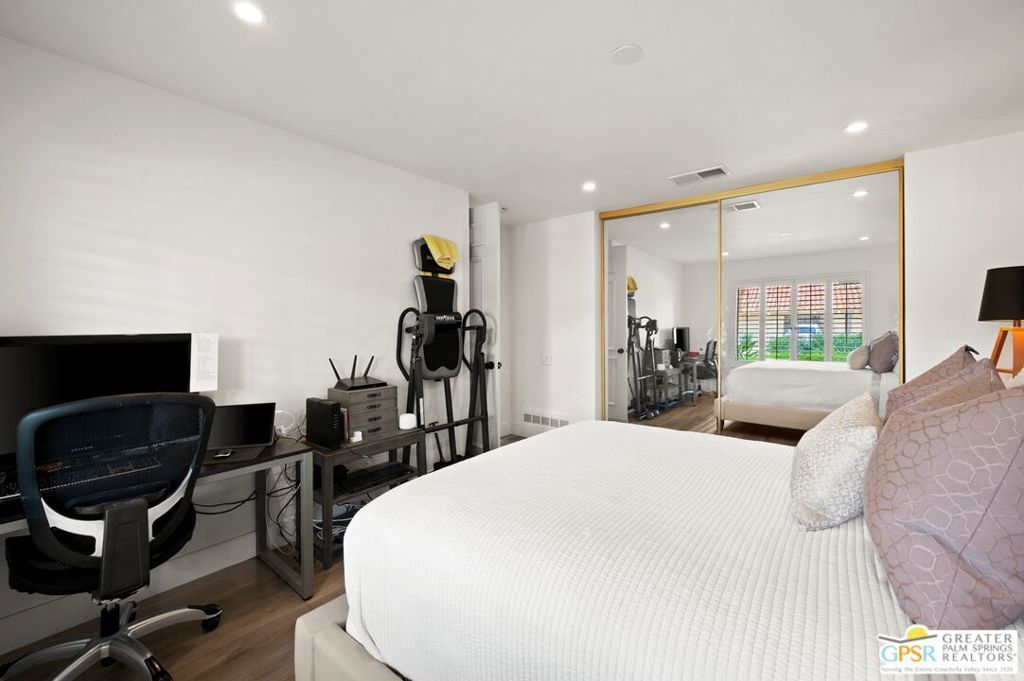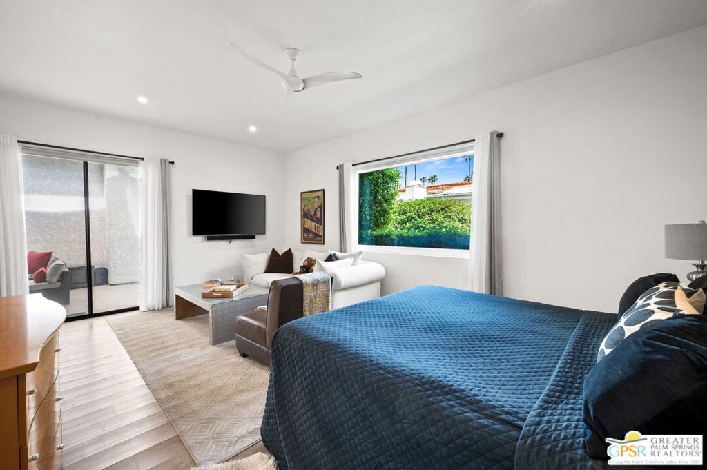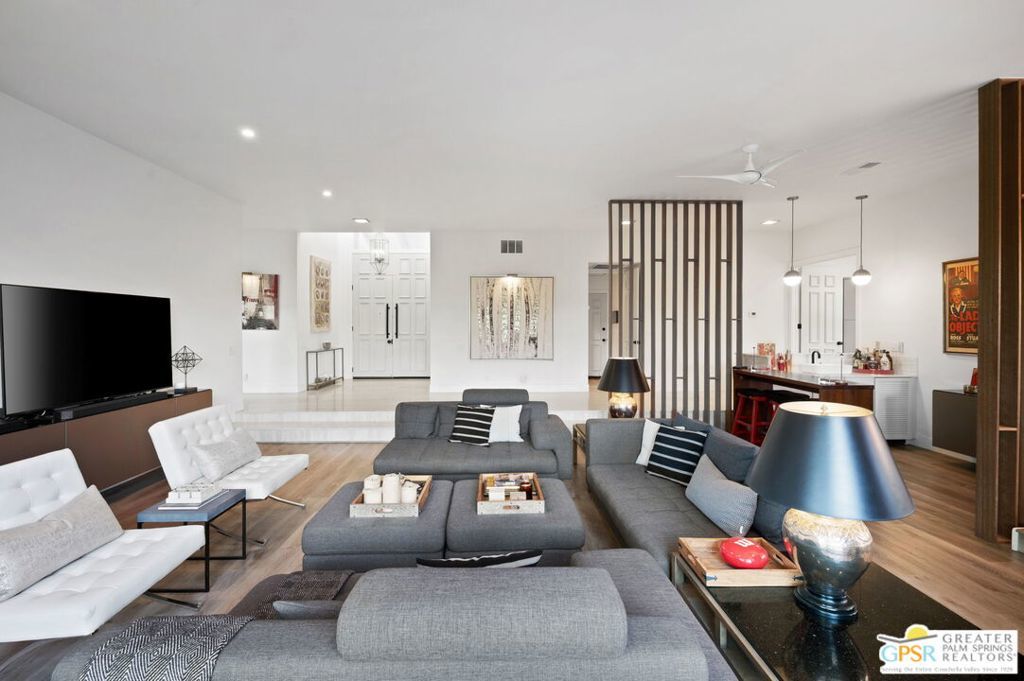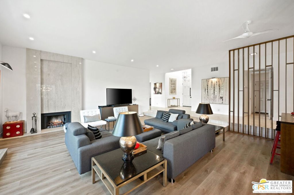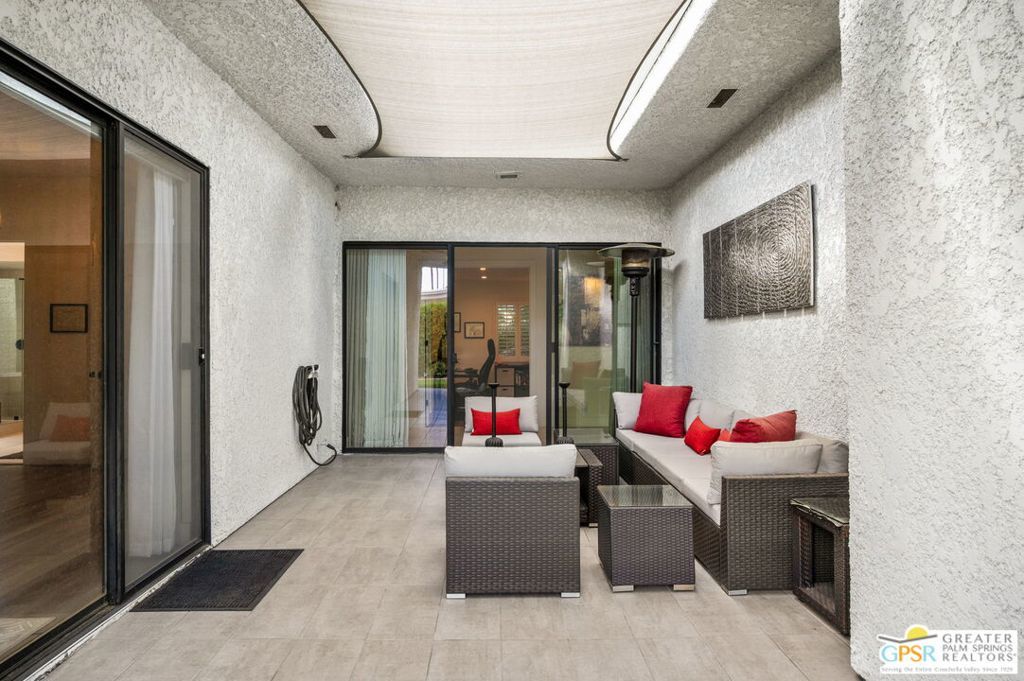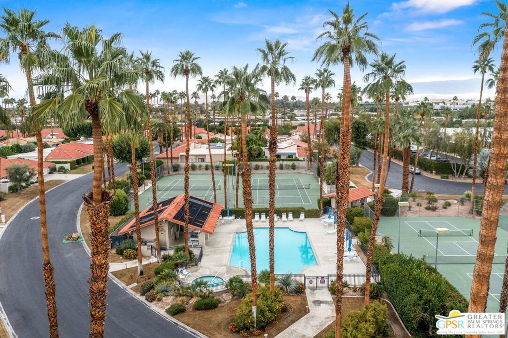 Welcome to Country Club Estates, a gated enclave of only 100 homes located in central Rancho Mirage. This expansive remodeled single family home with 3 bedrooms, 3 bathrooms plus a den/office and a 3 car garage blends seamlessly indoor/outdoor living with an elegant, spacious feel. Upon entering the gated courtyard, you are drawn into the foyer and beyond into the large living, dining, and wet-bar areas, all framed by sliding doors that lead to the multiple tiled outdoor patio spaces. The chef's kitchen features stainless steel appliances and a large quartz-clad center island. All bedrooms are located down an oversized travertine walkway, complete with wired-in picture lights. The primary suite has direct access to a tiled atrium, filling the room with natural light and views of the manicured lawn and mature trees. The home includes a whole-house owned solar system. Resort-style amenities include tennis, pickleball, pool and spa, all just steps away from the house. Why aren't you living here yet?