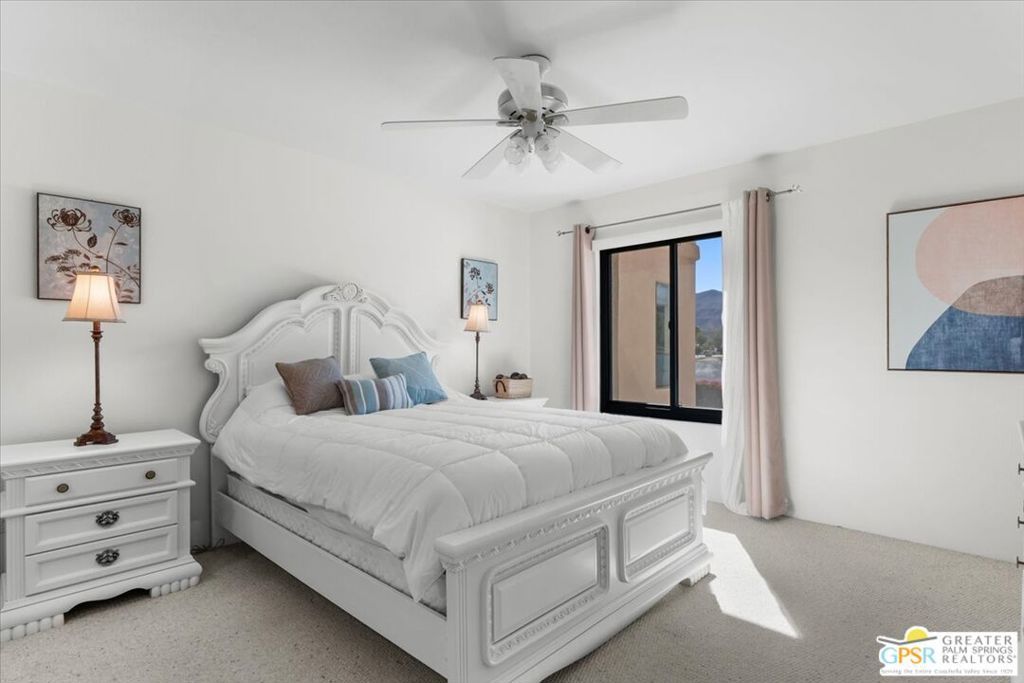 Welcome to this beautifully maintained upper-level condo in the sought-after community of Canyon Shores. Featuring two bedrooms and two baths, this fully furnished residence offers a serene retreat surrounded by the natural beauty of the desert. Step inside to find updated triple pane windows and sliding glass doors, along with comfortable furnishings that make this home truly move-in ready. Enjoy incredible views from the front entry and west-facing bedrooms, where sweeping vistas of the majestic San Jacinto Mountains create a stunning backdrop. From your private patio, take in the tranquil water feature and the lush, landscaped greenbelt that embodies the Coachella Valley lifestyle.Canyon Shores offers an exceptional array of amenities including multiple pools and spas, pickleball and tennis courts, a fitness center, and more creating a resort-like atmosphere that invites both relaxation and recreation. The HOA covers water, trash, ground maintenance, and new community roofing installed in 2025 providing convenience and peace of mind for carefree living. Ideally situated between Palm Springs and Palm Desert, Cathedral City offers effortless access to shopping, dining, golf, and entertainment throughout the valley, as well as easy access to the CV Link. Whether as a full-time home or a tranquil getaway, this inviting desert haven captures the perfect blend of comfort, location, and leisure.