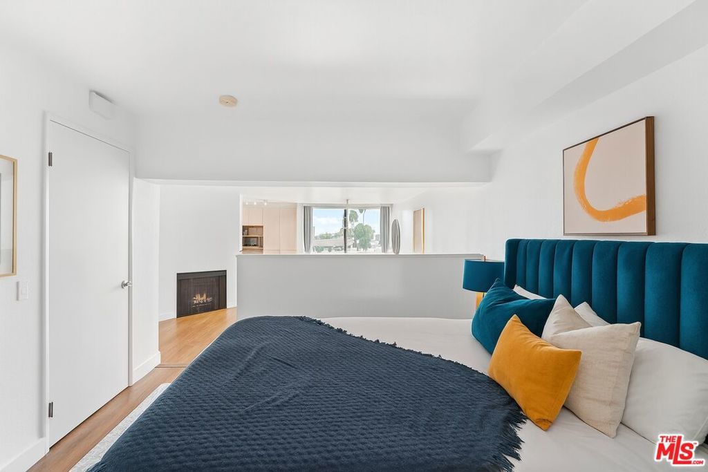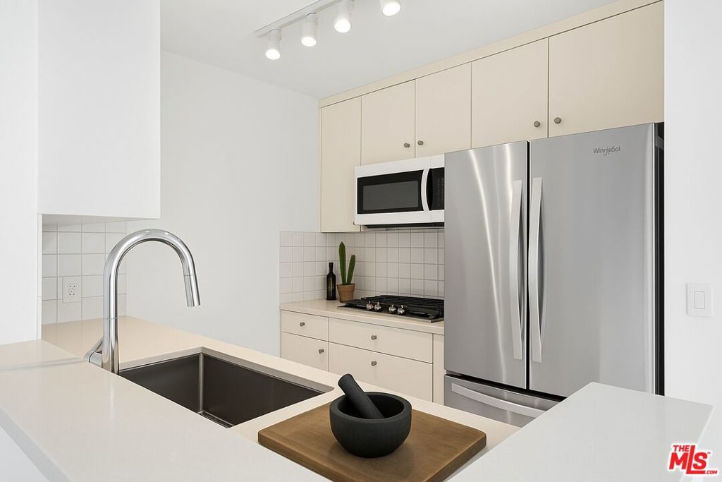 Classy and Fully updated sleek Condo in Hollywood! Perfectly located in the heart of Hollywood/Sunset Strip at the Hollywood Regis building, this FULLY RENOVATED JNR/1BA home is fully equipped for easy and comfortable living. Step inside to find an open floor plan with premium finishes, fabulous natural light, stunning hardwood floors, a designer color scheme, and a spacious living room. Entertain guests and mix drinks in the open concept kitchen featuring quartz countertops, stainless-steel appliances, dishwasher, sleek ample white cabinetry, gas cook-top, built-in microwave, track lighting, and an adjacent dining room with double glass soundproof sliding glass doors to the spacious balcony. Sit on the balcony and sip cocktails with friends while admiring the fabulous views of downtown Los Angeles. Discover relaxing evenings in the NYC loft style bedroom, which has a large walk-in closet with your own washer and dryer, Separate bathroom w/storage vanity and a shower/tub combo and separate vanity area. For a fit lifestyle, enjoy the community amenities of a sparkling heated swimming pool, hot tub, sun deck w/cabanas, and a fitness ceneter! Other features: 1-covered and secured parking space, onsite management, security fob on all entries, close to Runyon Canyon, shopping, chic restaurants, the Hollywood Bowl and more! Easy living LA style, the perfect pied- a -terre, first home or LA city pad, this little gem is a must see!