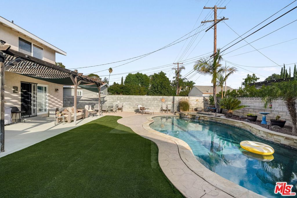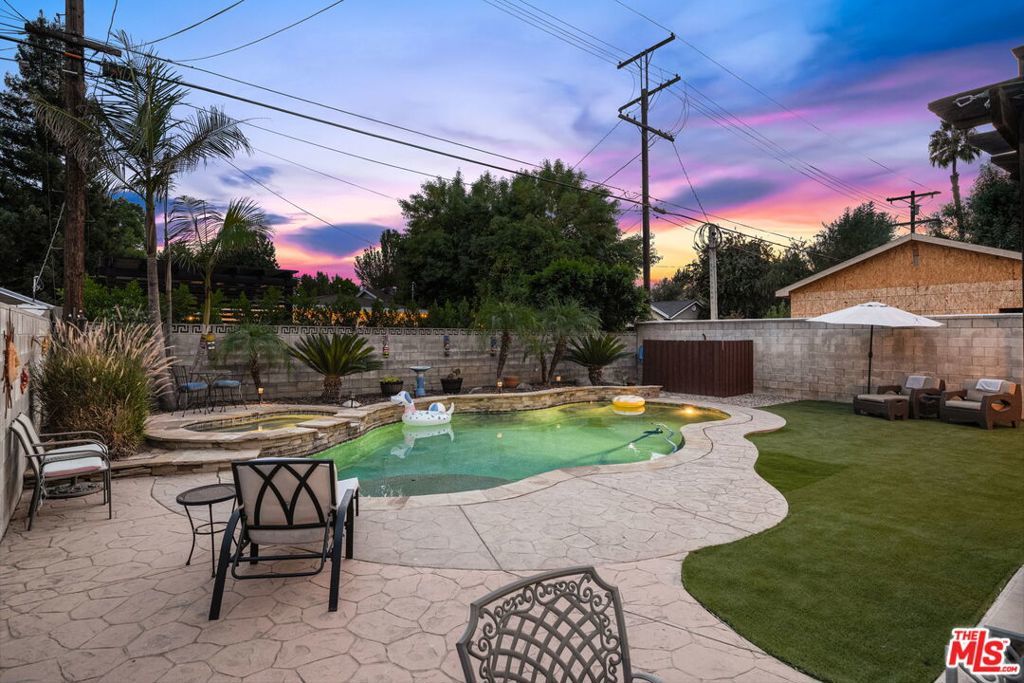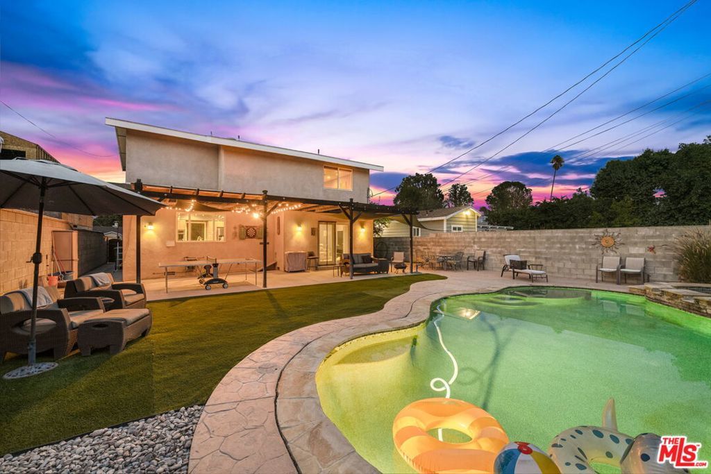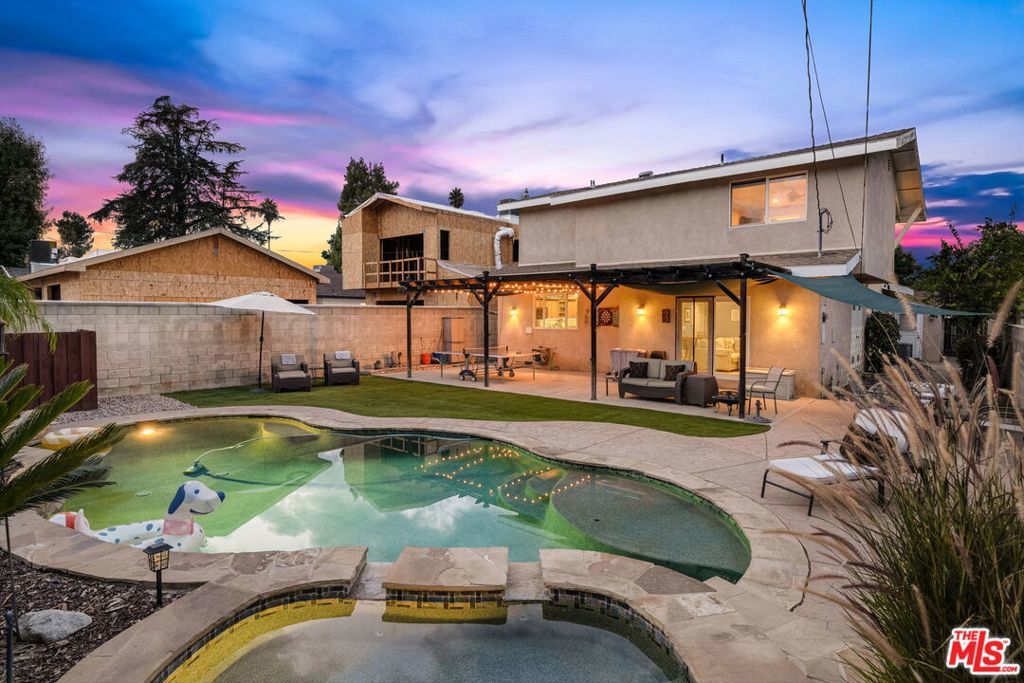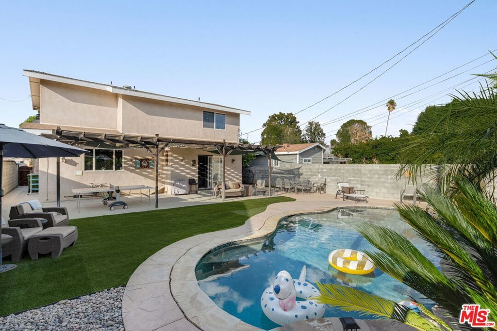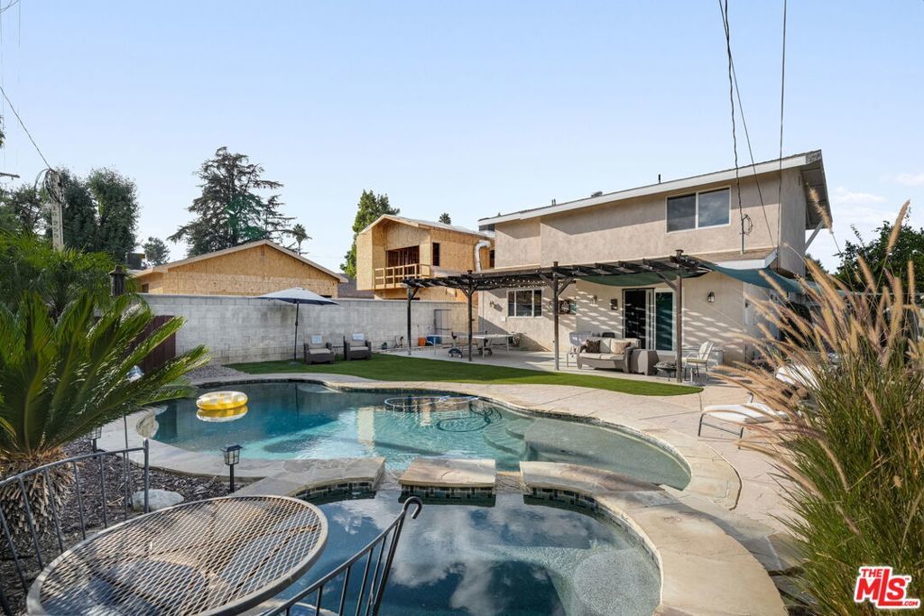 First time on the market in over 30 years, this beautifully maintained 3-bedroom, 2-bathroom home is ideally located in prime Woodland Hills on a large lot just north of Ventura Boulevard. Step inside to soaring ceilings, a bright living room with a great fireplace, an elegant grand staircase, and windows that fill the space with natural light. The spacious kitchen, complete with abundant cabinetry and stainless steel appliances, is a chef's delight and opens directly to the expansive backyard perfect for al fresco dining, entertaining under the stars, or hosting unforgettable pool parties. The home's comfortable layout features two generously sized bedrooms with ample closet space on the main level, while the entire upstairs is dedicated to a private primary suite retreat. This sanctuary includes a large walk-in closet, an oversized en suite bathroom with jetted tub and walk-in shower, and a separate versatile den that can serve as an office, lounge, or easily be converted into a fourth bedroom. Outside, enjoy your own private oasis with a Pebble Tec pool featuring a Baja shelf, and a separate attached spa with waterfall, all surrounded by drought-tolerant landscaping that provides year-round beauty with minimal upkeep. Move-in ready yet full of potential, this home offers the perfect opportunity to upgrade, add equity, and create your dream space. Ideally situated near Ventura Boulevard, Topanga Westfield, the upcoming Ram's Village (get into the neighborhood while you can!), fine dining, and more, this rare offering captures the best of the California lifestyle in one of the Valley's most sought-after neighborhoods.