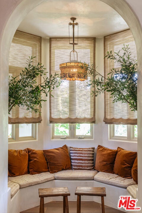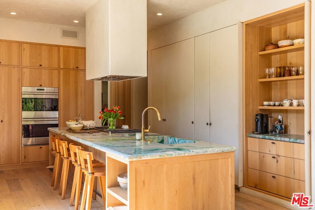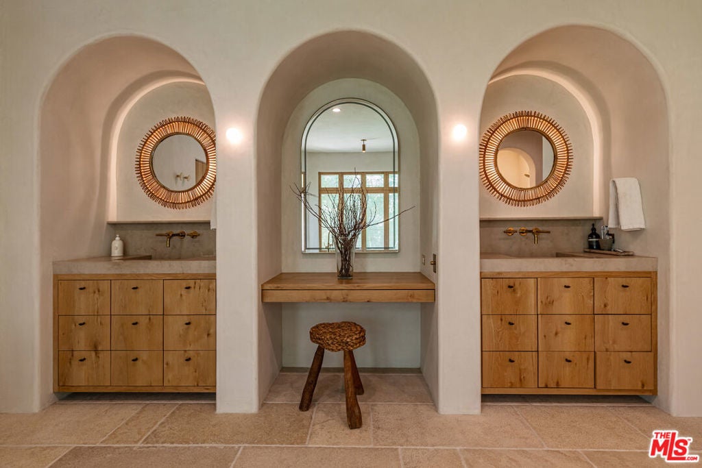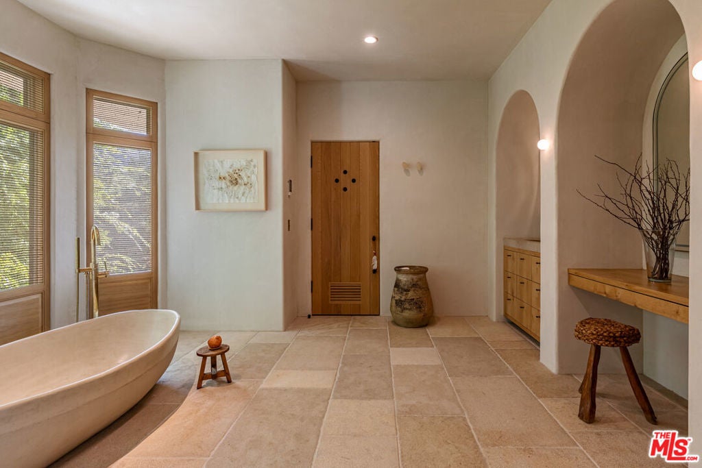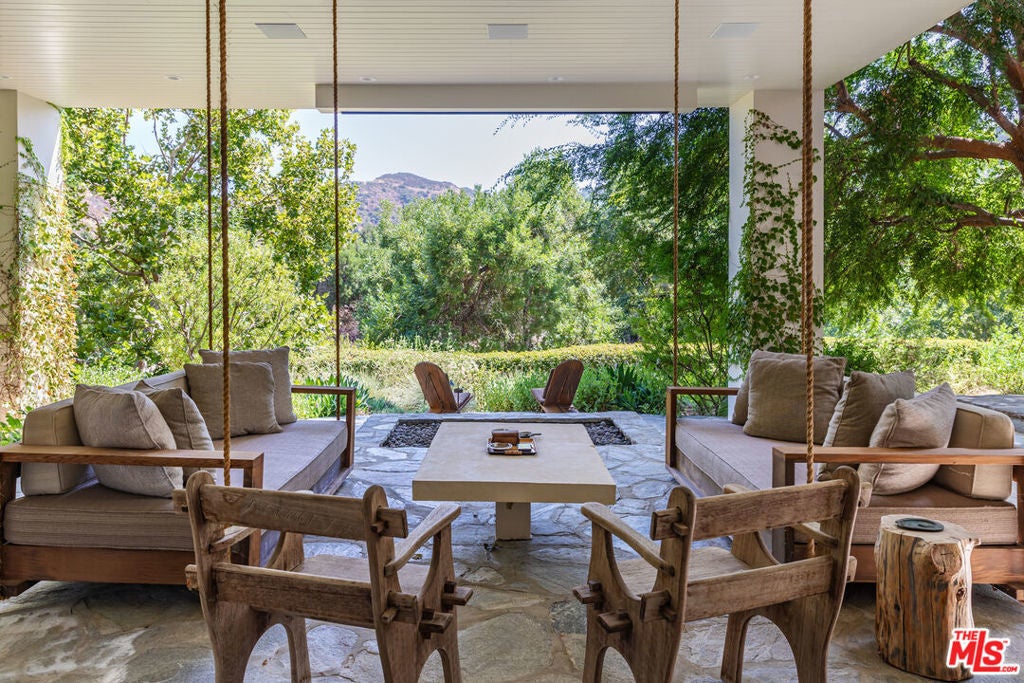 Welcome to this architectural digest featured home in the West Valley. This luxurious 5-bedroom, 7-bathroom estate spans 6,830 square feet, blending modern rustic sophistication with natural tranquility. Designed by renowned designer Jake Arnold, the home features a transitional minimalist Mediterranean style that harmonizes classic elegance with contemporary amenities. Nestled at the end of a private cul-de-sac, this double-gated estate offers unparalleled privacy and is surrounded by breathtaking mountain views. Adding to its appeal, the property is nestled in a hollow, which protects it from Santa Ana winds and also provides peace of mind with an LAFD helipad conveniently located on the hilltop for quick access in emergencies. As you step inside, you're greeted by high ceilings, a striking plaster spiral staircase, and open spaces filled with natural light. The gourmet kitchen boasts state-of-the-art appliances, unique stunning marbles, custom cabinetry, and a large island for culinary creations, seamlessly connecting to an elegant dining area for both intimate dinners and larger gatherings. The main level features natural wood flooring and neutral-toned walls, creating a cohesive flow throughout the living spaces. Each room is thoughtfully designed for luxury and functionality, ideal for entertaining or relaxing with family. The home features cleverly concealed shelves, closets, and TVs that seamlessly blend into the serene and cohesive design. The primary suite is a serene sanctuary, where floor-to-ceiling glass doors open to a private deck boasting breathtaking, unobstructed views of untouched landscapes, with not a single home in sight. Inside, a cozy seating area invites relaxation, while the spa-like en-suite bathroom draws inspiration from the timeless elegance of Santa Maria Monastero on Italy's Amalfi Coast. This luxurious retreat features a Belgian soaking tub, a spacious walk-in plaster shower, and dual vanities, blending sophistication with tranquility. Outdoors, the property impresses with amazing flat grounds and exceptional water-wise landscaping. The gorgeous pool and spa are surrounded by lush greenery and seemingly endless olive trees for an Italian villa feel, with multiple entertaining areas, including a deck and gardens for al fresco dining. Located just 100 yards from Topanga trails and only a mile from an emergency room and a 24-hour veterinary clinic, this estate combines luxury with convenience. Additionally, the property includes a continuous lot that offers endless potential--it can be developed into a guest house, studio, or additional living space, providing even more possibilities for this stunning estate. This peaceful oasis offers stunning views of the surrounding landscape, making it the perfect retreat.