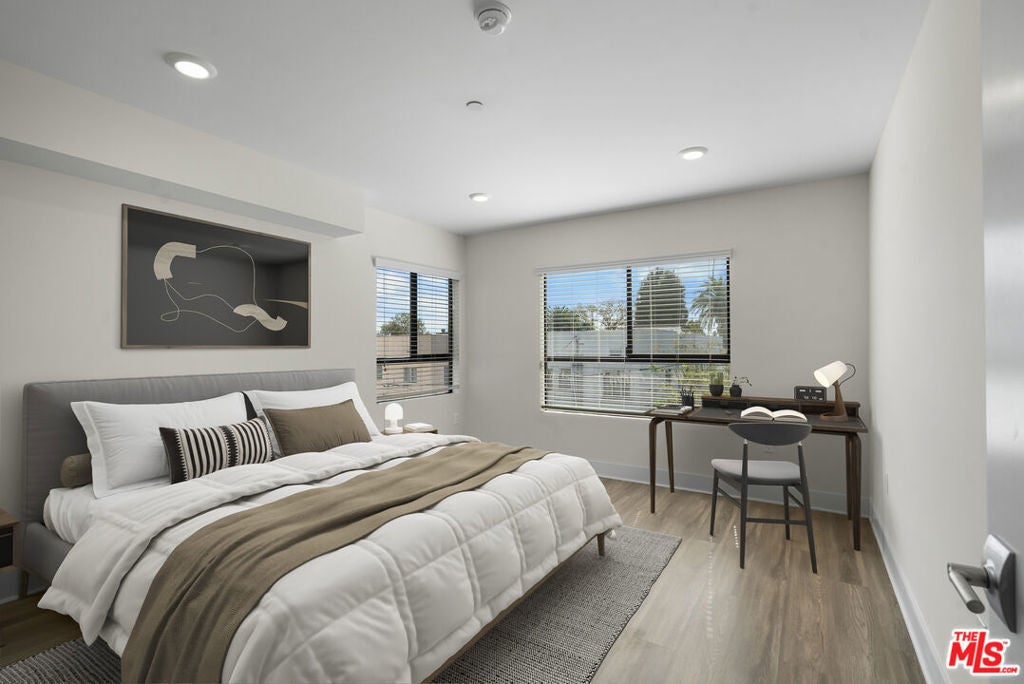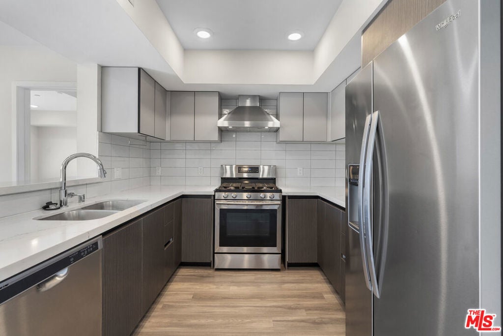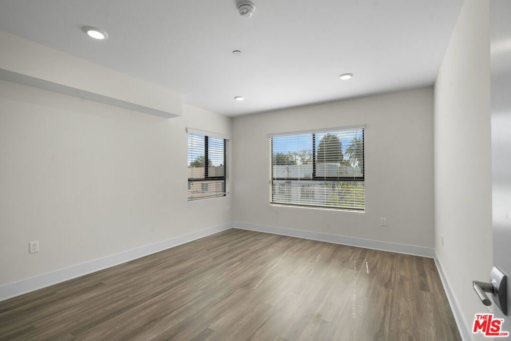 Corner penthouse unit! Top floor unit featuring 2 bedroom and 2 full bathrooms. Spacious floorplan with separated bedrooms great for roommates or for having both a primary bedroom and guest bedroom/office. Modern concept kitchen features stainless steel appliances, Caesarstone countertop and glass tile backsplashes. Recessed lighting, beautiful flooring, and a walk-in closet. Washer/dryer in unit. Two tandem parking spaces in a secure gated garage. Small pets allowed. Centrally located and convenient to Robert Burns Park, Larchmont Village, Hollywood, and Koreatown. Some photos are virtually staged.