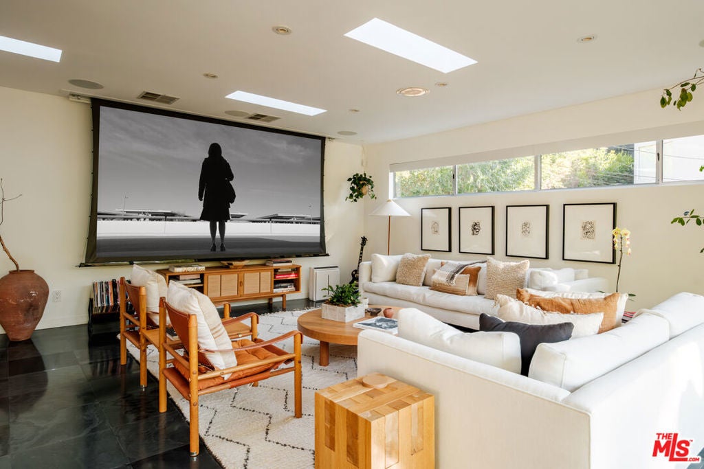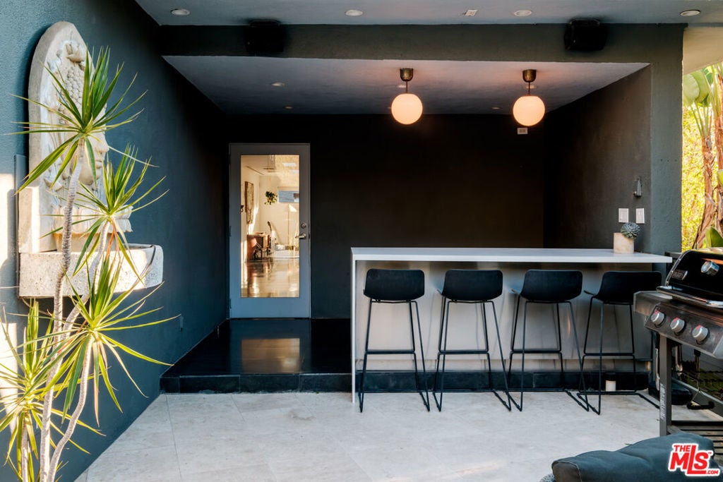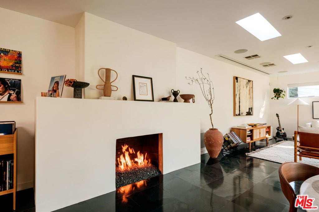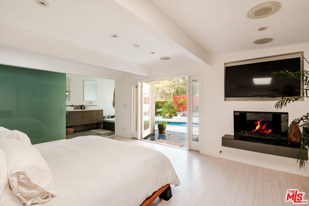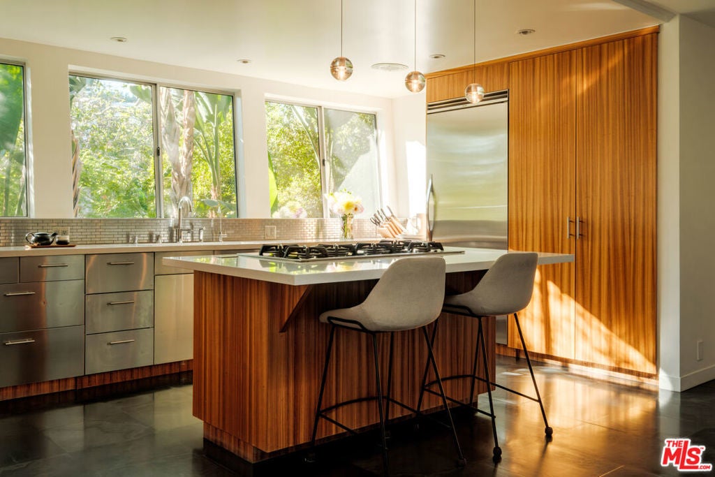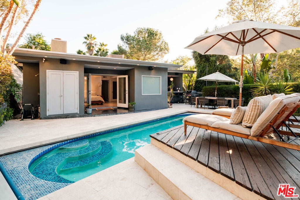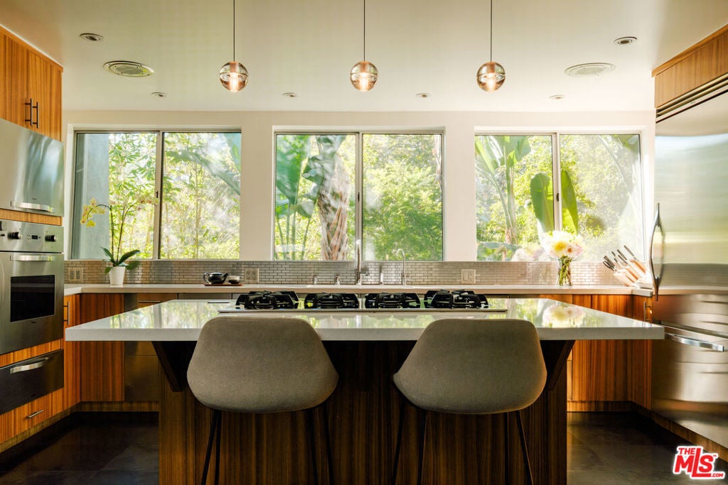 Perched above iconic Laurel Canyon and just moments from the Sunset Strip, this luminous mid-century modern flows effortlessly indoors and out for ultimate Hollywood Hills living. A chef's Viking kitchen with custom cabinetry and a bold island opens to a glass-walled living room crowned by nine skylights and a dramatic fireplace. Natural stone and wood floors lead to three bedrooms and two luxe baths, including a sun drenched primary suite that boasts a walk-in closet, spa bath, fireplace, and French doors opening to the resort-style outdoor living space. Saltwater pool, fountains, fire-pit, bar, outdoor shower, and multiple lounge/dining areas set the scene. The garage has been transformed into a sleek 300 SF art studio. The driveway and a private street space offer parking for 5 cars. Perfectly blending privacy and proximity, this elevated retreat offers an ideal balance of tranquility and city convenience. Whether entertaining beneath the stars or enjoying quiet mornings with canyon views, every moment here feels distinctly cinematic. Thoughtfully updated, yet true to its mid-century roots, this home captures the essence of Southern California living -- bright, open, and effortlessly sophisticated.
