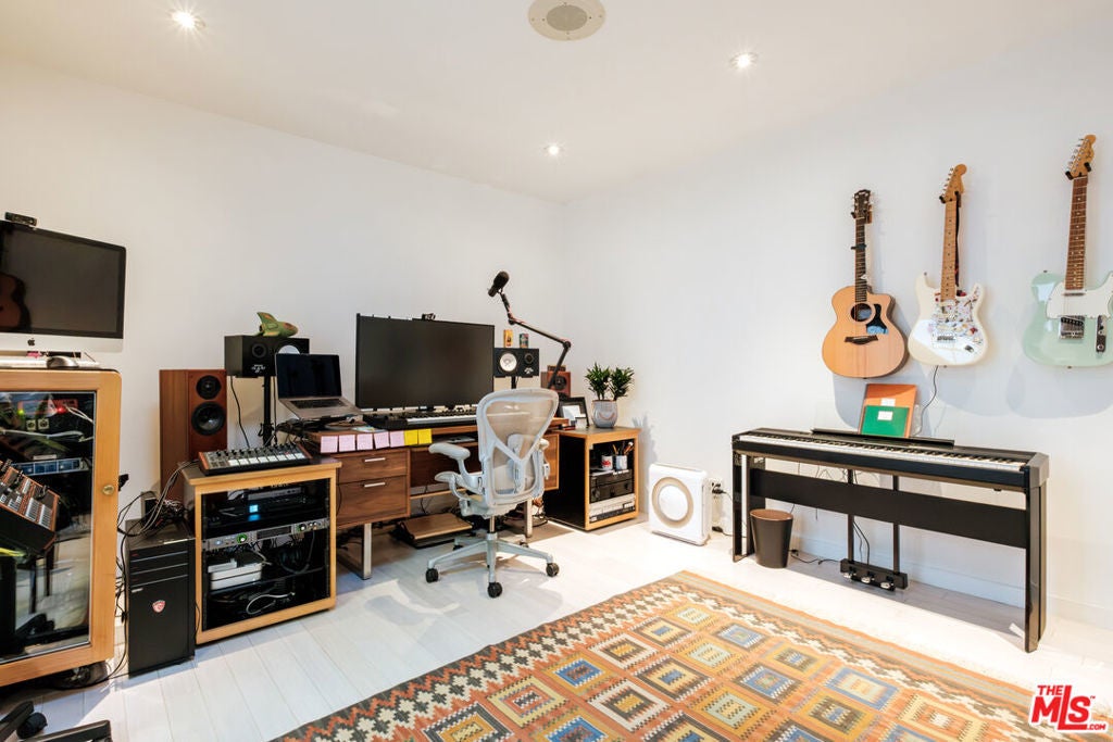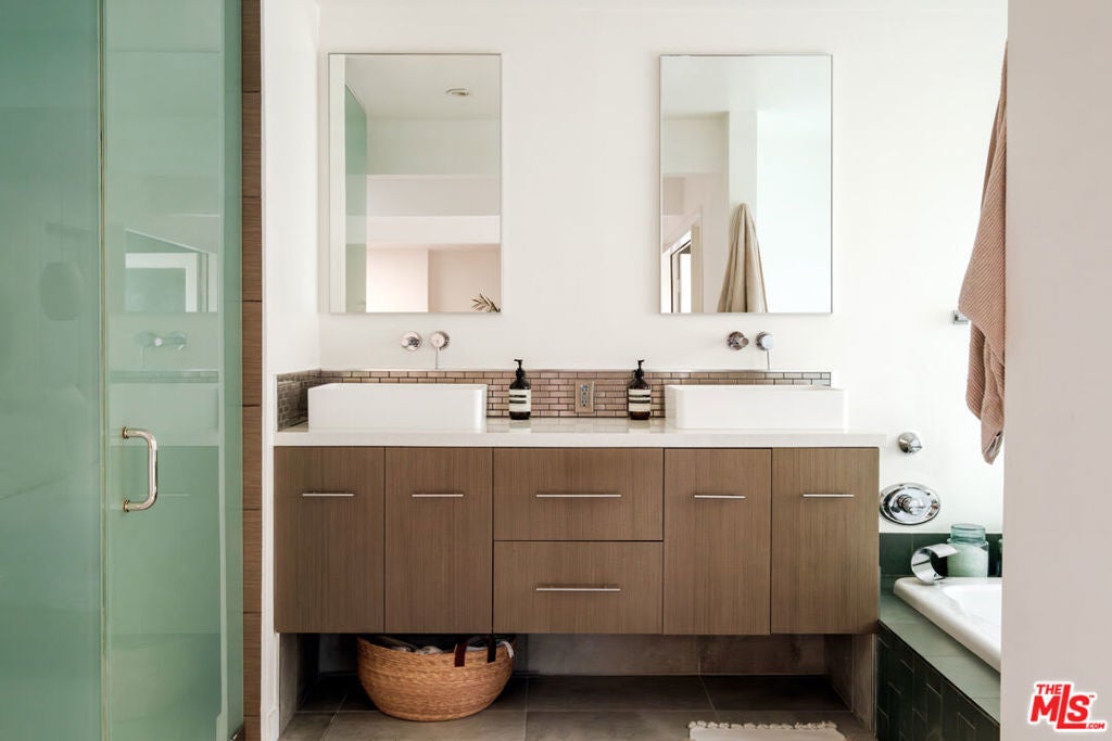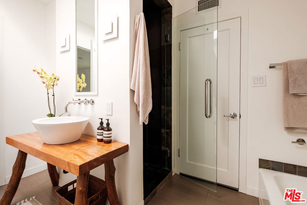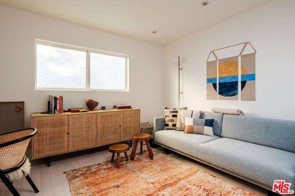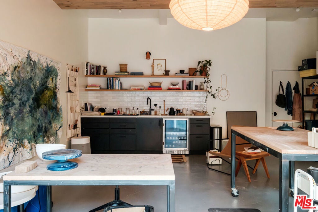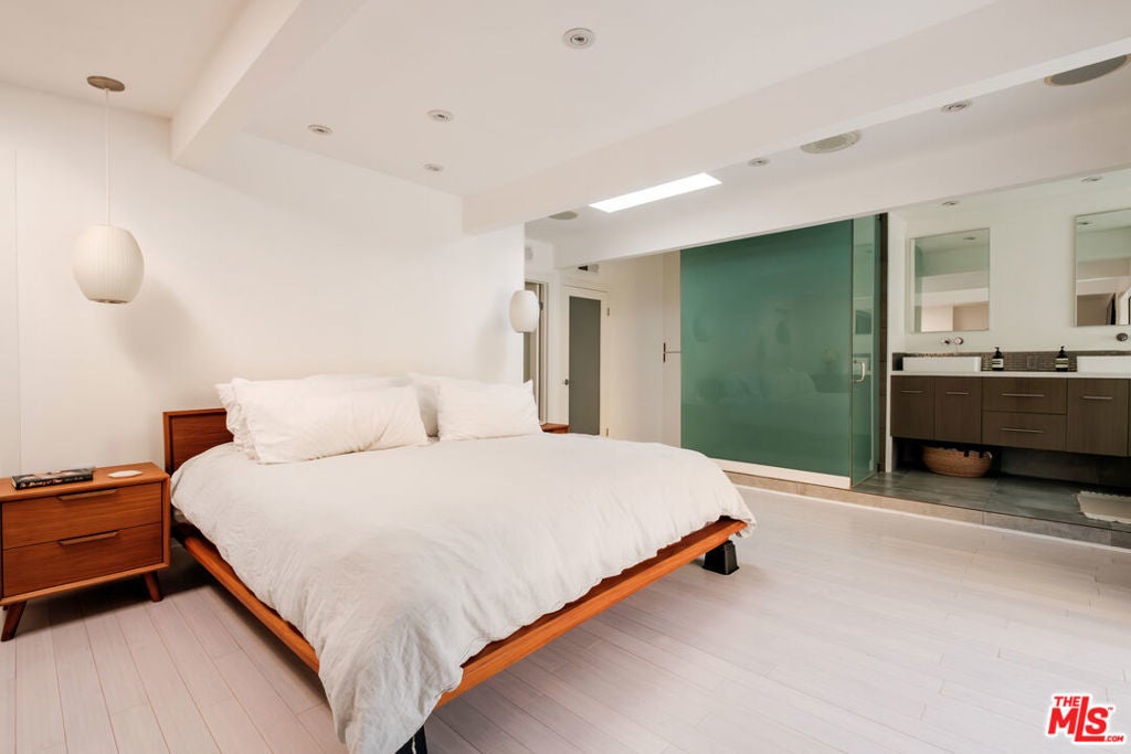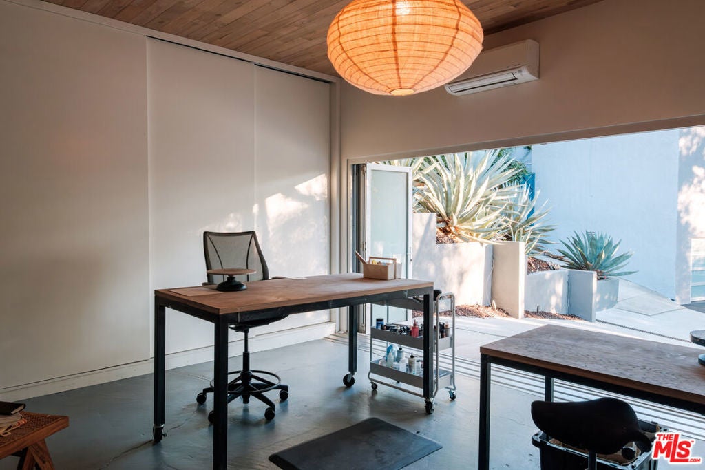 Perched above iconic Laurel Canyon and just moments from the Sunset Strip, this luminous mid-century modern flows effortlessly indoors and out for ultimate Hollywood Hills living. A chef's Viking kitchen with custom cabinetry and a bold island opens to a glass-walled living room crowned by nine skylights and a dramatic fireplace. Natural stone and wood floors lead to three bedrooms and two luxe baths, including a sun drenched primary suite that boasts a walk-in closet, spa bath, fireplace, and French doors opening to the resort-style outdoor living space. Saltwater pool, fountains, fire-pit, bar, outdoor shower, and multiple lounge/dining areas set the scene. The garage has been transformed into a sleek 300 SF art studio. The driveway and a private street space offer parking for 5 cars. Perfectly blending privacy and proximity, this elevated retreat offers an ideal balance of tranquility and city convenience. Whether entertaining beneath the stars or enjoying quiet mornings with canyon views, every moment here feels distinctly cinematic. Thoughtfully updated, yet true to its mid-century roots, this home captures the essence of Southern California living -- bright, open, and effortlessly sophisticated.