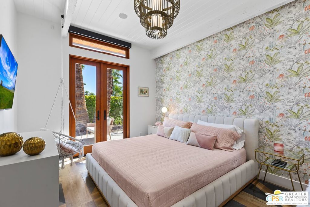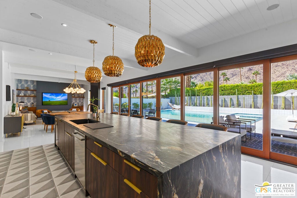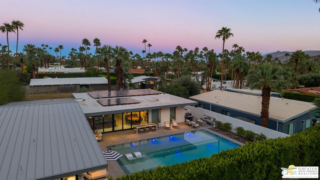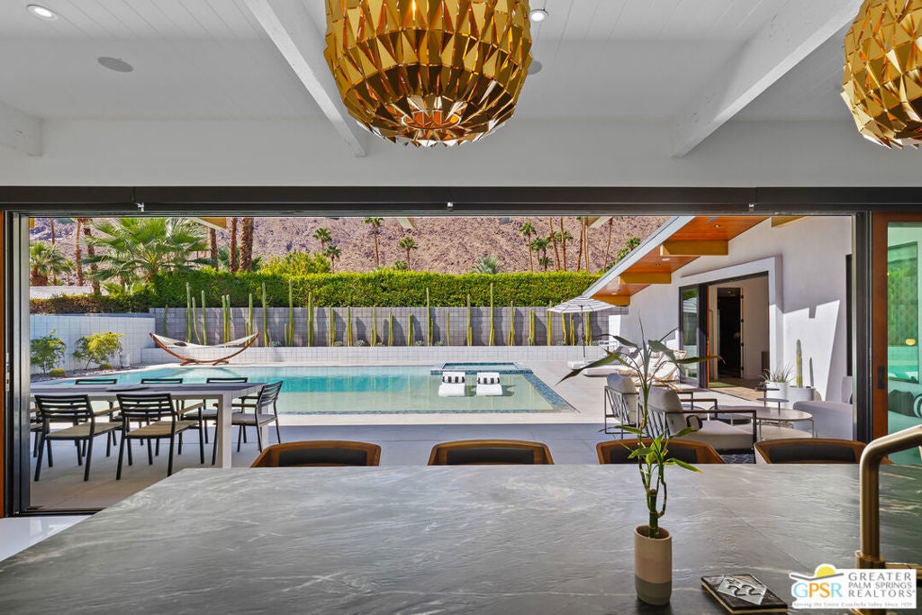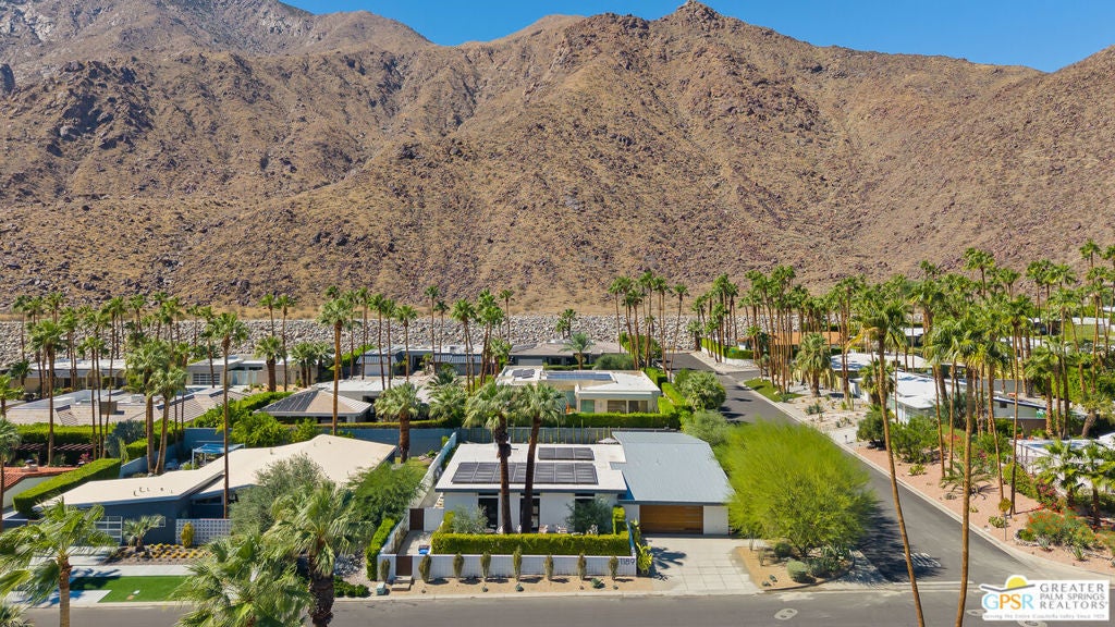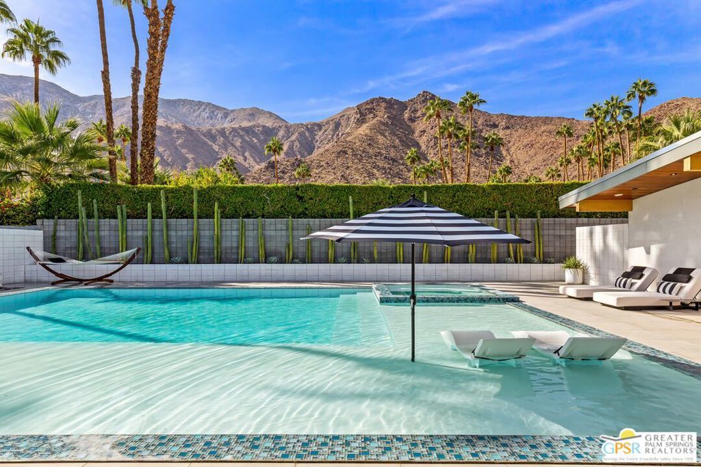 A rare blend of provenance and polish, this is classic Palm Springs style elevated. An original 1961 Alexander Company home, extensively renovated and reimagined. Authentic, clean mid-century lines honor its true architectural history. The floor-to-ceiling glass with a bright open layout showcases the spectacular, south and west facing mountain views from the main living areas. Timeless architecture meets modern comfort, featuring crisp finishes and a seamless indoor-outdoor flow that is ideal for desert living. Step inside to discover a beautifully appointed interior featuring stone and tile floors, illuminated by elegant chandeliers and recessed lighting. The expansive floor plan includes 4 bedrooms and 4.5 bathrooms. Three bedrooms are ensuite with walk-in showers and elevated finishes. The property features a chef's kitchen with Walnut cabinetry and high-end appliances. The large honed island anchors the kitchen and is perfectly located for indoor and outdoor living through the large stacking exterior doors. The smart home features will make everything a breeze with automatic blackout shades and integrated audio, lighting, and multi-zoned AC. Having owned solar panels with new doors and windows helps create a comfortable and efficient home. Outside, the private yard has large protective wood-clad overhangs complete with a 4-sided saltwater infinity pool with a heating and cooling system, an elevated spa, and a large tanning shelf. Enjoy evenings by the fire pit or relax on the private patios with mature landscaping. Patios off each bedroom are the perfect private places for family or guests to unwind and take in the views. This Modernism Week show home is a rare gem in one of the most coveted neighborhoods of Palm Springs.