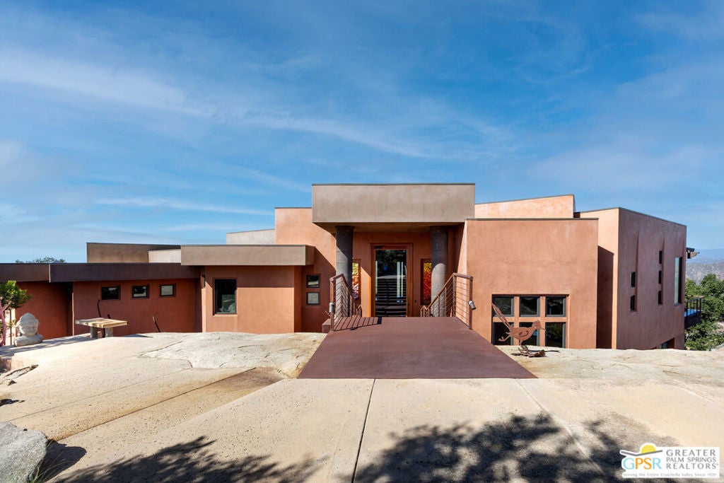 A very private ,custom built modern eclectic estate is more than a home, it is a testament to resilience, artistry, and the enduring connection to the land. Perched high on 8.47 acres in Ramona's gated Highland Hill community, the residence offers panoramic, unobstructed views. The 5,016 sq. ft., 3-bedroom, 3.5-bathroom main home is a masterpiece of design and function. Thoughtful features include soaring ceilings, over 80 custom windows that frame ever-changing natural light. The chef's kitchen with large windows, and an adjacent outdoor dining area Appliances include Sub-Zero refrigeration, Wolf cooktop/ovens, and Fisher & Paykel dishwashers. A radiant heated marble island ,high-lacquer cabinetry , and pantry with dumbwaiter .The grand great room features radiant heated flooring throughout, a gorgeous fireplace, wet bar with radiant heated countertop, ice maker and beverage refrigerators . Open the large pocket sliding glass doors to a spacious patio to enjoy a beverage and the views. The large open dining area boasts a special lighting feature that creates a soft "curtain effect" for a more intimate dining experience. An elevator seamlessly connects the lower level, which houses the state of the art movie theater, dog spa, two guest en-suite bedrooms with private patios. Modern conveniences such as an office, "music space", bonus room (currently used for storage) , Sonos sound system, Lutron lighting, and Starlink connectivity are also present. The primary suite is a sanctuary with a fireplace, private balcony, double carved wood doors, a custom walk-in closet with a makeup vanity, and a spa-like en suite featuring a jacuzzi bathtub with panoramic views and a luxurious steam shower. Outdoors, one enters a long driveway to the private estate that delights with fully mature landscaping, walking paths, labyrinth, illuminated hedges, boulders, fruit trees, and an irrigation system that recycles rainwater , a raised herb garden with room for additional planting. A 3-car epoxy coated garage plus space for 20+ vehicles along the long driveway and a modular guest home with 3 bedrooms and 2 baths, gated back yard and views complete the property. Nestled in scenic North County San Diego's this property embodies eclectic modernism and artistic vision, integrating reclaimed materials, the memory of a beloved oak tree, and a design that transforms light, space, and view into living art. This is a rare opportunity to own a sanctuary of luxury, history, and unparalleled beauty in North County San Diego.