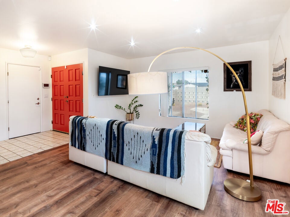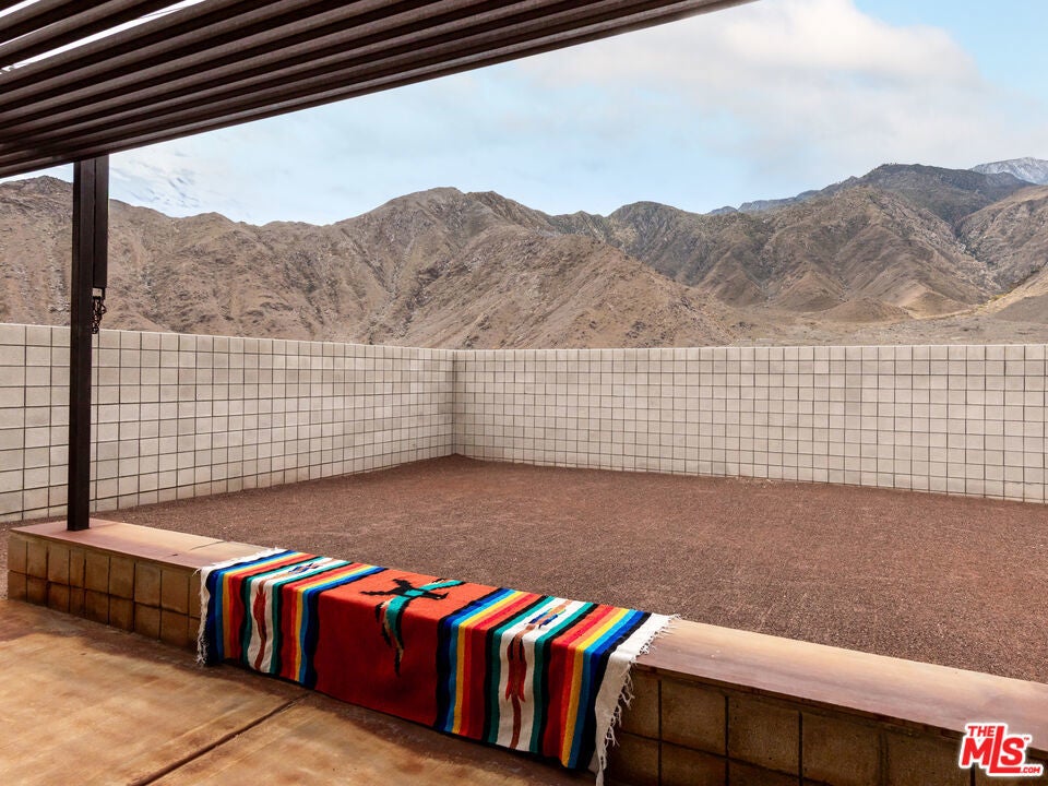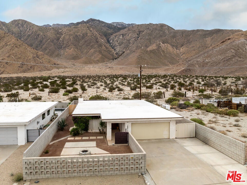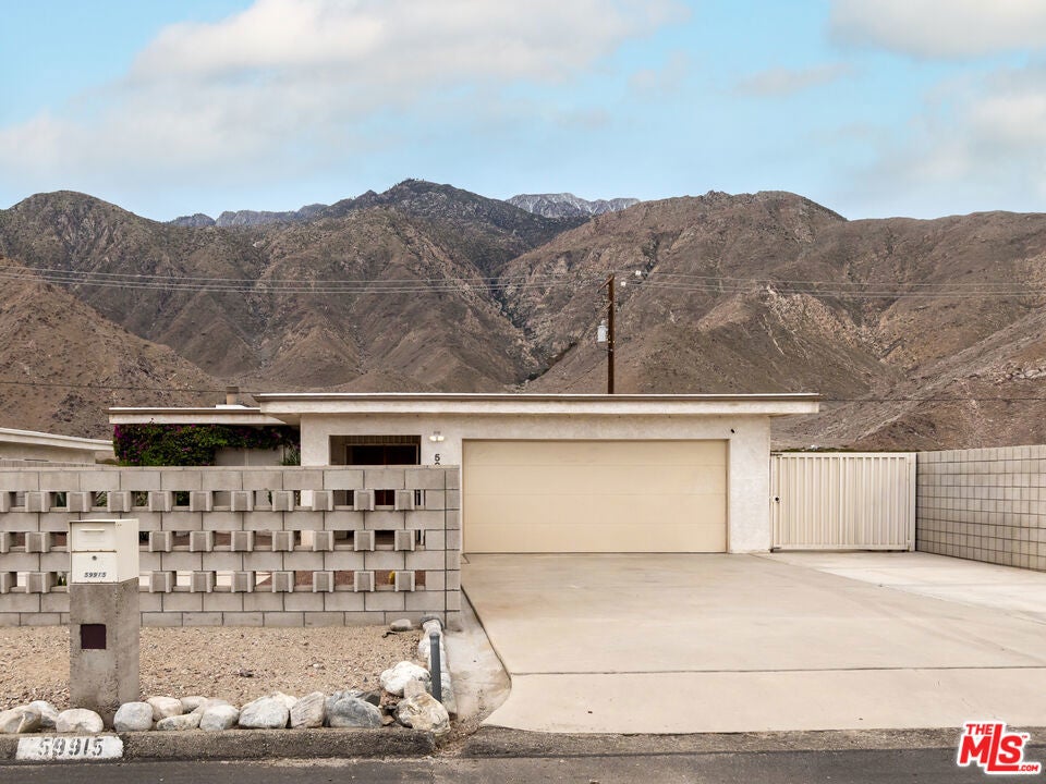 Located in the serene Windy Cove neighborhood of unincorporated Palm Springs, this home blends retro charm with thoughtful modern upgrades that celebrate its mid-century inspired architecture. Step through custom architectural metal gates and vintage double doors into an inviting open floor plan filled with natural light and uninterrupted views of the majestic San Jacinto mountain ridge. The living and dining rooms feature new high-quality hardwood panel flooring and a dramatic natural stone fireplace, the perfect centerpiece for cozy desert evenings. The efficient galley-style kitchen offers a large bar for casual dining, freshly repainted cabinetry, and updated fixtures that add a modern touch. The primary suite, showcasing beautiful mountain views, includes an en-suite bath with a vintage countertop and ample closet space. Two additional bedrooms offer generous closets, and the hall bath also featuring a vintage countertop provides easy access from the main living area. Every window throughout the home has been replaced with energy-efficient dual-pane glass and custom made sun/security shades for year-round comfort. Outdoor living is effortless with a fully enclosed front and back yard, covered patio, low-maintenance desert landscaping, and irrigation. The front breeze block patio provides privacy and style, complete with a gas fire pit ideal for stargazing on cool desert nights. Out back, under the shaded patio enjoy sunrises and sunsets that paint the sky, with wildlife often visible in the open field beyond. The two-car garage is a dream for organization lovers, featuring custom shelving, overhead storage, and an insulated door. Additional upgrades include recent roof resealing, all new light fixtures throughout, fresh interior paint, twice-yearly HVAC maintenance, vintage wallpaper accent in the laundry room with storage, gas indoor fireplace and outdoor gas grill for easy entertaining. Just 6 minutes from downtown Palm Springs, you'll enjoy the best of both worlds, peaceful desert living with quick access to shopping, dining, nightlife, and endless outdoor recreation. Listen to coyotes under the stars, spot riders on nearby horse trails, and experience the authentic desert lifestyle from the comfort of this thoughtfully updated mid-century inspired gem.