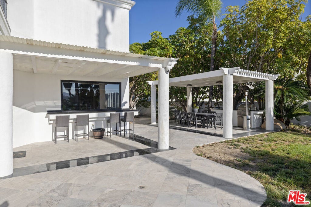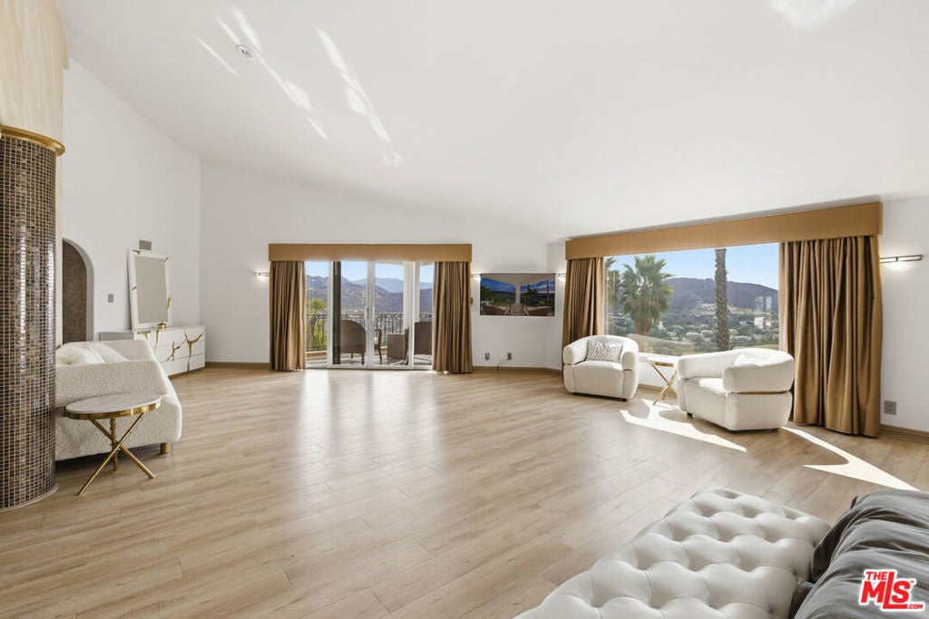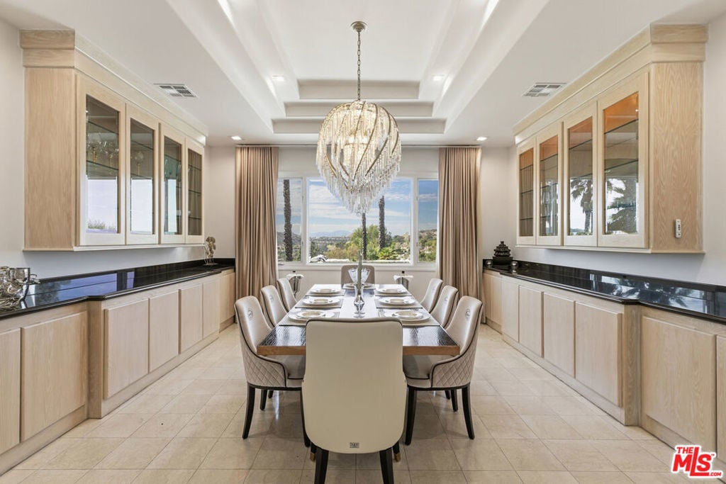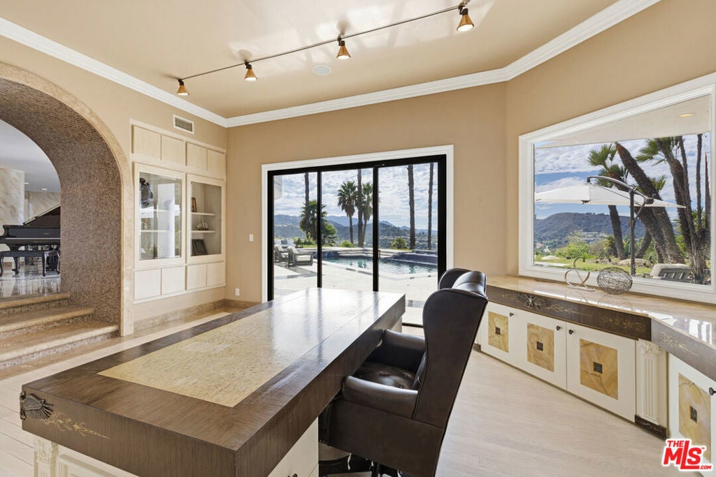 Welcome to the Pinnacle of Calabasas Living. Set high above the Calabasas Country Club in the prestigious guard-gated community of Vista Point, this custom-built showpiece offers a rare combination of scale, design, & presence. Spanning 10,452 square feet of refined living space plus a 1,725-square-foot showroom-style garage, this home is a true entertainer's dream a place where architecture & artistry meet panoramic perfection. From the moment you enter the grand foyer, soaring ceilings & marble floors set a tone of timeless sophistication. Expansive arched windows frame breathtaking, infinite views of sunsets, city lights, & rolling hills, creating a seamless connection between indoor luxury & outdoor beauty. The layout is designed for both grand entertaining and comfortable living, featuring 5 ensuite bedrooms - 3 with private sitting areas & balconies, private office with outdoor access & stunning views, home theater with its own patio, bar, & full bathroom; One of a kind game room with full bar, arched windows that soak in the views, formal dining room, living room, & family room all designed to capture natural light & panoramic vistas, gourmet kitchen with custom cabinetry, stonework, & expansive prep & dining area. The primary suite is a sanctuary unto itself complete with fireplace, private balcony, spa-inspired bath, steam shower, & walk-in closets. Outside, the resort-style grounds feature a sparkling pool with multiple fountains, a tranquil koi/ turtle pond, covered outdoor dining area with BBQ, & multiple spaces perfect for gathering or quiet reflection. Set on an 18,000+ sq. ft. lot at the end of a cul-de-sac, this estate offers privacy, serenity, & truly infinite views a daily front-row seat to the beauty of Calabasas sunsets. Some homes are designed to impress. This one is designed to inspire. Experience what true luxury feels like. Welcome home to Vista Pointe. Seller Financing Available.