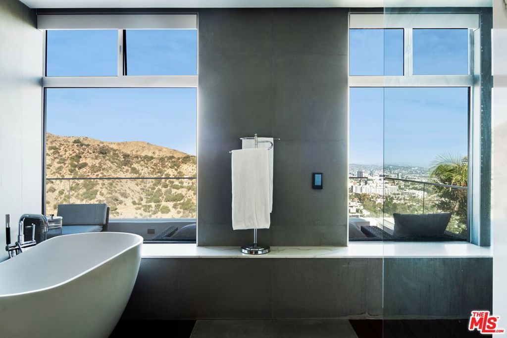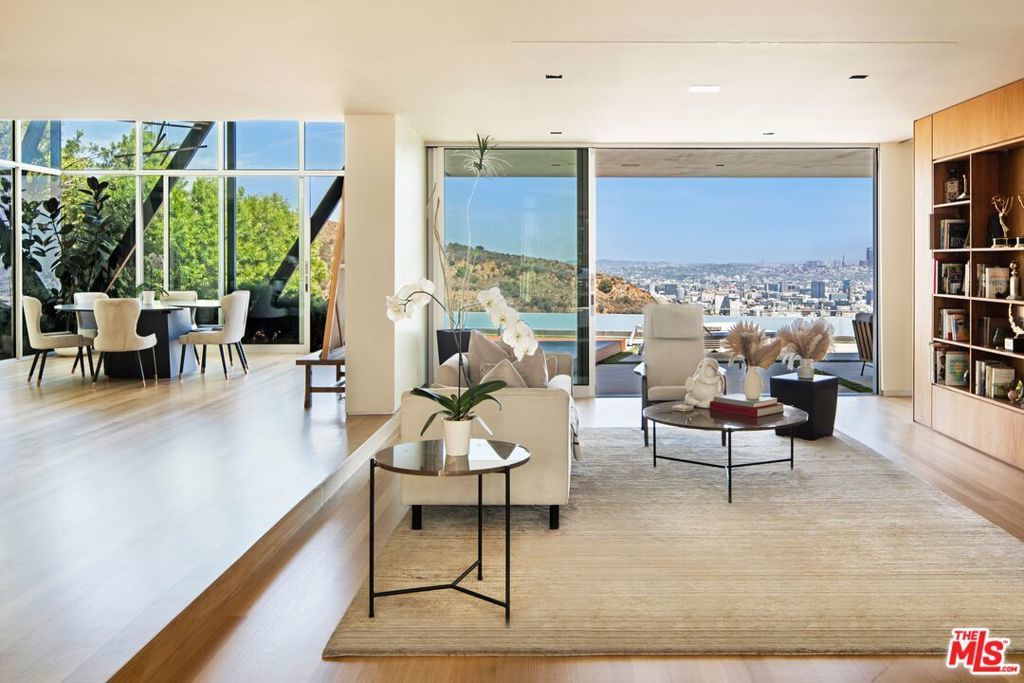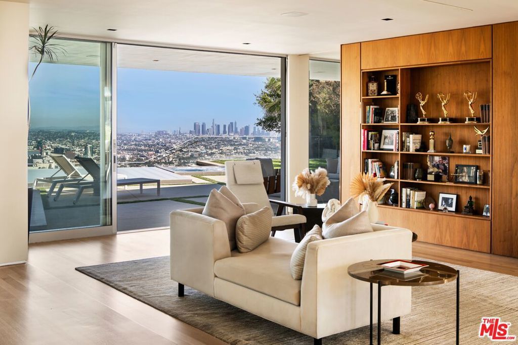 Behind gates on a rare flat lot in Mount Olympus, this private retreat captures unobstructed panoramic views that stretch from downtown Los Angeles to the ocean. A grand motor court welcomes you to a nearly 6,200 SF residence designed for elevated living and effortless entertaining. A soaring two-story glass conservatory, expansive living and dining rooms, and an open-concept kitchen with sliding glass doors invite seamless indoor-outdoor living while overlooking the skyline. The backyard is one of the few truly flat lots in the hills, featuring an infinity edge pool, spa, fire pit lounge, multiple patios, and a grassy lawn, all set against a world-class backdrop. The primary suite opens to its own private terrace with breathtaking views and includes a sitting area, spa-inspired bath, and custom walk-in closet. Three additional bedrooms and five bathrooms complete the spacious layout. Perfectly positioned above the legendary Sunset Strip and moments from West Hollywood, Beverly Hills, and Hollywood, this is a rare chance to own a private retreat that combines scale, privacy, and one of the most iconic views in Los Angeles. A lifestyle reserved for the few.