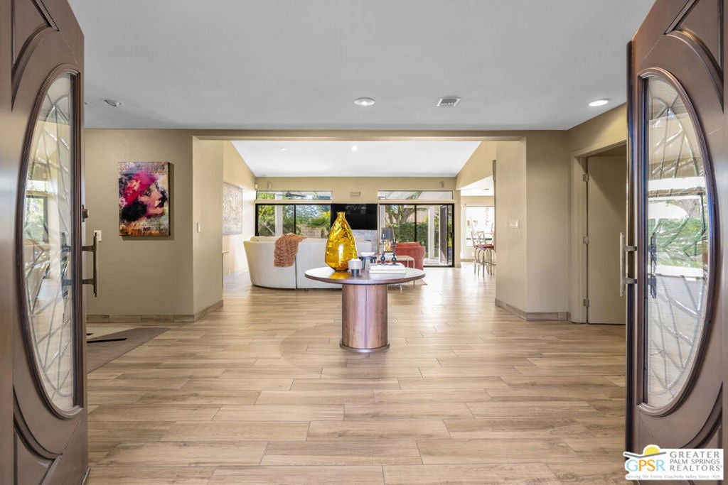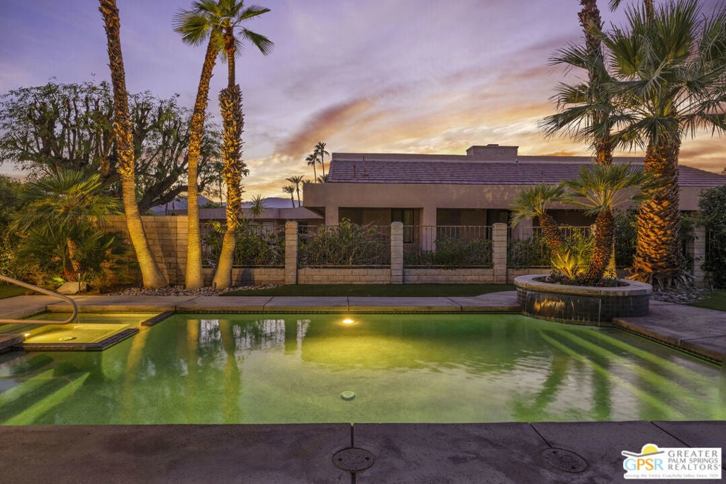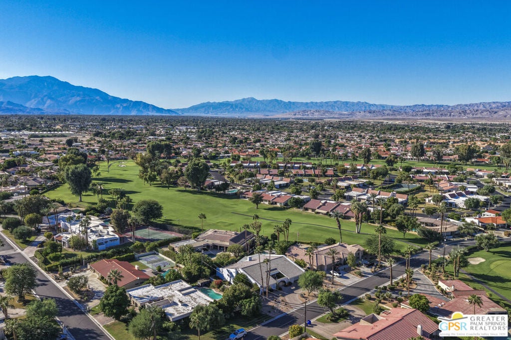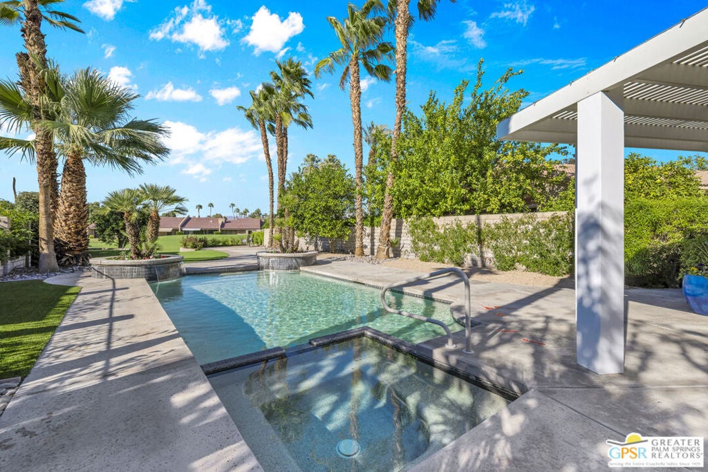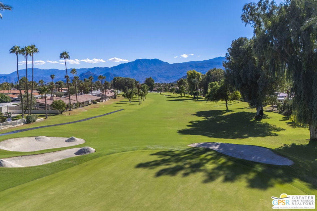 Your Fairway Oasis Awaits! Live the good life in this gorgeous custom golf course home nestled directly on the 15th Fairway of the prestigious Bermuda Dunes Country Club. From the moment you arrive, you'll be wowed by the magnificent curb appeal, the elegant circular driveway, and the private courtyard that sets the stage for entry through the grand double doors. This exceptional 4-bedroom, 4-bath residence spans just over 3,000 square feet and showcases countless high-end upgrades, including the complete remodeling of all four beautiful bathrooms. A True Entertainer's Paradise, the heart of the home is the Gourmet Kitchen, a culinary dream featuring a Sub-Zero fridge, a professional Viking range with a custom hood and pot-filler, a beverage fridge with a seamless cabinet panel, and a wine fridge. The show-stopping bar island, crafted with specialty custom Zebra and Black Walnut woods, makes this space a true Entertainer's Paradise. The multiple outdoor spaces extend your living area effortlessly. Grill masters will appreciate the built-in infrared BBQ island, while guests relax in the dining and sitting areas, shaded by extensive pergolas equipped with a cooling misting system and fans. Spend your days floating in the sparkling pool or unwinding in the integrated spa. As evening falls, prepare to witness the most incredible glow of the sun as it sets over the fairway and dips into the mountains every night. Retreat to the spacious Primary Suite, a sanctuary of comfort and style. It boasts a custom built bedroom set by interior designer Troy Zimmerman, a large spa-like bathroom with dual sinks, a separate vanity, a tiled walk-in shower, a radiant heated floor, a walk-in closet, and a tranquil Atrium garden. Situated on a massive lot, the mature landscaping includes fruiting trees and a rose garden. Practical features ensure peace of mind, including dual zone A/C (one zone replaced last year), new roof in 2021, and a two-car garage with an EV outlet plus a dedicated golf cart bay door. Take advantage of the numerous amenities, great dining, and social activities offered at Bermuda Dunes Country Club. Stop dreaming and start living. Your desert retreat awaits!
