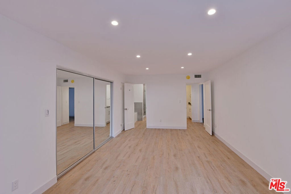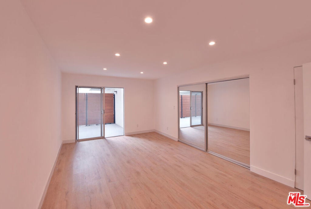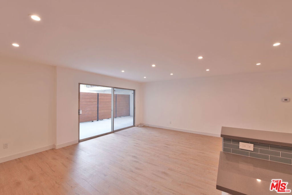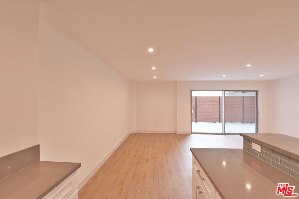 This modern 1 bedroom apartment features an open concept living area with wood style flooring, recessed lighting, and a beautifully updated kitchen with quartz countertops, sleek cabinetry, and a stylish glass tile backsplash. Large sliding doors lead to an oversized private patio, perfect for entertaining or relaxing outdoors. Freshly renovated and filled with natural light, this home offers a comfortable layout with contemporary finishes in a prime location.