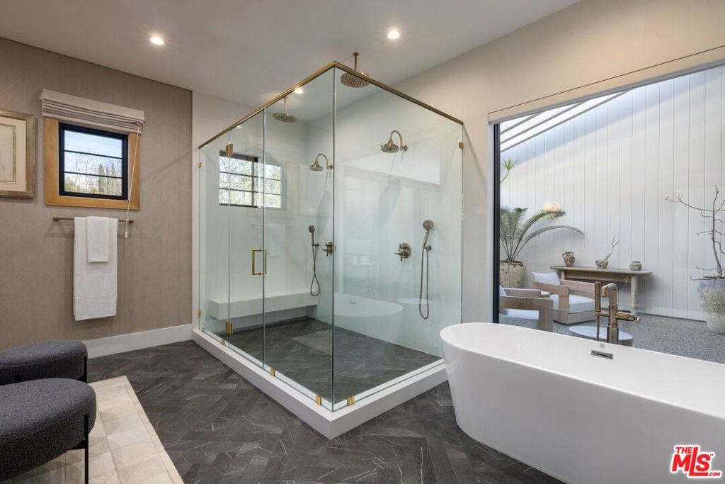 Tucked behind custom gates and mature hedging on one of the widest lots in the flats of North Bundy - with 120 feet of frontage - this modern Brentwood estate delivers an extraordinary blend of privacy, design, and innovation. The main residence offers 5 bedrooms and 7 bathrooms, plus a versatile office/den/nursery, while a fully equipped detached guest house with its own bedroom and bathroom brings the total to 6 beds and 8 baths. Purposefully designed for both entertaining and daily comfort, the home opens to a resort - style backyard with a large, private pool, mature landscaping, an outdoor kitchen, and a fire pit - your own secluded sanctuary. The expansive lot also offers space to add a sports court on the side of the home. A spacious 2-car garage is complemented by gated parking for up to four additional vehicles. Security is next-level, featuring an AI-powered camera system, automated perimeter alerts after hours, and 24/7 armed patrol service already in place - ensuring peace of mind without compromise. Inside, expansive open-plan living spaces connect effortlessly to the outdoors. The main kitchen stuns with dual islands, all Miele built-in appliances - including an espresso station, refrigerator, oven, microwave, and dual dishwashers - and a sleek frameless integrated stovetop. Discreetly tucked away, the chef's kitchen is ideal for hosting or staff use, outfitted with an 8-burner Wolf range, additional Miele refrigerator and freezer, and a spacious walk-in pantry. A climate-controlled wine rack adds sophistication and function for wine collectors. For elevated living and entertaining, the home includes a state-of-the-art private theater with over $100K in hidden, professional-grade AV equipment and acoustically transparent finishes - creating a truly immersive cinematic experience. Upstairs, a sun-drenched hallway opens to a spacious deck for second-level indoor-outdoor living. The primary suite features its own private terrace with fireplace and a walk-in closet, complete with custom cabinets and island with key-card access drawers for valuables. Three additional guest bedrooms upstairs each offer en-suite baths and custom closets- ideal for balanced family living. Smart home integration elevates every detail, with wall-mounted displays and app-based controls for lighting, climate, sound, and security. A roof-mounted cell antenna boosts signal, and Wi-Fi boosters ensure strong, consistent coverage throughout the property. Custom furniture and collectible lighting fixtures - meticulously curated to complement the home's design - are also available for purchase.