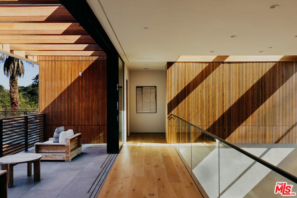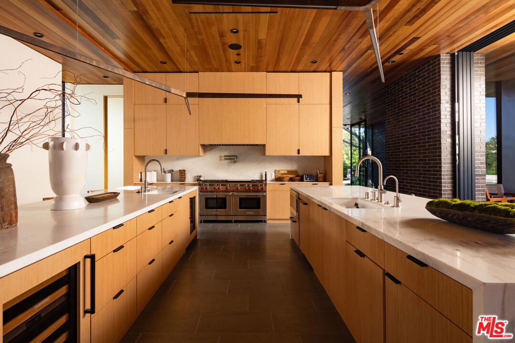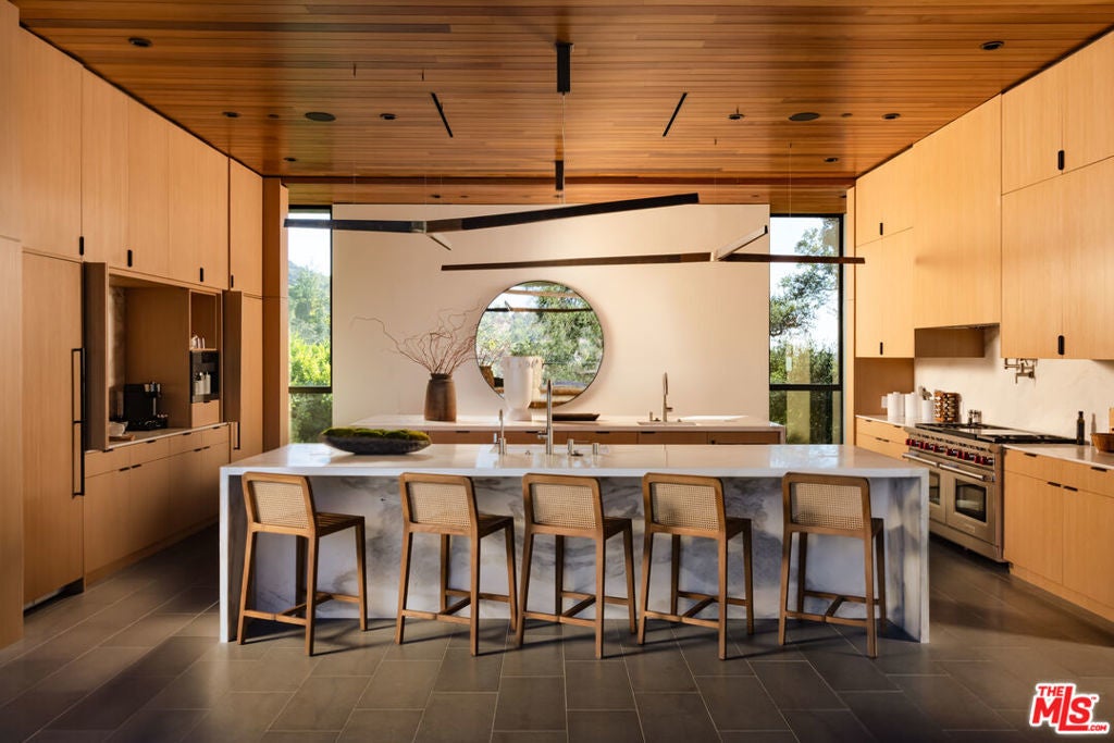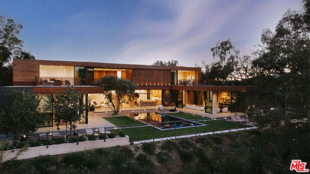This stunning new architectural gem, designed by the acclaimed Noah Walker, sets a new standard for luxury living. Nestled behind the prestigious gates of Oak Pass Road in Beverly Hills, this ultra-private estate offers a rare combination of seclusion and grandeur. Spanning across an expansive floor plan, the home features 7 spacious bedrooms and 9 lavish bathrooms, perfect for both intimate living and large-scale entertaining. The journey begins through an impressive glass pivot door, greeted by a 10-foot indoor greenery wall, elegant brick-clad columns, and soaring hardwood ceilings. The state-of-the-art kitchen is a chef's dream, with dual marble islands, oak cabinetry, top-of-the-line Wolf and Subzero appliances, and two Miele coffee makers. The kitchen seamlessly flows into the dramatic two-story living area, complete with a custom floating staircase that connects all levels of this architectural wonder. Designed to blend indoor and outdoor living, the home boasts 50-foot Fleetwood pocket doors that open to the meticulously landscaped grounds, featuring a zero-edge pool and spa, an outdoor kitchen, fire pit, olive trees, and multiple lounging areas all set against breathtaking panoramic views. First-class amenities include a private movie theater, fully equipped gym, Himalayan salt sauna, dual steam showers, a temperature-controlled wine display, three private balconies, and a Crestron smart home system. The motor-court, lined with mature oak trees, adds the finishing touch to this one-of-a-kind estate. This extraordinary residence offers an unmatched level of sophistication, set in one of the most exclusive locations in Beverly Hills. An unparalleled opportunity for those seeking ultimate luxury.