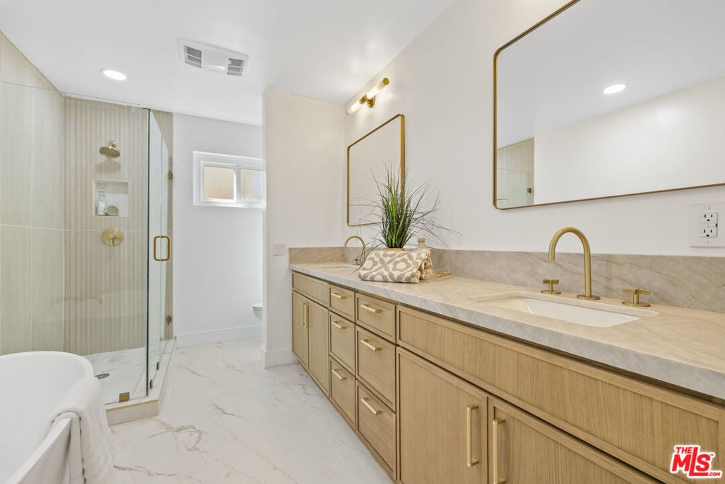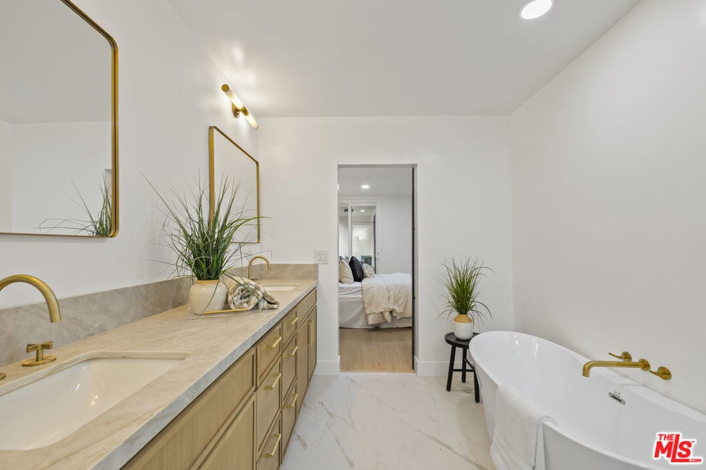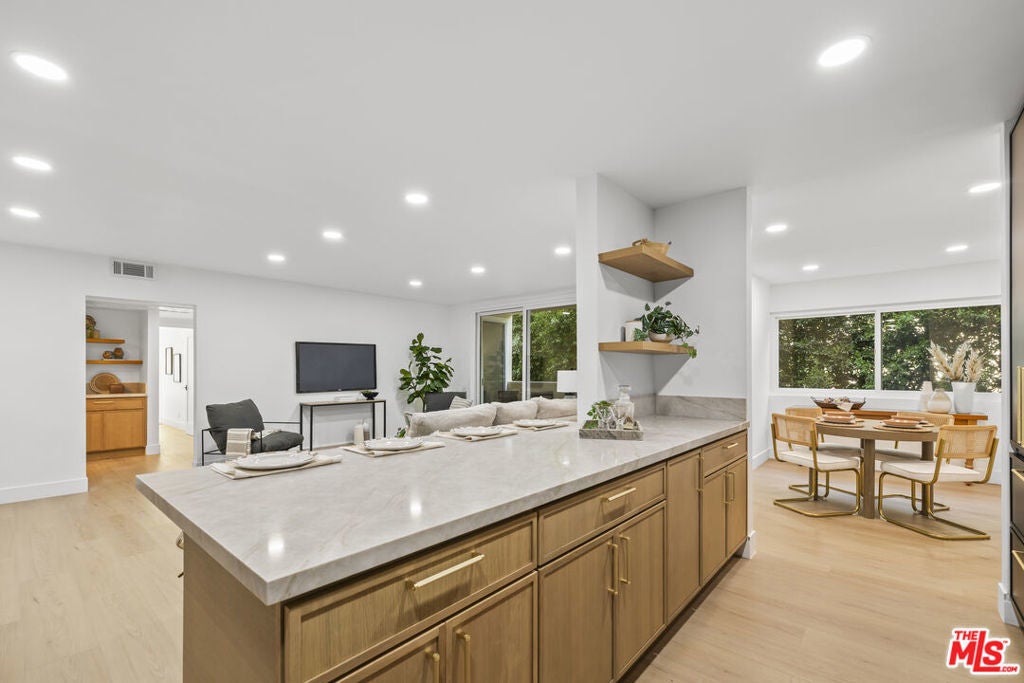 Step into this brand-new designer remodel a 2 bed, 2 bath corner unit offering exceptional privacy, modern luxury, and elevated comfort. The open-concept floor plan flows effortlessly from the living room to the dining area and into a show piece kitchen. Outfitted with Cafe appliances, Taj Mahal quartz countertops, sleek black cabinetry, warm wood accents, and a large island with seating, the kitchen is both stylish and functional perfect for entertaining. Expansive new Milgard Tuscany white windows and sliding glass doors flood the space with natural light and connect to a private balcony surrounded by greenery. Wide-plank French White Oak floors run throughout, creating a seamless modern aesthetic. The bathrooms have been fully reimagined with Taj Mahal quartz counters, custom wood vanities, large-format tiled floors, and brushed gold fixtures. The primary suite includes dual vanities and a walk-in shower, blending luxury with everyday convenience. This home also offers in-unit laundry hookups, with a shared laundry room in the garage for oversized items. Community amenities include a beautifully maintained lobby, sparkling pool, visitor parking, and rentable storage bins in two garage storage areas. Two gated garage parking spaces complete this home. Located on tree-lined Kings Road, just steps to Santa Monica Blvd and the Sunset Strip, this residence delivers timeless design and prime West Hollywood living.