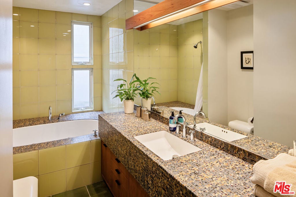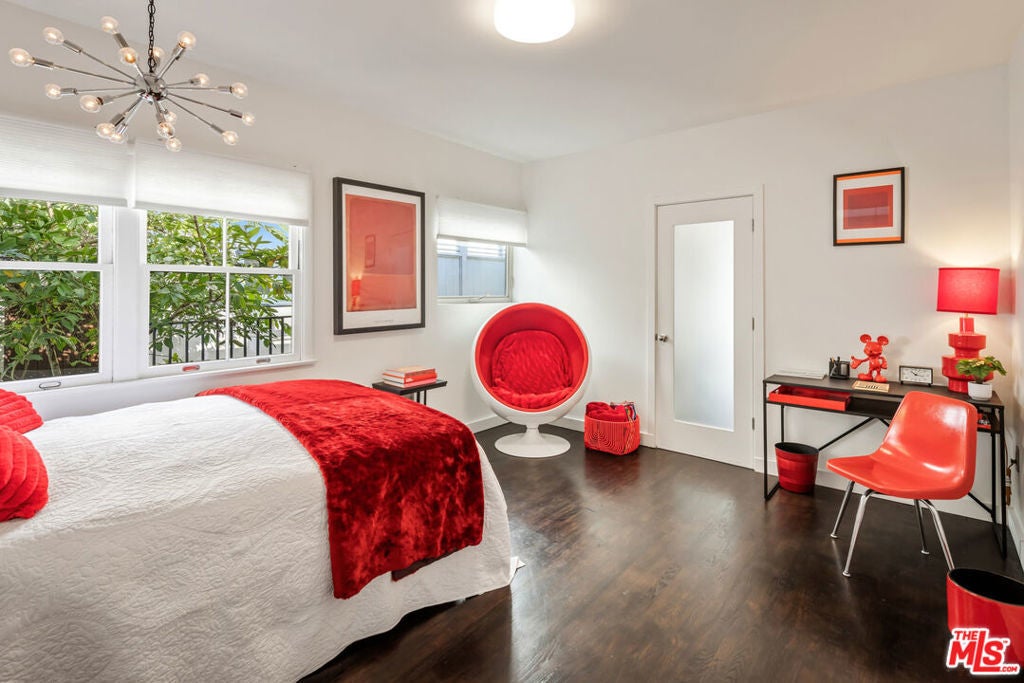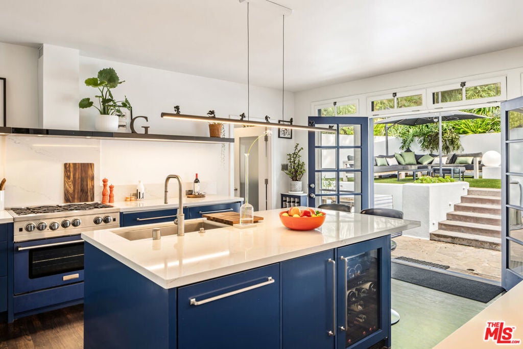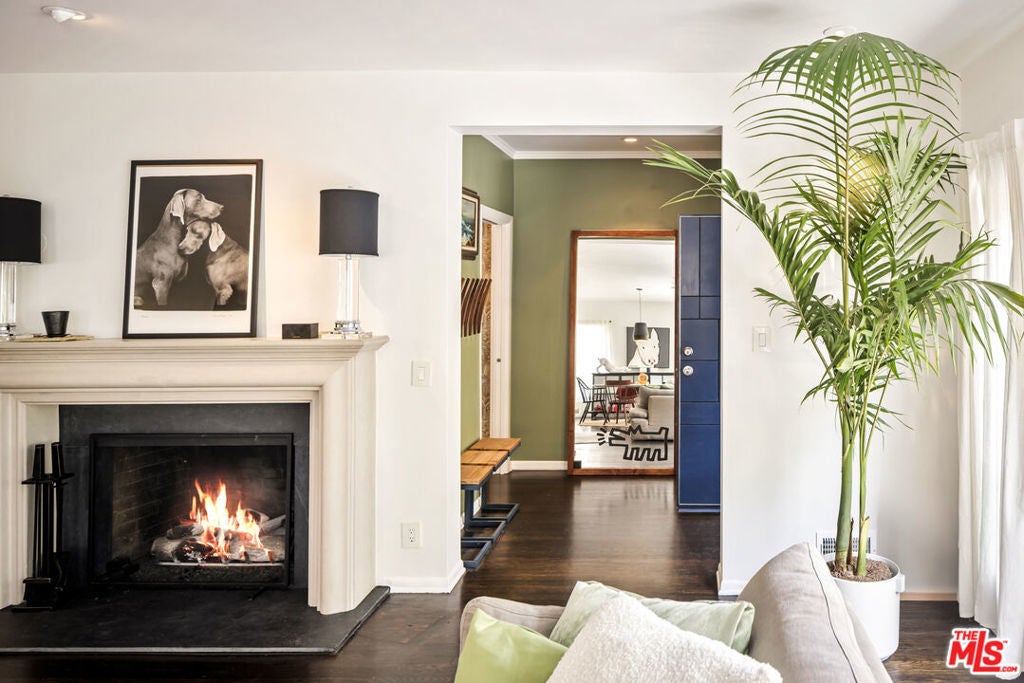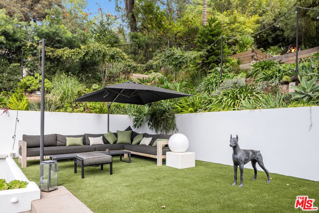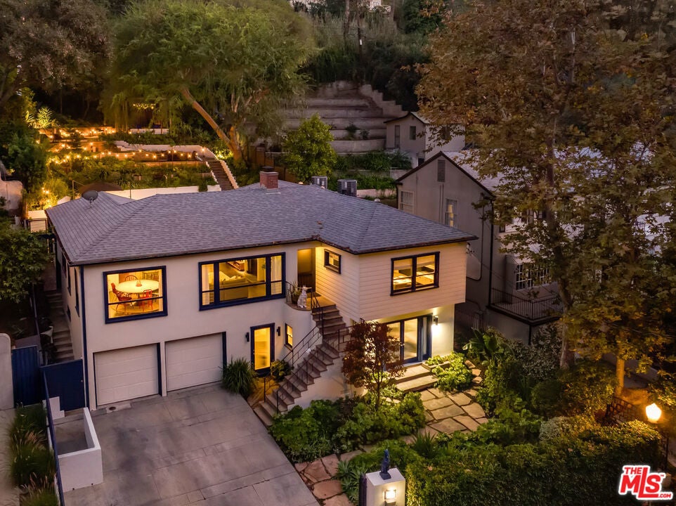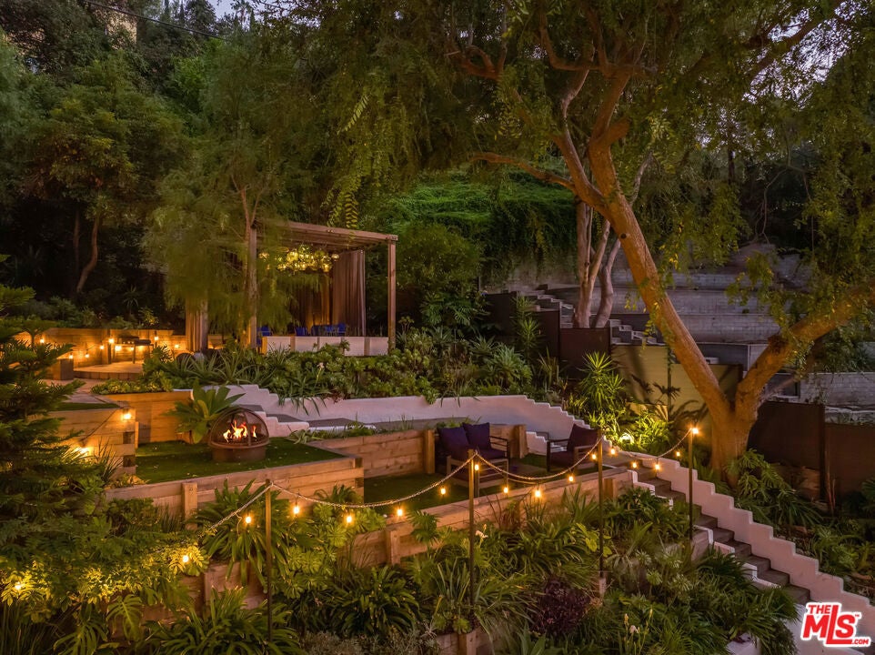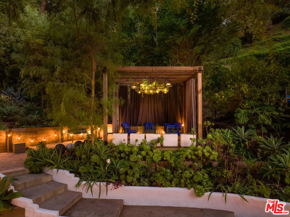 This gated Traditional home with mid-century modern influences sits on a large, wooded lot in upper Beachwood Canyon. Formerly celebrity-owned and tucked back from the street, this home's expansive rear yard is an outdoor sanctuary bringing the tranquility of nature to everyday living. Green canyon views can be seen from the oversized windows creating an airiness throughout the living space, anchored by a renovated kitchen which seamlessly joins both interior living and the outdoors. The kitchen is outfitted with built-in, luxury appliances, a large island, and plentiful countertop prep space. Whether you prefer entertaining or quiet fireside moments, this home offers the space for your household to sprawl on the 4 bedroom, 3 bath main level inclusive of an oversized, primary suite with custom Walnut built-in's and dedicated laundry/utility room. Rear French doors open to your own secluded park-like garden designed for entertaining. Winding paths of the curated grounds showcase its succulent gardens, professionally landscaped terraces, several lounging areas, banana and Meyer lemon trees, and private hilltop pergola illuminated by a masterfully designed light installation. Out of town guests can enjoy the privacy of a private guest suite on the lower level with its own kitchenette, bathroom, bedroom/office and private garden. The two-car garage features built-in cabinets & utility sink. Close to hiking trails, Beachwood market, city night life, and major studios. Experience the magic of this private sanctuary in iconic Beachwood Canyon.