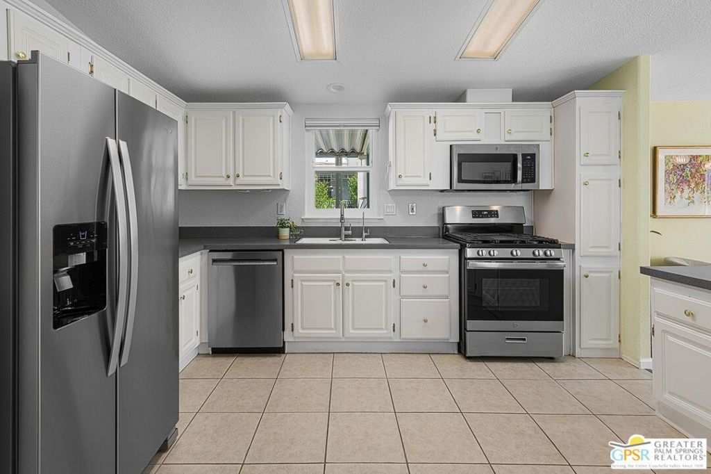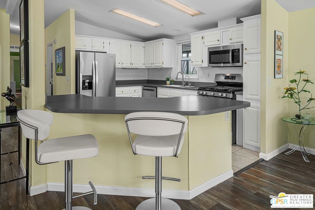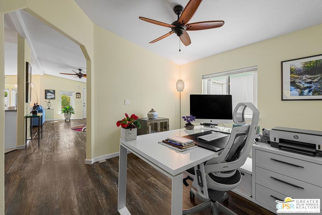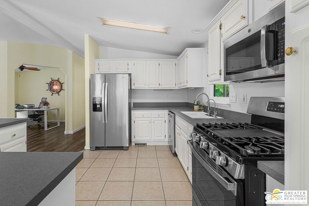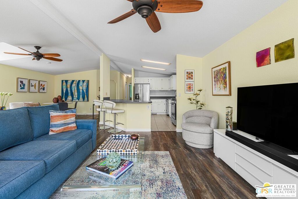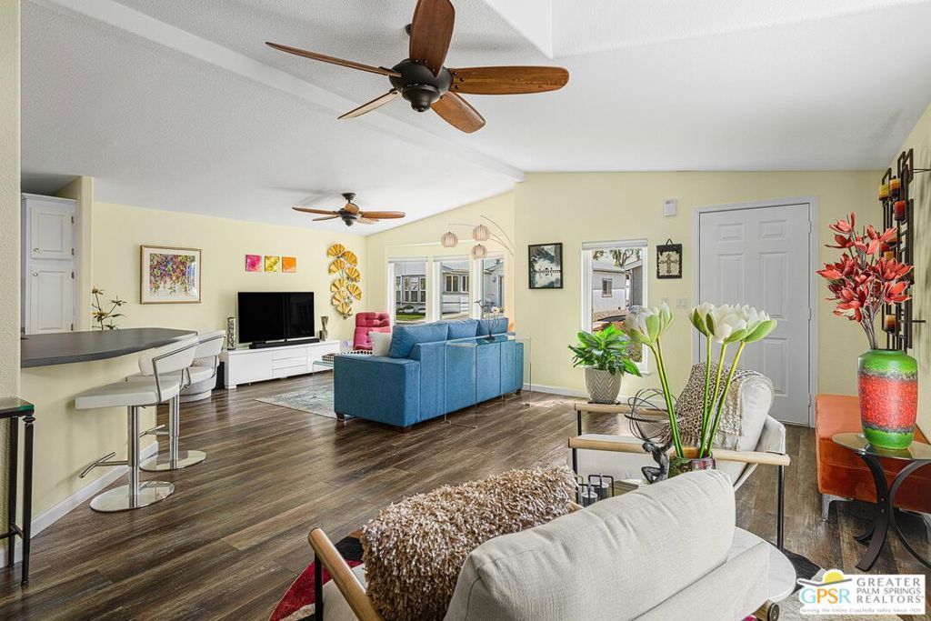 Built in 2000, light, bright, inside and out and move-in ready, this meticulously maintained 1,416 sf 2BR/2Ba with den/office home features high ceilings, new windows and blackout solar shades throughout, interior laundry room, covered back porch, and an impressive 2 car garage. The open concept kitchen features bar seating and stainless steel appliances, perfect for contemporary living. The primary bedroom features an ensuite bathroom with linen, storage, and generous closet spaces. Freshly carpeted guest bedroom adds comfort and style. The side and back yard provide plenty of entertaining space and the attached garage with additional storage sets this home apart from and above the rest. The Canyon's amenities include 2 sparkling pools and spas, a welcoming clubhouse with banquet facilities with a stage, perfect for hosting events. The fitness room, billiards, indoor shuffleboard, are surrounded by wonderful park-like greenbelt grounds with tennis and pickleball courts. Buyers and their agents to verify current space rent fees and square footage.