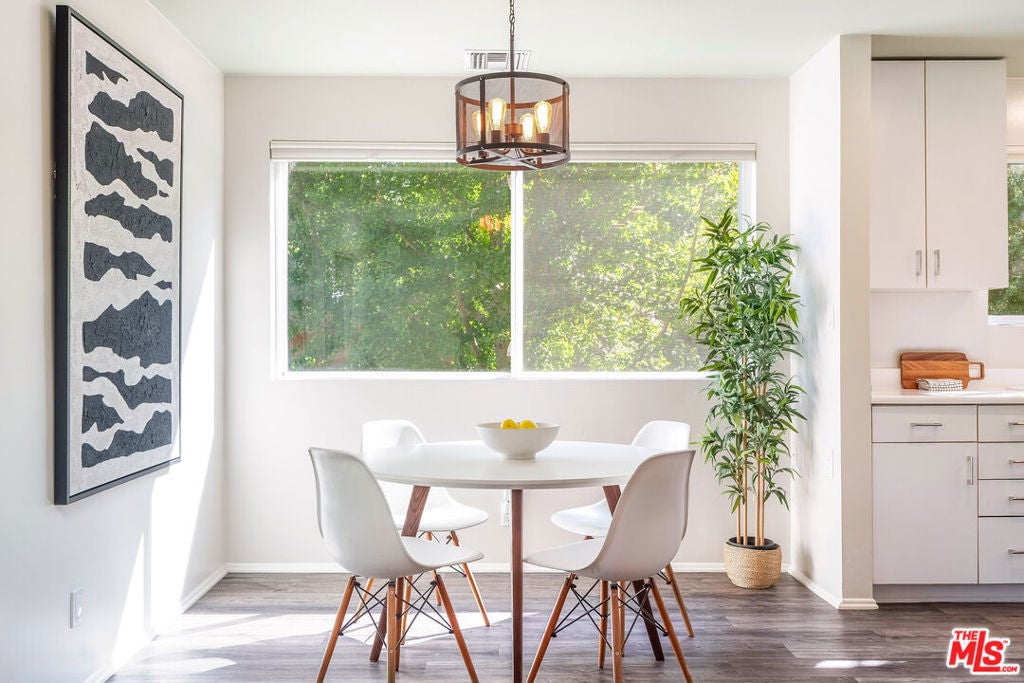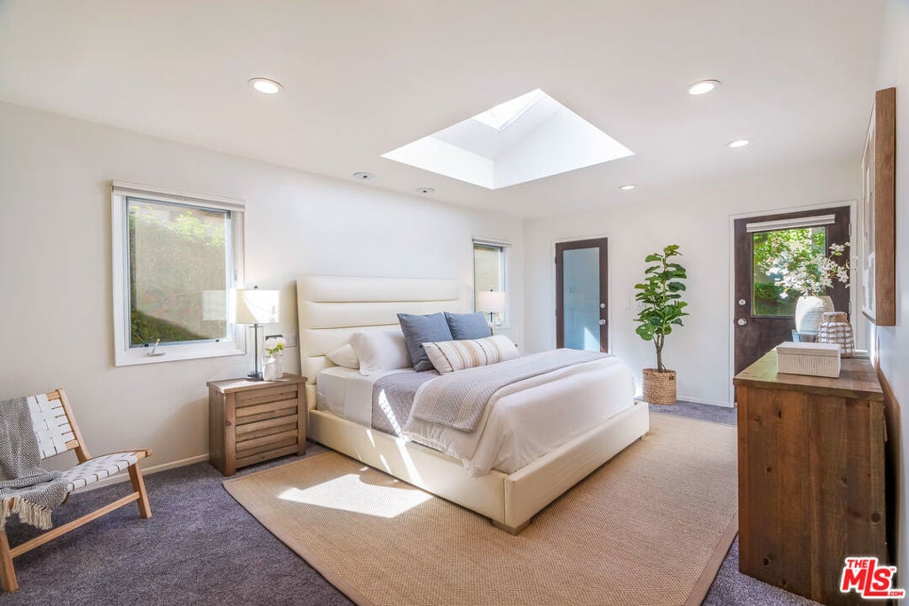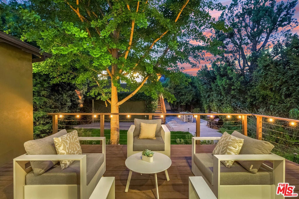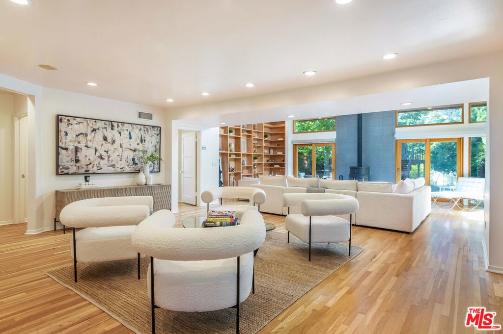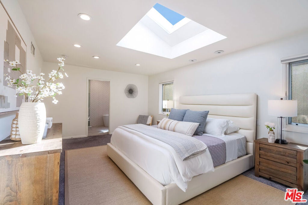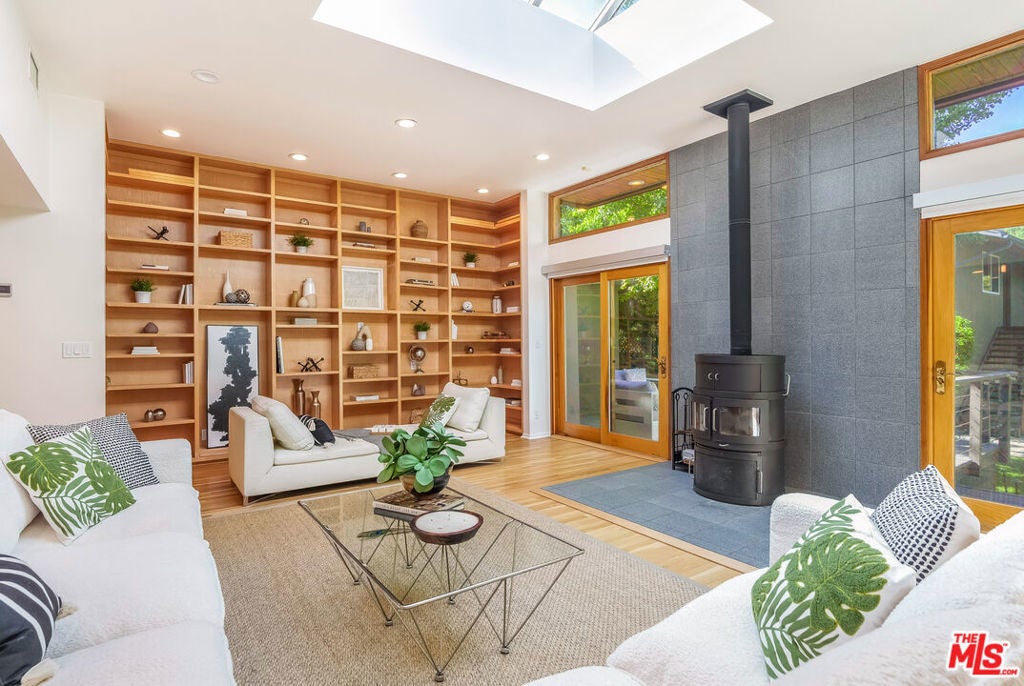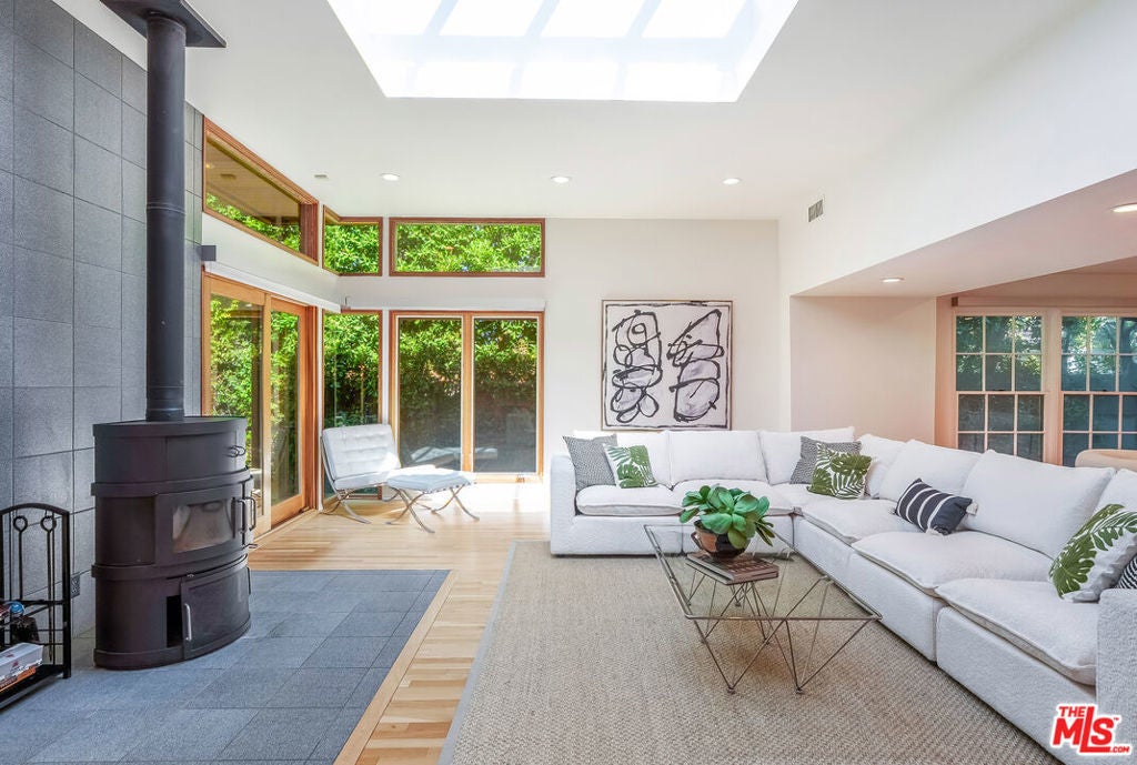 Walled and gated compound with stunning architecture on parklike grounds of over 10,000 sqft. Enter through gates to a large motor court and main house. The 3 bedroom 2 bathroom main house has gorgeous wood floors, tall ceilings with skylights and windows that flood the space with natural light. The spacious living room has a floor-to-ceiling built-in book-shelf, architectural fireplace, skylight and glass doors to the outside. The open concept kitchen with eat-in counter, stainless steel appliances, including a new refrigerator, stone countertops, maple wood cabinets, wine fridge and walk-in pantry. The primary bedroom has a large skylight and very substantial custom walk-in closet. The gorgeous en-suite primary bathroom is newly remodeled with separate stand-alone tub, glass-enclosed steam shower and dual sinks. The remaining two bedrooms in the main house are a great size. The private backyard is surrounded by greenery. A secondary structure has an upstairs guest apartment with living area, kitchen, separate bed, bath, & large terrace with a garage below. Downstairs there is a gym with separate bathroom. All of this with a pool, multiple decks, grassy yard, fruit trees and endless options for outdoor enjoyment. Close to the best restaurants, shopping and entertainment in Sherman Oaks. The square footage breakdown per measurement is as follows: Main House approx. 2,493 sq ft, Guesthouse approx. 665 sq ft, Gym & Bathroom 206 sq ft.