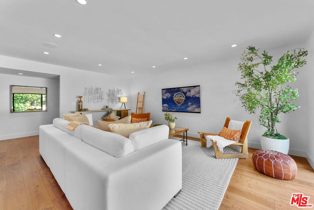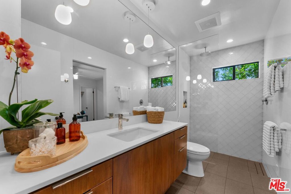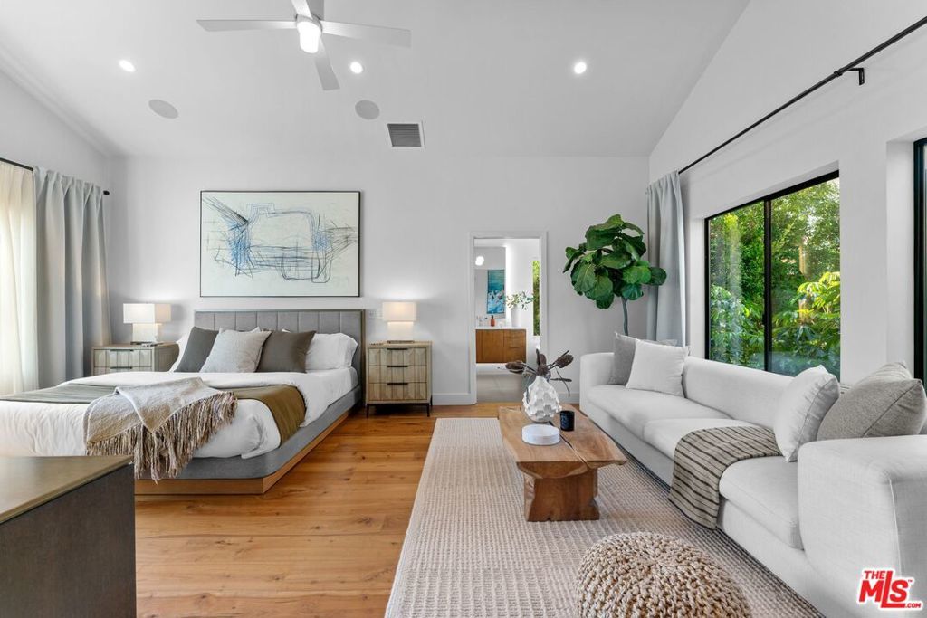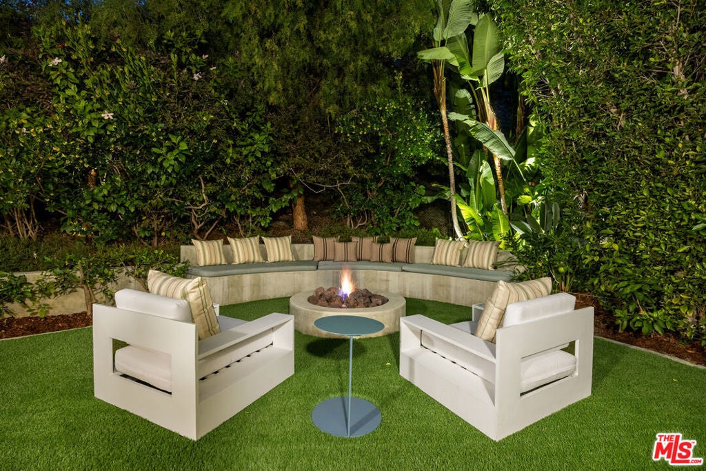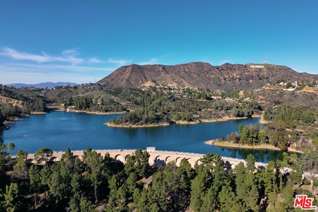 This stunning 5-bedroom, 4-bathroom Lake Hollywood residence has been completely reimagined by renowned designers Vaughan Benz, blending modern sophistication, family functionality, and timeless California style. Nestled just below the iconic Hollywood Sign on a quiet cul-de-sac, the home sits on a wide, sidewalk-lined street with ample parking - an ideal setting for families and gatherings. A private gated courtyard introduces the property with lush greenery, and tranquil seating areas before opening to a light-filled two-story layout. Inside, North American walnut hardwood floors, custom lighting, and tailored finishes create an inviting, contemporary atmosphere. The expansive family room serves as the heart of the home, flowing seamlessly into a chef's kitchen equipped with a Wolf range, a wine fridge, walk-in pantry, and a generous center island with casual eat-in dining. Perfect for everyday living and entertaining, this space connects effortlessly through walls of glass to the resort-style backyard. Step outside to a garden sanctuary designed by landscape designer Steve Silva - a private oasis with sparkling pool and spa featuring a waterfall, built-in fire pit, fruit trees, herb garden, and low-maintenance turf lawn. Whether hosting friends or relaxing under the stars, this outdoor retreat was made for connection and calm tranquility. Upstairs, the luxurious primary suite offers sweeping views, an oversized walk-in closet, and a spa-inspired bath with Apaiser soaking tub, dual vanities, glass shower, and Seura TV mirror. Four additional bedrooms and three beautifully designed baths provide generous space for family and guests. Additional highlights include a built-in stereo system, a spacious laundry room with custom cabinetry, and a direct-entry two-car garage. Located minutes from the 101, major studios, the Hollywood Bowl, and scenic Lake Hollywood trails, this newly remodeled home offers the perfect balance of luxury, lifestyle, and Los Angeles living beneath one of the city's most legendary landmarks.