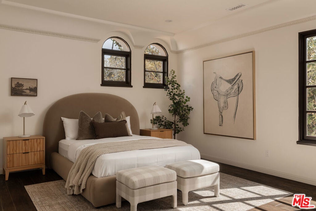 Timeless Spanish Revival architecture meets modern luxury in this beautifully restored Sunset Square residence. Set within one of Los Angeles' most coveted historic enclaves, 1641 N Ogden showcases authentic craftsmanship and refined updates throughout. Signature details include Saltillo tile, arched doorways, decorative ironwork, and a classic clay tile roofhonor its 1920s heritage, while thoughtful restoration introduces contemporary comfort and style. The home features five bedrooms and four-and-a-half baths, including a first-floor nanny suite ideal for guests, multi-generational living, or a private office retreat. Sun-filled interiors are anchored by original hardwood floors and bespoke millwork, with a chef's kitchen designed for both elevated entertaining and everyday living. French doors open to a serene courtyard and sparkling pool surrounded by lush landscaping, creating a seamless indoor-outdoor flow that defines quintessential California living.