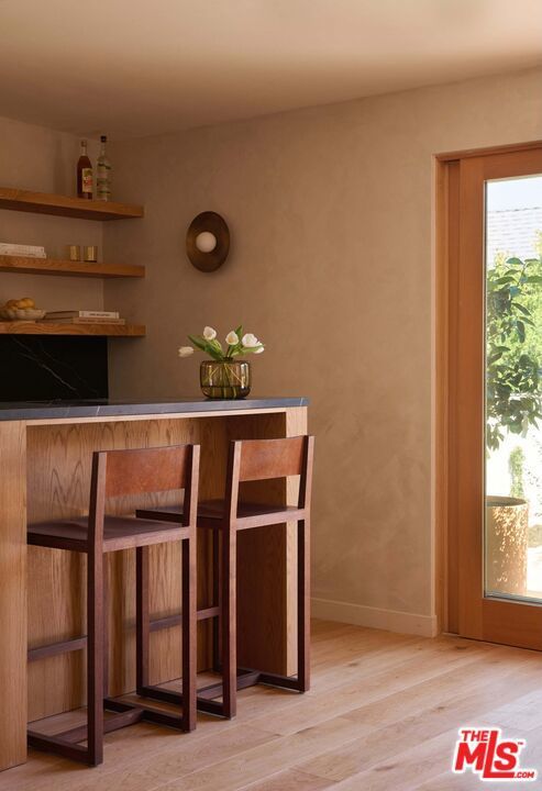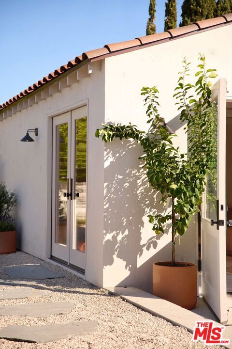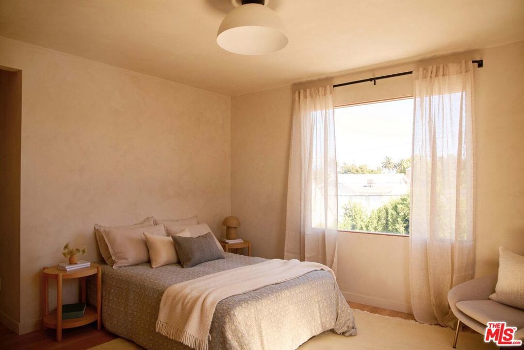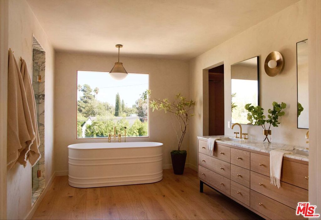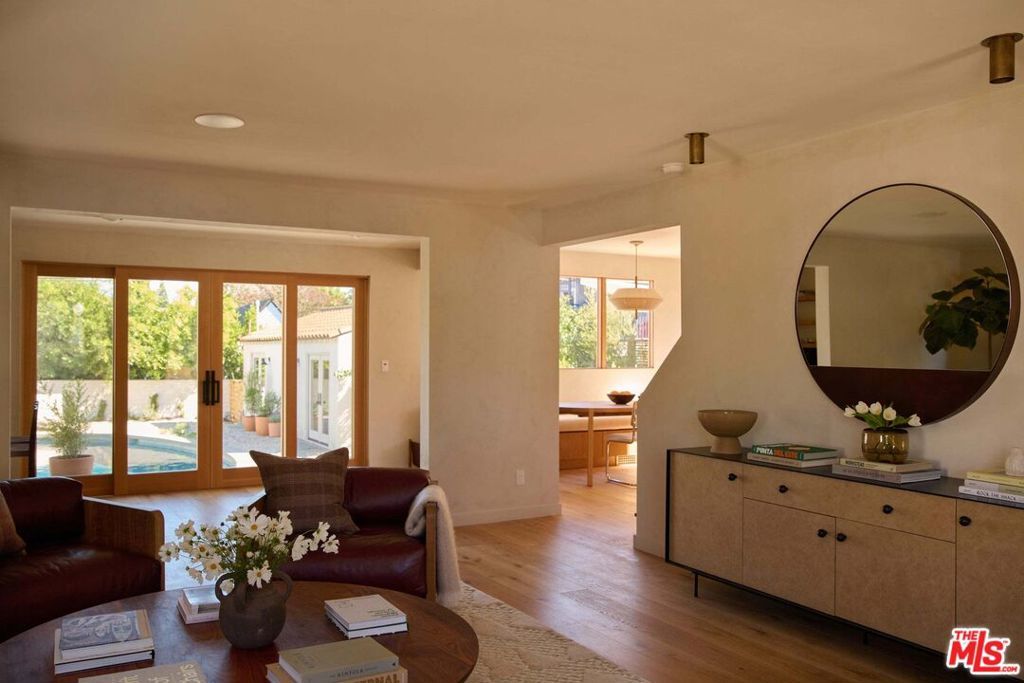 Newly reimagined in prime Larchmont Village, this fully renovated residence blends timeless design with modern warmth. Taken down to the studs and completely renovated, the home exudes a sense of calm through its cohesive palette and thoughtful details. Past the private entry, the living room opens with clean sightlines through to the backyard, anchored by a central fireplace and framed by beautiful custom wood windows. The kitchen features bespoke wood cabinetry, top-of-the-line appliances, and a built-in banquette, perfect for gatherings big or small. Adjacent to the kitchen, a custom bar area showcases exquisite craftsmanship with integrated shelving, custom light fixtures, and refined finishes that elevate the home's entertaining experience. Walls throughout are finished in custom Portola paint, adding depth and texture to the serene interiors. Sliding doors lead to the sizable backyard with a large, sparkling pool and built-in BBQ, perfect for entertaining or quiet relaxation. A walk-in pantry, powder room, and generous laundry room complete the first level. Upstairs, a skylit landing leads to 3 ensuite bedrooms, including a primary suite with a spa-like bath. A soaking tub beneath a picture window, a walk-in shower, double vanity, and a custom closet complete the retreat-like space. Outside, the converted garage offers a flexible bonus space plus a guest suite and bath, perfect for visitors or creative use. Bathed in natural light from all sides, this home offers sophisticated, effortless living within strolling distance to Larchmont's Village's best spots.