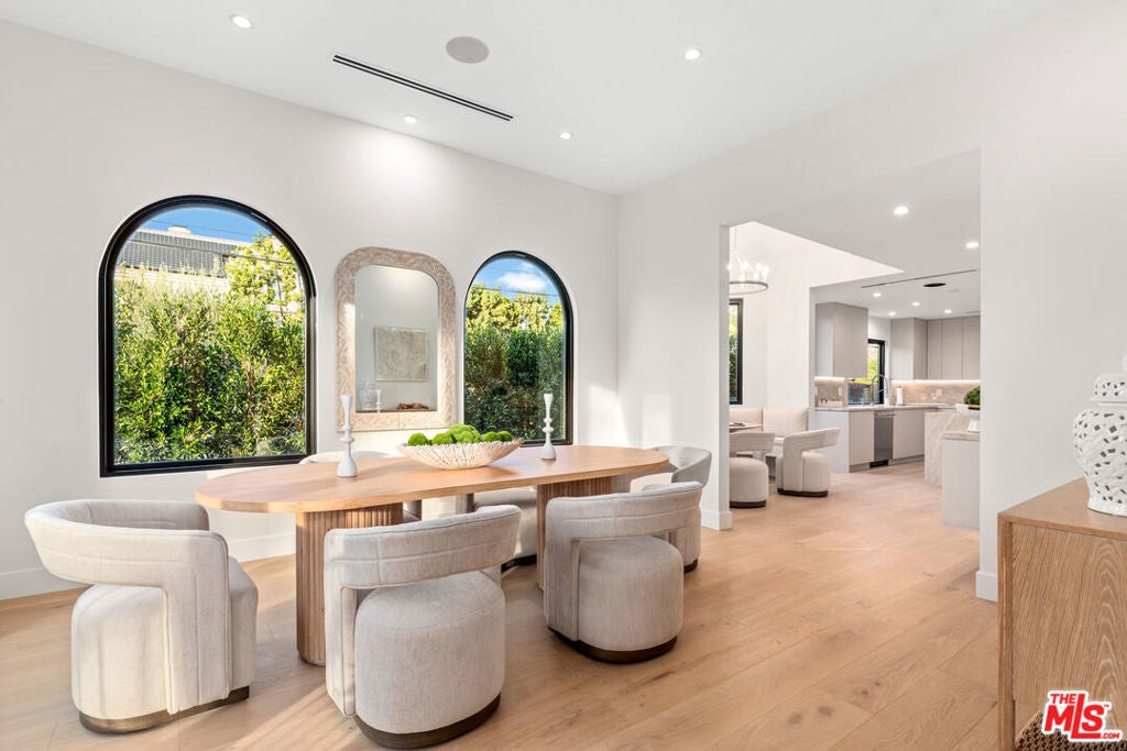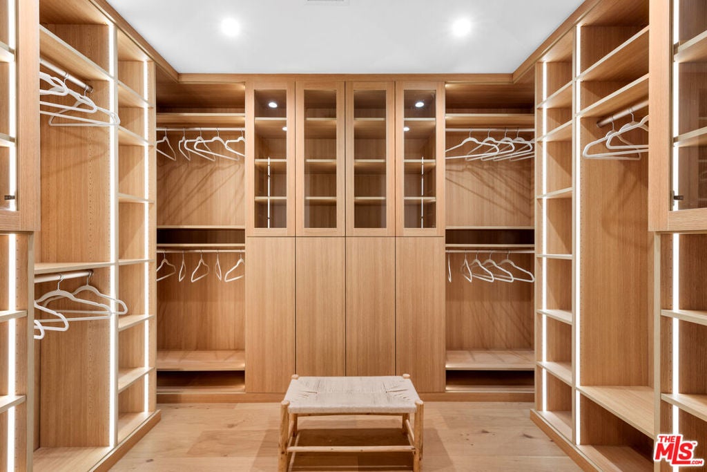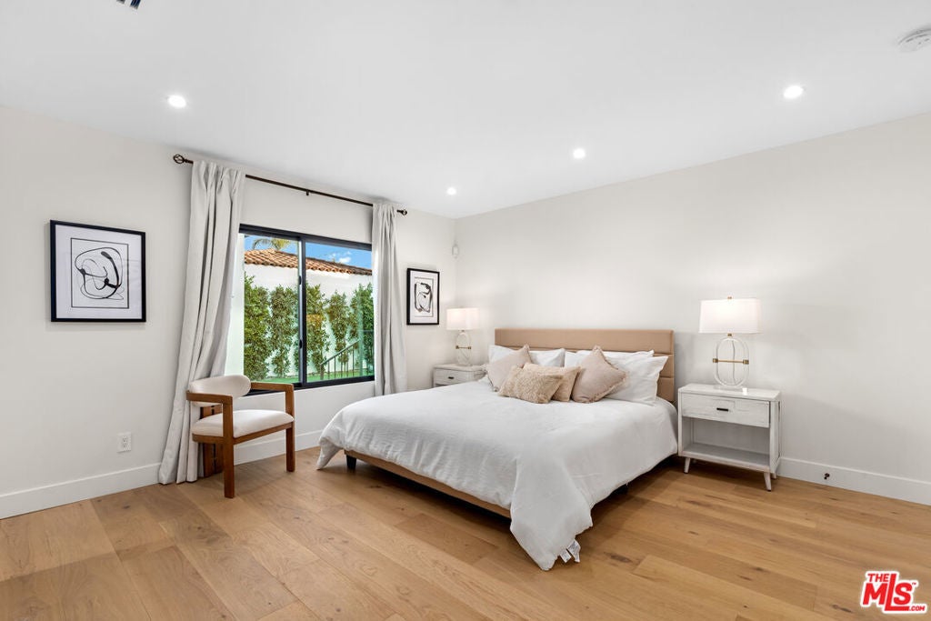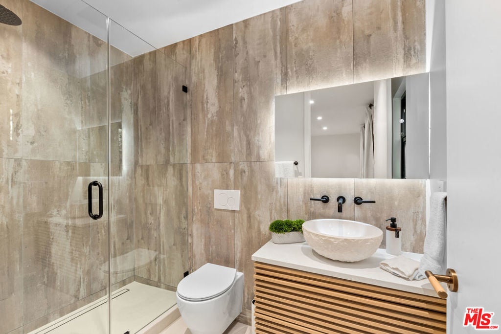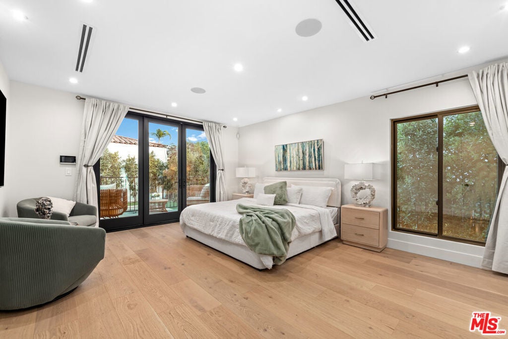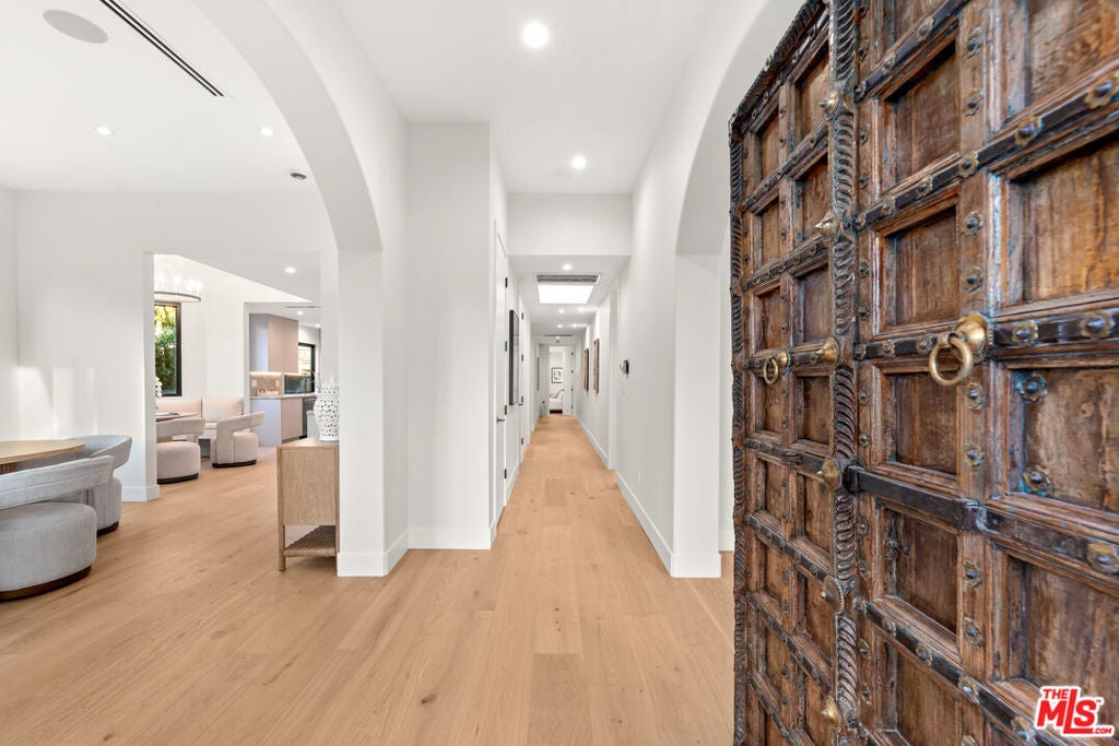Impeccable down to the studs rebuild with added square footage. An Exquisite Spanish Contemporary Masterpiece in the Heart of Los Angeles. This sophisticated home boasts four ensuite bedrooms, each featuring bespoke closets with custom lighting throughout. Complete with wall hung toilets and a stunning powder room. The property also showcases a serene saltwater swimming pool and waterfall. Upon entering the exclusive gated estate surrounded by 15-foot-tall trees that were recently planted giving you complete privacy. The journey continues through a majestic 120-year-old Spanish door which was purchased for this home, leading into a spacious foyer with 9" European wood floors that gracefully flows through an arched passageway into the luminous living and dining areas. The sunlit living room is distinguished by soaring ceilings, a magnificent designer wood-burning fireplace framed by a Venetian plaster mantle. The open-concept kitchen is a culinary haven, featuring custom Italian leather cabinetry and exquisite Taj Mahal granite countertops. Equipped with all brand new premium Thermador appliances including a 48-inch range, a 60-inch refrigerator/freezer, and wine fridge. Cozy breakfast nook adds an inviting touch. One of a kind powder room that will leave guests in awe, showcasing a stunning Italian granite wall, an artistic hand-carved wood slab counter, and a unique Mediterranean granite sink, creating a designer's masterpiece. Master bedroom offers expansive his-and-her custom closets with built-in lighting, along with a luxurious bathroom featuring an Italian-tiled shower and a spacious soaking tub. The additional ensuite bedrooms also feature custom walk-in closets with lighting and designer finishes. Relax in one of the several outdoor seating areas, or unwind in the private backyard oasis, complete with a brand-new salt water swimming pool and waterfall, or savor alfresco dining while enjoying your favorite tunes from the outdoor sound system. Fully Furnished with brand new top-of-the-line designer pieces that were custom-ordered for this home can also be purchased. Additional amenities include dual-zone air conditioning, a two-car garage with an electric car charger, a comprehensive security & sound system, 4 large smart televisions, laundry room, and more. Located just a stroll away from trendy restaurants on Beverly Boulevard and Third Street, and just a five-minute drive to the Beverly Center, The Grove shopping center, and upscale boutiques on Robertson Blvd. This residence epitomizes the perfect blend of relaxation and glamorous living.