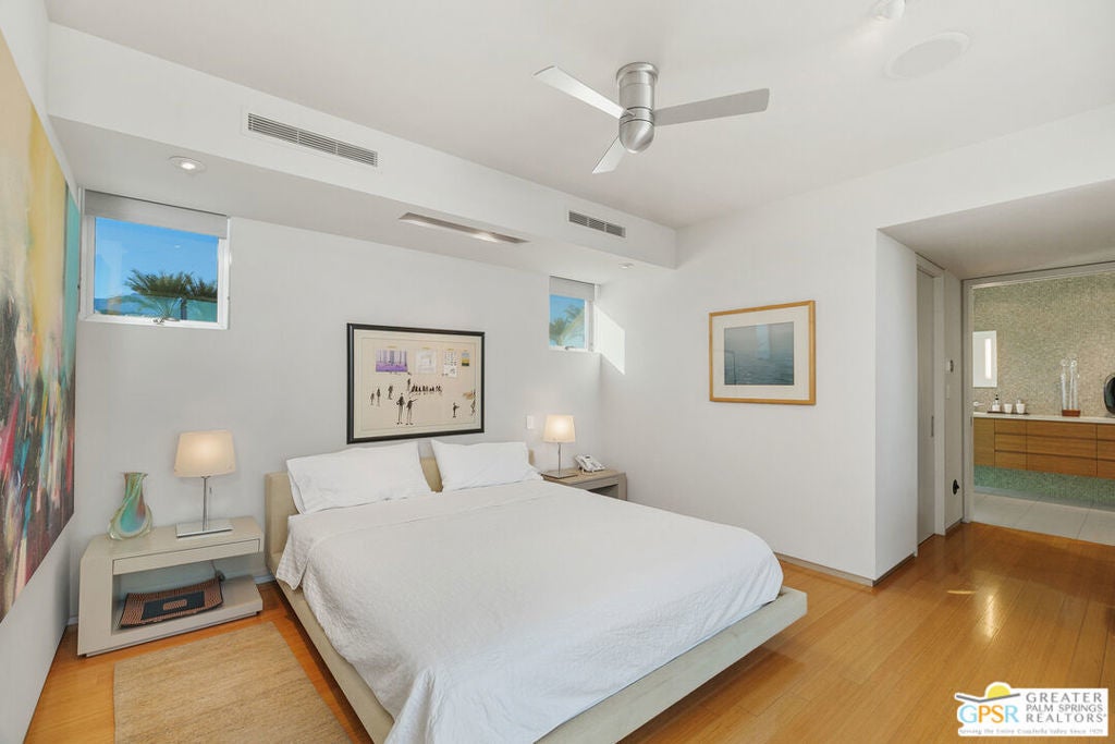 Perched gracefully above the Ritz-Carlton, this architectural masterpiece by visionary Ana Escalante, created in collaboration with mid-century modern legend Don Wexler, embodies timeless design and desert serenity. This home offers the rare opportunity to own an iconic residence where elegance, innovation, and nature exist in perfect harmony.Step inside and experience a breathtaking interplay of light, water, and structure. A 75-foot lap pool stretches like a shimmering ribbon through the heart of the home, visible from the living, dining, and kitchen areas through walls of glass. By day, its tranquil surface mirrors the desert sky; by night, it becomes a glowing centerpiece, an ever-present rhythm that defines the home's atmosphere.Inspired by the desert's raw beauty, the design seamlessly integrates sustainable materials and natural desert landscaping. Formaldehyde-free bamboo floors and cabinetry complement terrazzo, recycled-glass tile, exposed concrete block, and native plantings to create a sleek yet organic environment. Brought to life by Van Vleet Construction and interior designer Mark Nichols, every detail reflects authenticity, craftsmanship, and understated sophistication.The chef's kitchen is both functional and artful, featuring a Wolf range and oven, oversized Sub-Zero refrigerator and freezer, Sub-Zero refrigerator drawers, and dedicated wine storage, ideal for entertaining or culinary exploration.Privacy and comfort are thoughtfully arranged throughout. Upstairs, two expansive primary suites each showcase sweeping valley views one with direct access to the panoramic deck overlooking the Coachella Valley, and the other positioned above the pool, offering a serene perspective of the desert beyond. A mid-level bedroom suite with private bath and direct access to the three-car garage provides flexibility for guests or an office retreat.Just beyond the upper deck, a versatile guest area with bath accommodates seamless indoor-outdoor entertaining. Nearby, a poolside flex room and private sauna provide an intimate sanctuary for relaxation after a swim or a desert adventure.From the expansive deck, the valley unfolds in cinematic fashion, a stage for desert sunsets, starlit evenings, and quiet golden mornings. Here, entertaining feels effortless, surrounded by panoramic views and the calm of modern desert living.While privately set above it all, the home remains closely connected to the refined amenities of the Ritz-Carlton and the vibrant cultural, dining, and outdoor experiences of Rancho Mirage. This residence is more than a home, it's a work of art, an expression of architectural integrity, and a lifestyle statement grounded in sustainability and sophistication.Mid-century lineage. Modern luxury. Natural desert elegance.Own a rare piece of Rancho Mirage history where design, nature, and serenity converge above the Ritz-Carlton.