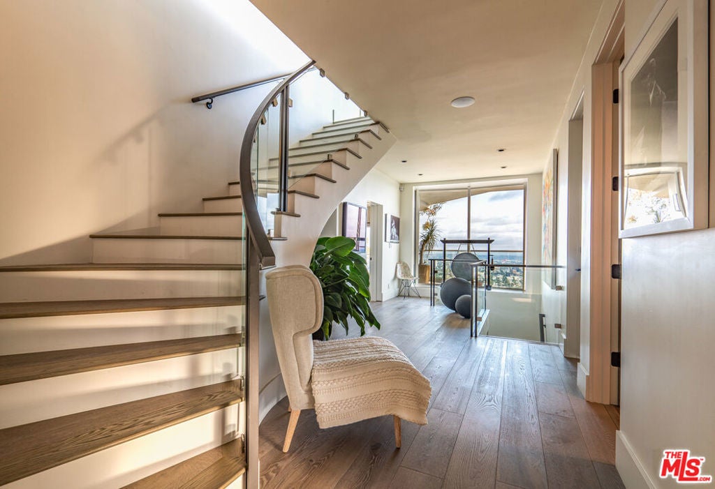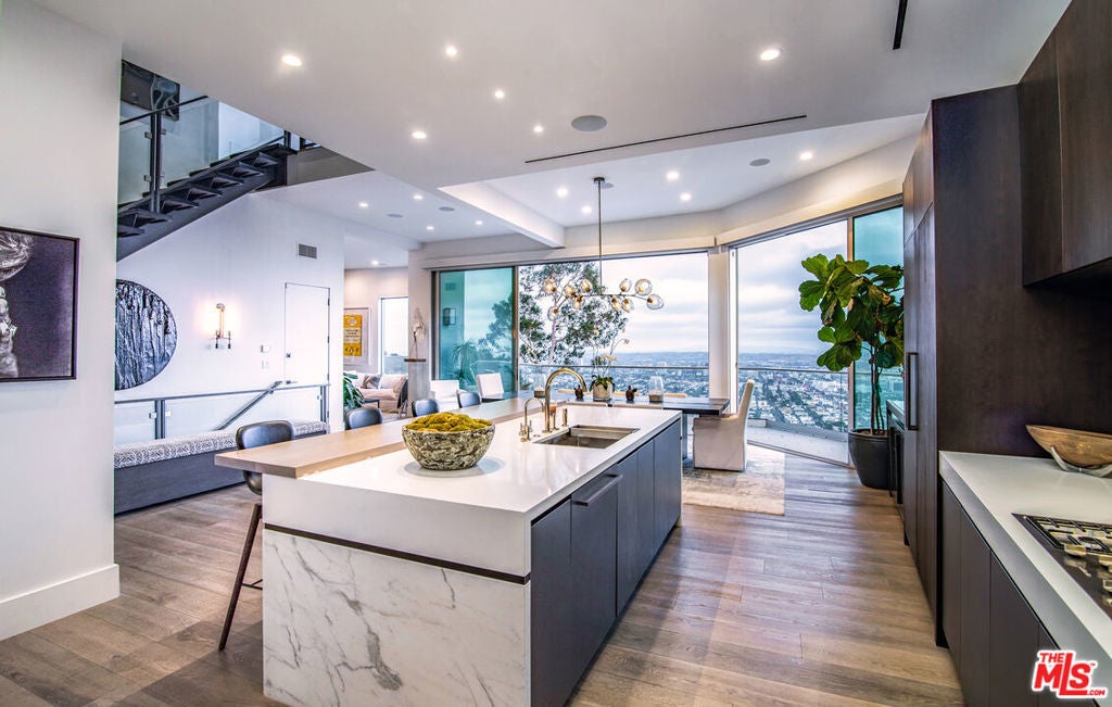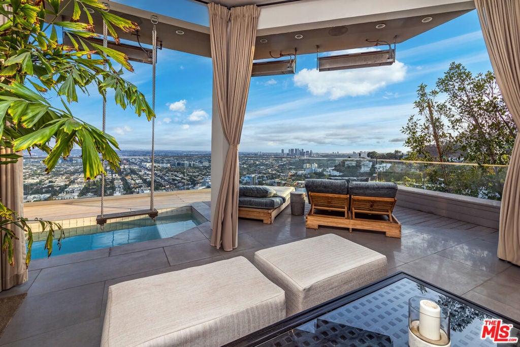 Perched high above the Sunset Strip with an unobstructed panorama stretching from downtown to the Pacific, this masterfully reimagined estate offers one of the most commanding views in all of Los Angeles. Every element of the home has been designed to enhance its cinematic setting, beginning with an expansive main level that unfolds across gallery-height ceilings, dramatic picture windows, and a sweeping wrap-around terrace. A sense of visual rhythm is established through the thoughtful use of rich wood, hand-selected marble, and tactile seagrass accents that create warmth and texture throughout the open-plan living and dining spaces. The chef's kitchen is both functional and inviting, seamlessly integrated into the flow of the home while maintaining a striking visual presence. The primary suite feels like a sanctuary suspended above the city, with floor-to-ceiling glass doors that fully retract to erase the boundary between inside and out. A custom walk-in closet reminiscent of a high-end boutique offers tailored storage and elevated design, while the marble-clad ensuite bath provides a spa-like escape. Beyond the private balcony, a soaking tub, cold plunge, and infrared sauna create a serene outdoor retreat all oriented toward the ever-changing skyline below. Two additional guest bedrooms and three and a half bathrooms are equally well-appointed, offering privacy and comfort without sacrificing style. Designed for those who love to entertain, the residence also features a state-of-the-art ten-seat theater, a fully mirrored gym, and expansive terraces that wrap the home, offering multiple vantage points to take in the surrounding city lights. Outdoors, the experience continues with a series of curated spaces: a shaded lounge for quiet conversation, a sun deck that invites lingering afternoons, a dramatic plunge pool with waterfall feature, and a glass-walled rooftop sauna that feels suspended above the city. Just minutes from the heart of West Hollywood's most celebrated shopping and dining destinations, this is a rare offering that pairs architectural refinement with unmatched elevation both literal and experiential.