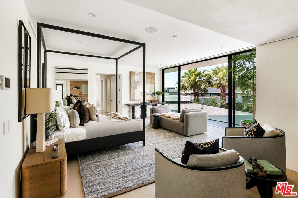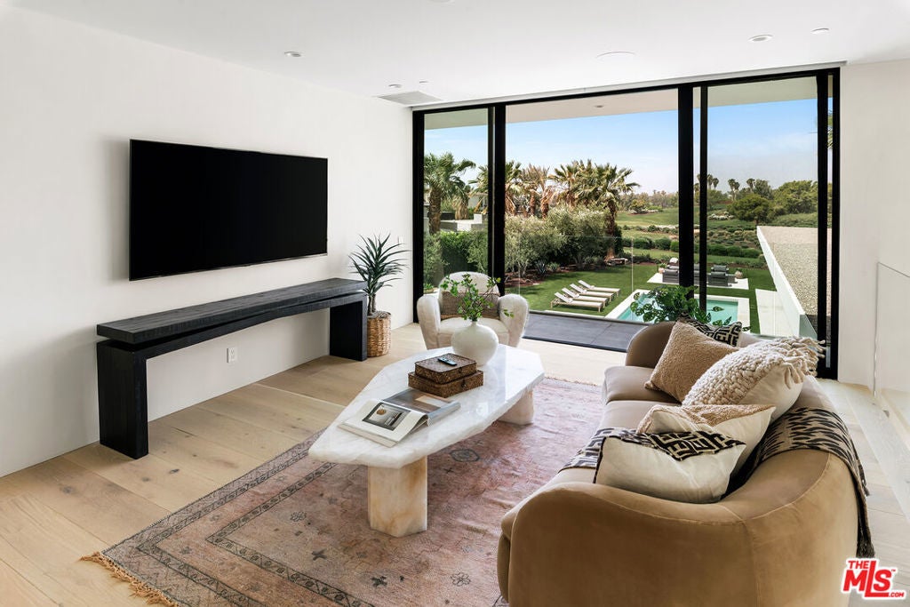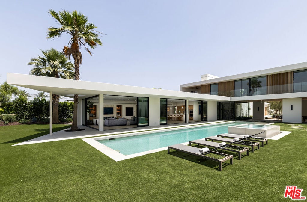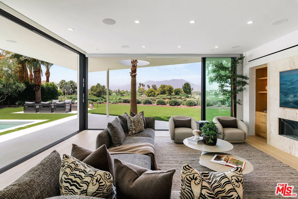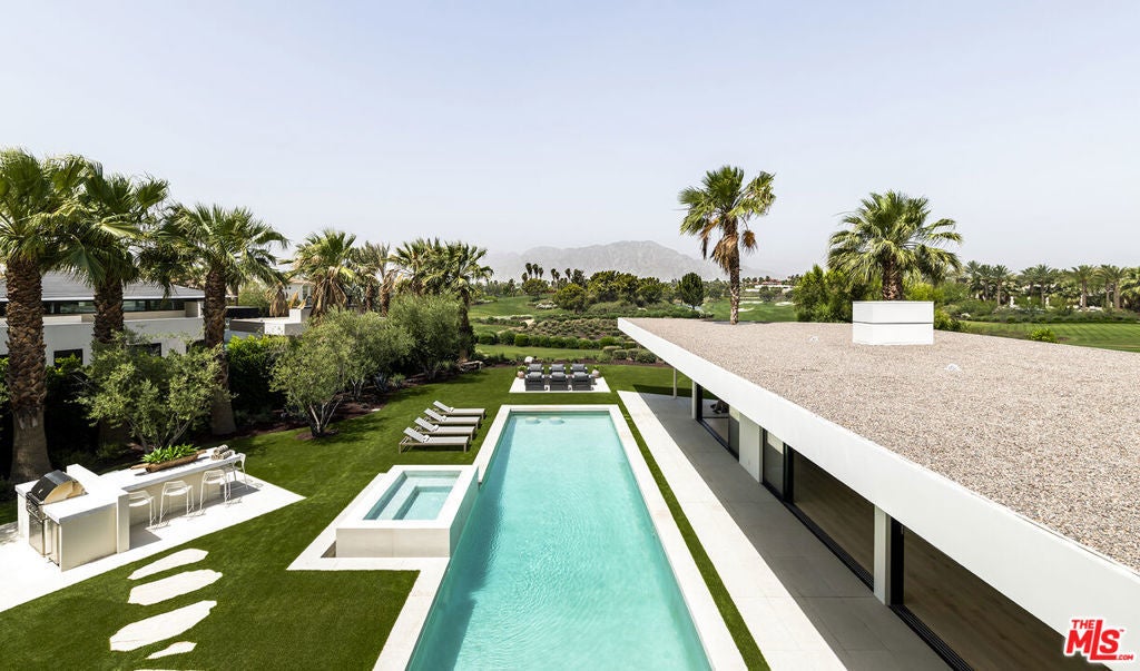 Stunning new architectural remodel with spectacular mountain views and a Palm Springs flair in the exclusive Madison Club. This home showcases walls of glass and a balanced mix of stone, wood, fire, and water features, and the finest finishes, including Wolf, Sub-Zero, and Miele appliances, as well as marble and quartzite throughout. The primary retreat encompasses the entire second floor, complete with bedroom, indoor/outdoor office, large bathroom with laundry room, covered rooftop deck, and elevator. There are two guest rooms on the main level of the home. Additional amenities include a theater, temperature-controlled wine room, wet bar, and butler's pantry. A very spacious two-bedroom, two-bath casita with living room and kitchen will accommodate your guests in style. The home opens to panoramic views of the golf course and mountains, a sparkling pool with raised spa, and BBQ island, perfect for year-round outdoor entertaining.