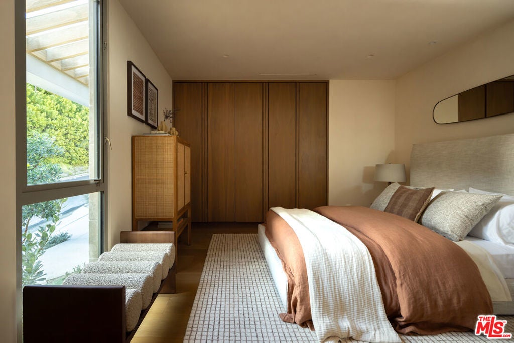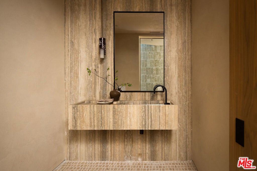 Sculpted Serenity: A timeless design ethos inspired by Amangiri where nature, light, and material exist in perfect harmony. An architectural statement above the Sunset Strip, spanning a single level across 4,600 square feet, where every surface feels sculpted rather than built. Effortless California living through world-class materials. Walls of Moroccan hand-tumbled limestone set a warm, organic tone, complemented by Egyptian limestone floors that flow seamlessly throughout. Custom walnut millwork adds depth and texture, grounding the minimalist aesthetic with natural warmth. The great room unfolds beneath high ceilings that capture shifting light, centered around a Titanium travertine lounge bar a sculptural focal point of the home. Designed for those who value art and beauty, interiors feature expansive art walls with subtle, specialized lighting. The silver-travertine fireplace and powder room bring quiet sophistication, their textures echoing the surrounding landscape. In the kitchen, a travertine hood and bespoke walnut cabinetry reflect refined simplicity and craft. The primary suite is conceived as a world-class spa retreat, with a Gold Dune stone bath, steam shower, and wellness and massage room designed for deep restoration. Each bedroom offers tranquil proportion and a seamless connection to nature. Clad in Accoya wood siding that blends with the hillside, the home feels organically rooted in its environment. A perfectly scaled pool sits in total privacy, framed by mature trees and granite outcroppings a serene retreat where architecture and landscape exist in perfect balance. 4,600 square feet includes garage