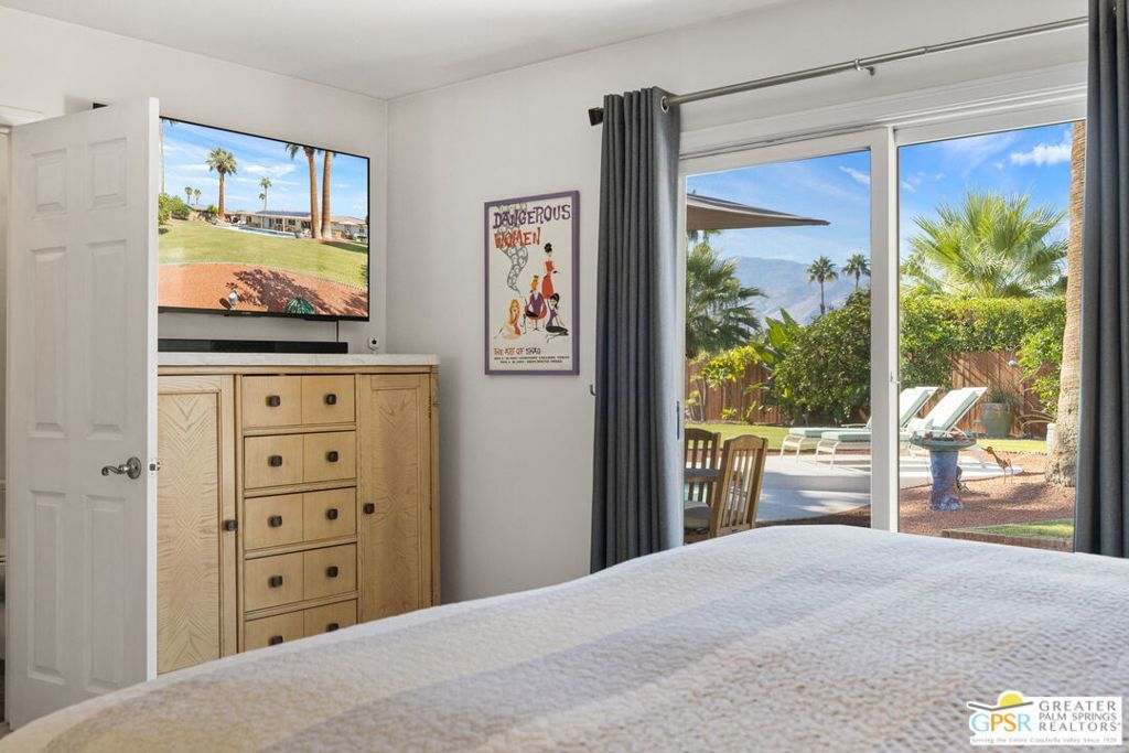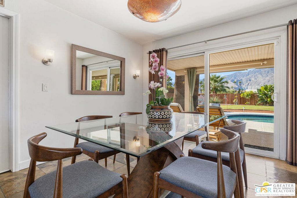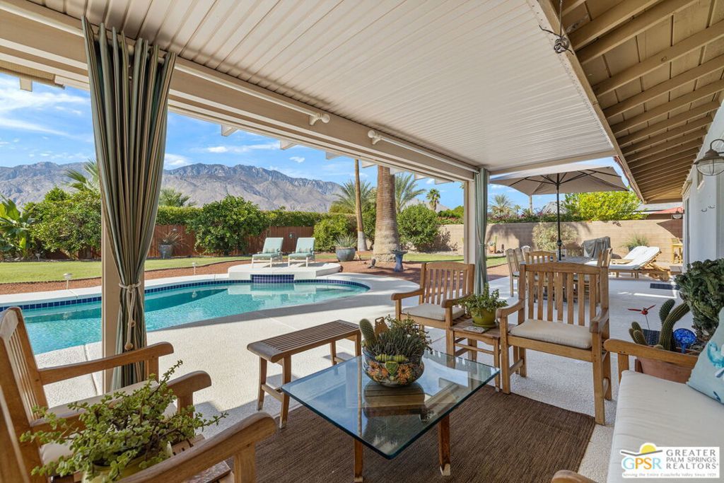 Wow! A rare convergence of privacy, elevation, and panoramic beauty, this Central Palm Springs residence commands one of the area's most compelling settings. Offered for the first time in over twenty years, the home captures sweeping 180 degree views anchored by Mount San Jacinto, with sightlines that extend to San Gorgonio and the dramatic canyon beyond. The outdoor environment defines the experience: layered entertaining spaces unfold around a Pebble Tec pool and spa, framed by mature palms and productive citrus, creating a true desert retreat. A built-in JennAir grill supports open-air dining, while a second covered patio with pool table provides a relaxed, resort-style gathering space ideal for both intimate evenings and larger celebrations. Entry is through a custom front gate into a welcoming foyer that sets the tone for the interiors. The main living area features vaulted, beamed ceilings, a stone fireplace, wet bar, and tile flooring, seamlessly connecting to the formal dining area and a covered patio beyond. The chef's kitchen is both functional and view-focused, equipped with built-in JennAir appliances, double ovens, breakfast bar seating, and clean, contemporary finishes that frame the surrounding mountains. Bedrooms are thoughtfully separated for privacy, all finished with hardwood flooring. The primary suite offers an updated bath and direct outdoor access, reinforcing the indoor-outdoor lifestyle. Guest Bedroom Two, currently configured as an office, shares a full bath with Guest Bedroom Three, which includes dual vanities and convenient access to the pool area. Efficiency and comfort are enhanced by PAID-FOR SOLAR installed in 2023, along with Low-E dual-pane windows and sliders, upgraded attic insulation and ductwork, plantation shutters, an insulated garage door, refreshed exterior stucco and paint, and B-Hyve smart irrigation. The attached two car garage includes built-in cabinetry and upgraded flooring. Set on FEE LAND, you own it, this property also holds current eligibility for a city-issued SHORT TERM RENTAL permit. Completing the experience is a front-row seat to one of Palm Springs' most iconic natural moments: the shifting Tahquitz "Witch" shadow cast across the canyon, a striking reminder of the desert's quiet magic.