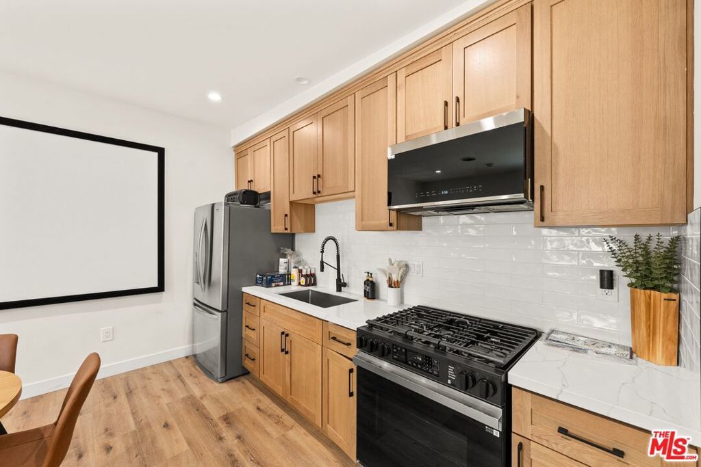 Welcome to 3873 Roxton Ave, a beautifully crafted Spanish-style ADU that perfectly blends character and contemporary design. This thoughtfully designed home offers a bright, open layout enhanced by luxury finishes and smart features throughout ideal for anyone seeking a stylish and efficient living space in the heart of the city. Step inside and you'll immediately notice the warm oak cabinetry, Jaypura quartz countertops, and matte black fixtures that define the modern kitchen. The space is both functional and inviting, featuring a full suite of stainless steel appliances, a gas range, and plenty of storage. The living area is perfect for relaxing or entertaining, complete with built-in surround sound speakers and a ceiling-mounted projector setup creating your own home theater experience. In the spa-inspired bathroom, sleek design meets comfort: muted green subway tiles, a walk-in glass shower, and a custom oak vanity with designer lighting and black hardware deliver a boutique-hotel feel. Enjoy the convenience of in-unit laundry stackable washer/dryer hookup, a high-efficiency mini-split system for heating and cooling, and energy-efficient dual-pane windows that fill every room with natural light. Step outside to your private patio, Spanish-style exterior details with a black modern entry door and terracotta roofline accents a perfect touch.