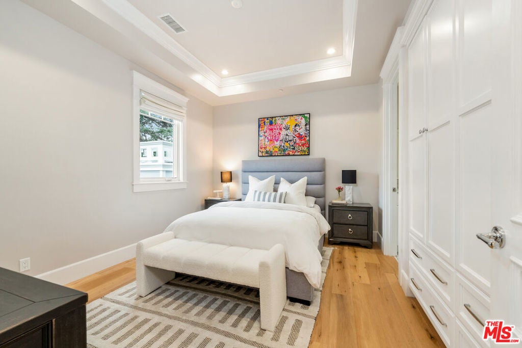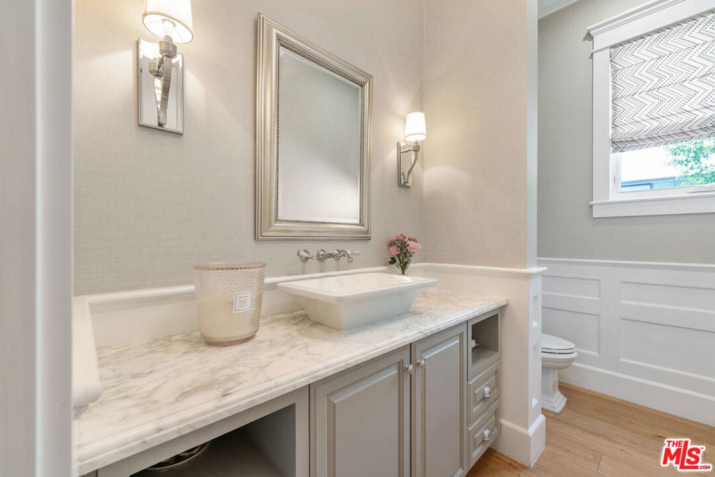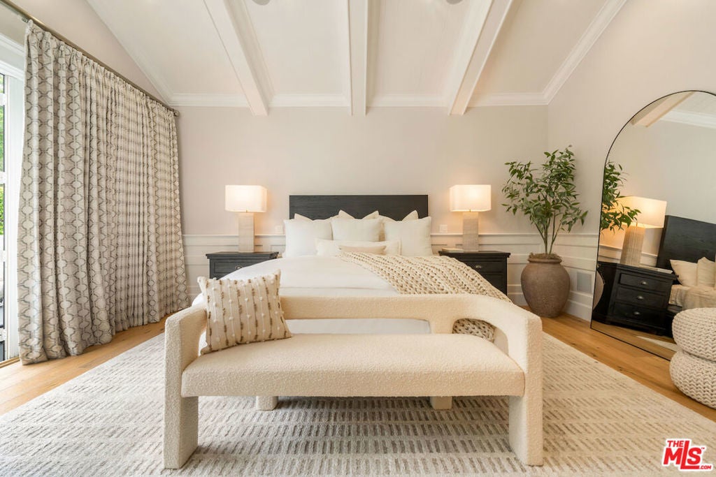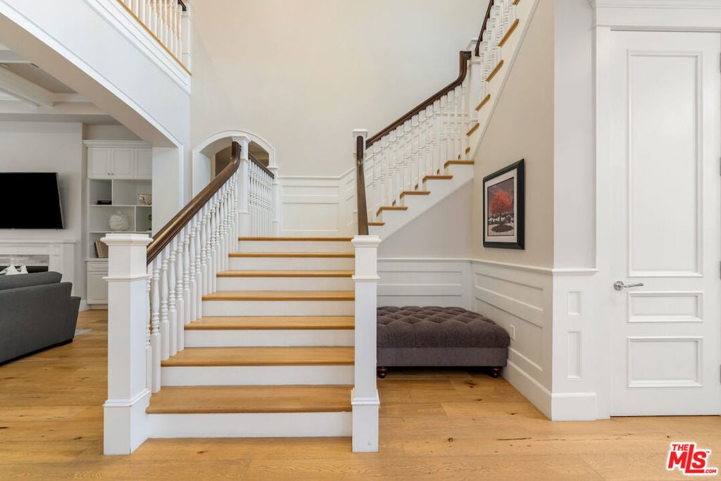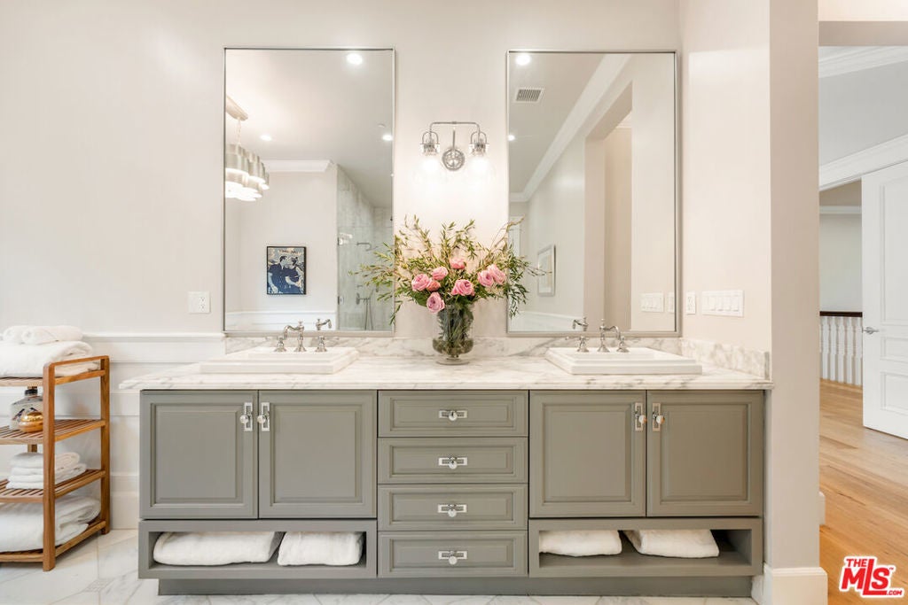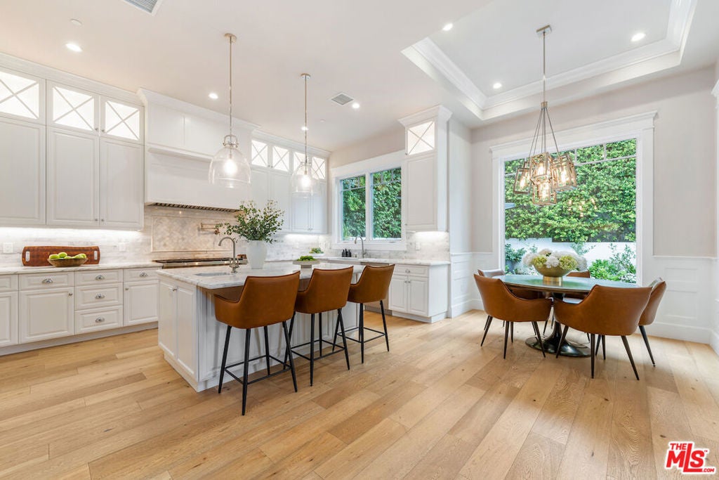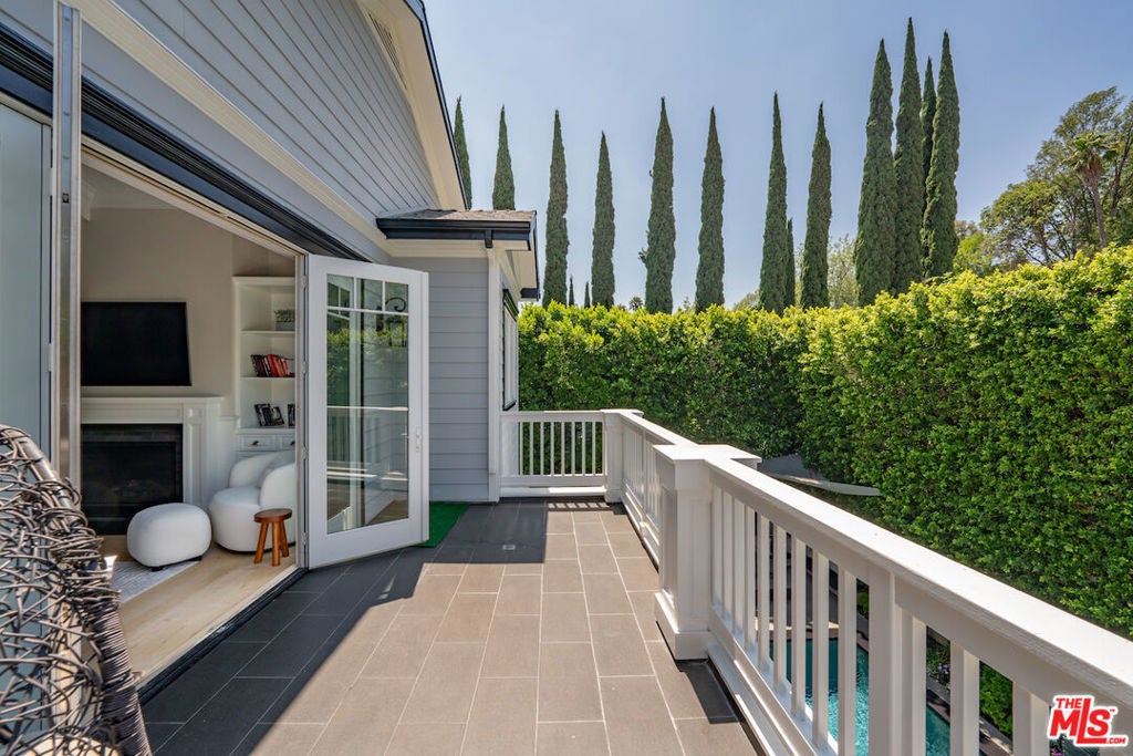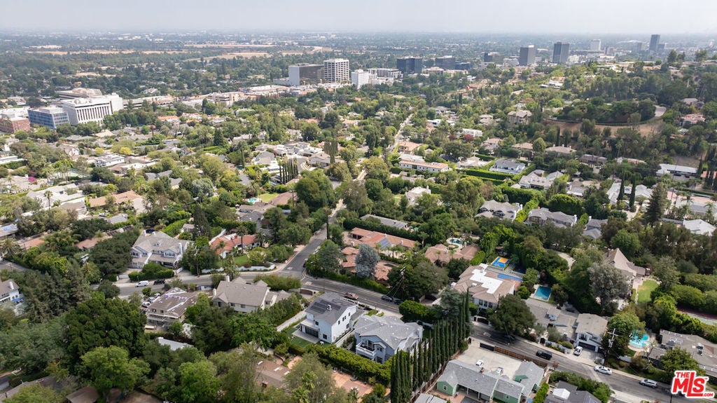 Privately tucked south of Ventura Blvd, this elegant 5 bedroom, 6 bathroom estate offers a seamless blend of timeless sophistication and modern comfort. Thoughtfully designed, the home opens with formal Living and Dining Rooms that flow effortlessly into a spacious Family Room, complete with fireplace and Fleetwood pocket doors that extend the living space to resort-style grounds. At the heart of the home, the Chef's Kitchen is both striking and functional, showcasing a dramatic marble island, custom cabinetry, professional-grade Sub-Zero/Wolf appliances including an 8-burner range and a generous walk-in pantry. Outdoors, a private grassy yard sets the stage for entertaining and relaxation alike, with a zero-edge pool and spa with cascading waterfall, multiple fire pits, built-in BBQ with sink, and covered patio for year-round enjoyment. Mature landscaping and private rose garden provide a serene finishing touch. Each bedroom includes its own ensuite bath, while the expansive Primary Suite offers a private balcony, custom walk-in closet, and spa-inspired bath with striking tile work, dual vanities, and a freestanding tub. Additional features include dual-zone air conditioning, Control4 technology, surround sound, intercom system, LED lighting, and a security gate with cameras, all enhancing the home's modern livability. Just moments from Encino Commons, San Vicente Mountain Park trails, and convenient freeway access, this estate also lies within the highly sought-after Lanai School District delivering the perfect balance of luxury, privacy, and location.