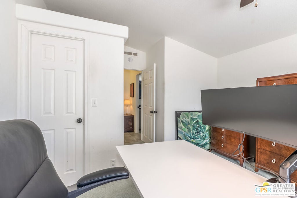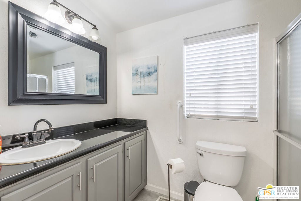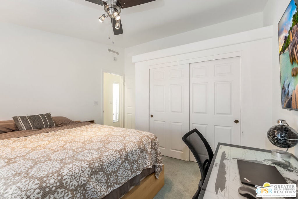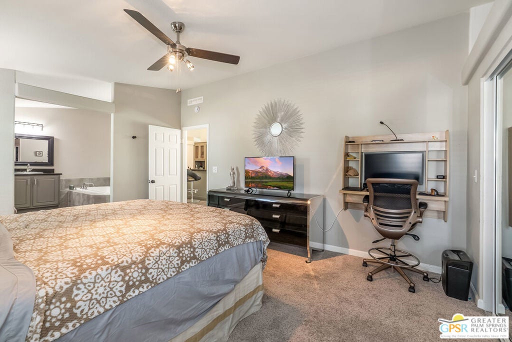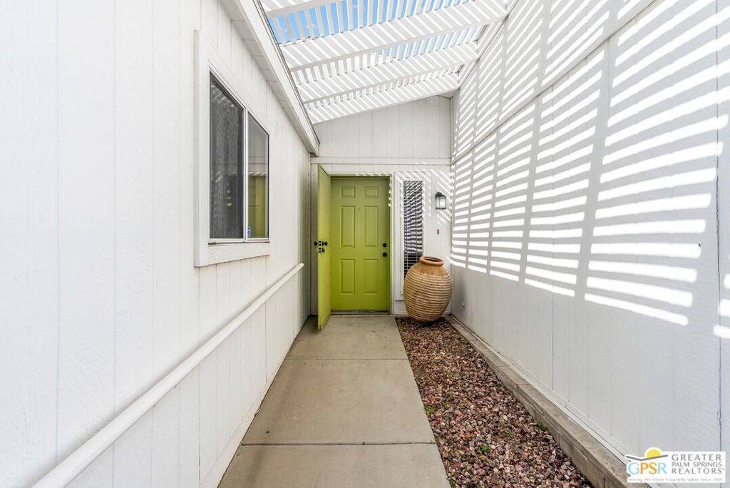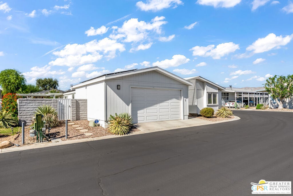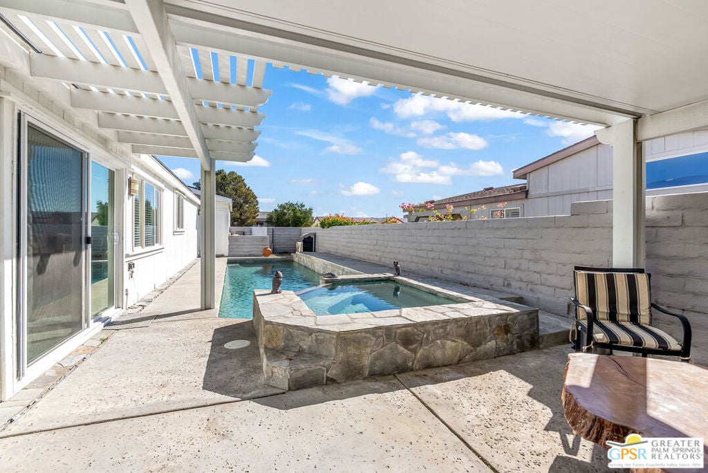 What's behind the chartreuse door? This home is an entertainers paradise with an open-concept layout spanning nearly 2,200 square feet. In the kitchen you will find stainless steel appliances and endless counter space that flows into the expansive living and dining room with vaulted ceilings in a home flooded with natural light. You will find no shortage of areas to relax, entertain, or even enjoy your private bar when guests are over. The oversized master suite is your sanctuary to rejuvenate, with plenty of distance from the guest rooms for added privacy. Outside you have a private, walled-off yard with your own private pool and spa. Making all this even better is the fact you have 35 solar panels helping to utilize our abundant desert sunshine and keep your monthly electrical payments at a minimum. You also have an attached two-car garage with laundry inside, new water heater, and the HVAC system is only 2 years old. The home is on a permanent foundation with a 433a certificate, so it qualifies for conventional lending options. And when you thought it couldn't get any better, this incredible home is located in the guard-gated community of Vista Montana. A friendly, social community for those ages 55 and better. The community has a clubhouse with onsite property management, resort-style pools and spas, a billiard room, card room, sauna, fitness room, a designated dog area, and plenty of beautiful greenery to enjoy on your morning walks. This is the home you've been waiting for. Schedule a tour today, and come see your new desert paradise!
