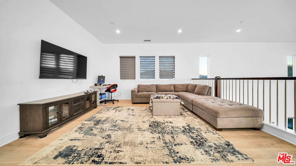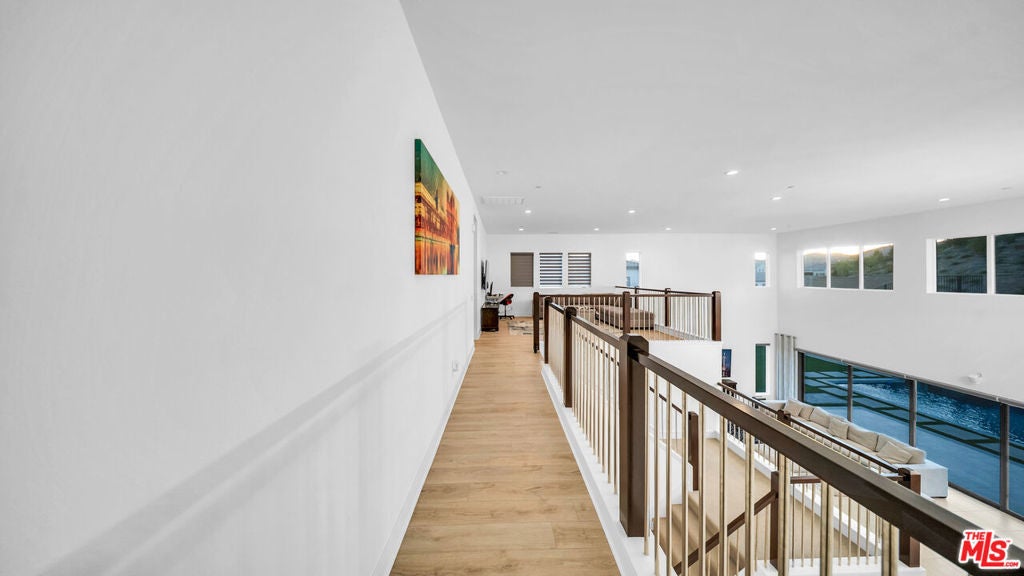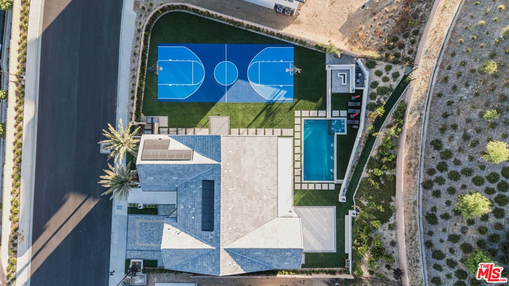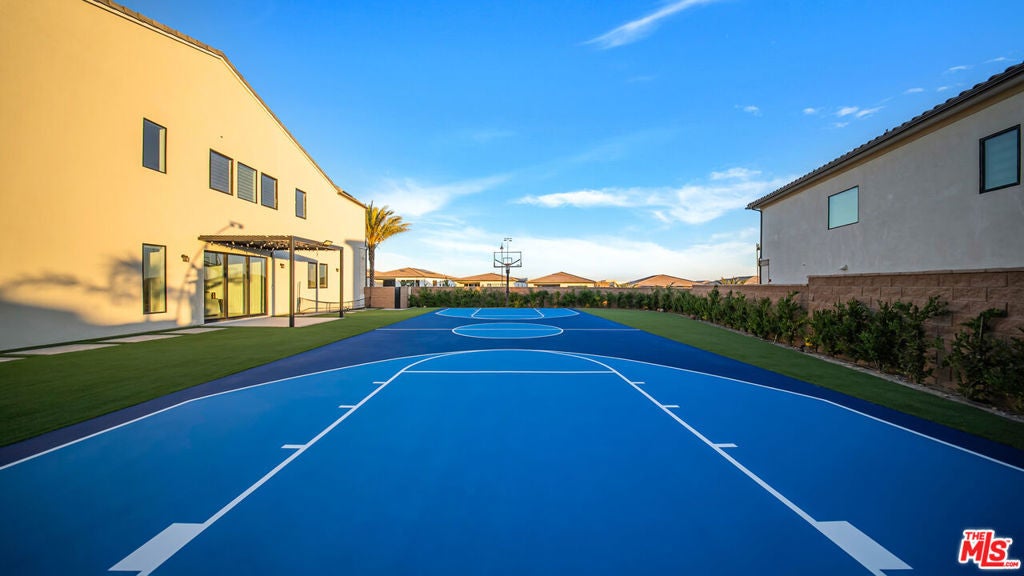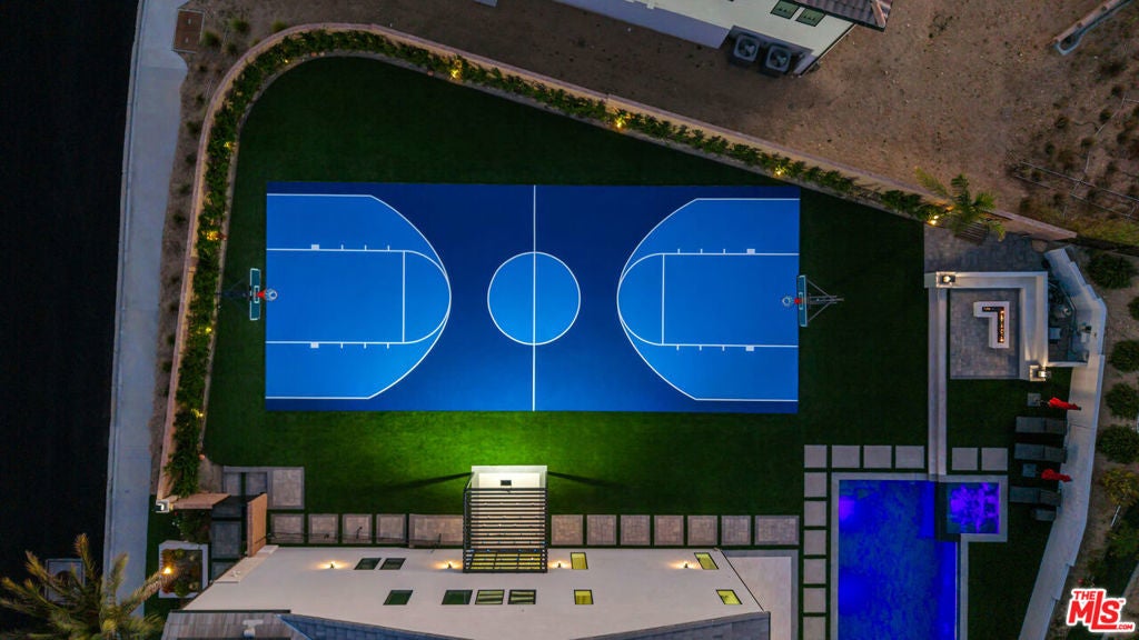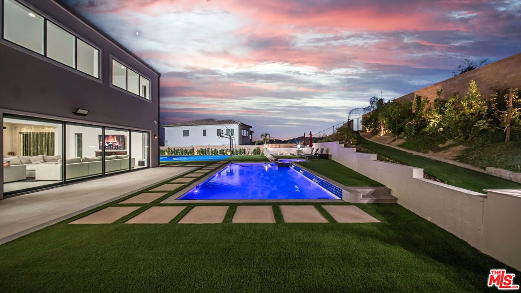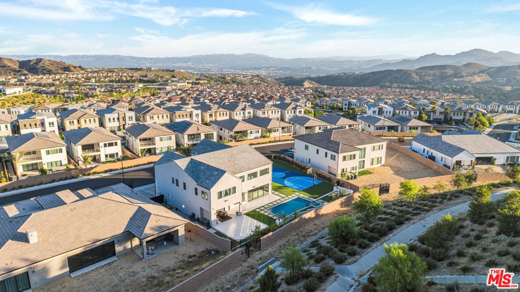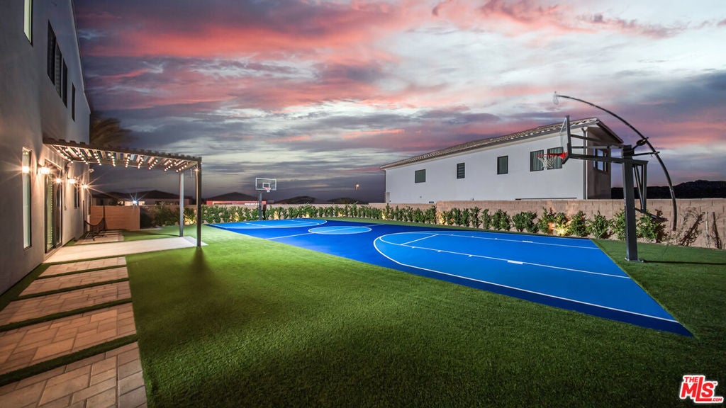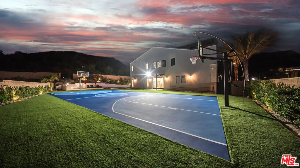 An Extraordinary Estate in Porter Ranch's Prestigious Ridge Collection. Perched high in the exclusive, guard-gated hills of Porter Ranch, this nearly new architectural masterpiece offers an elite level of luxury living with beautiful Sunset and Hillside views. Set on a one-of-a-kind, over 20,000 sq ft flat lot, this residence boasts an unrivaled resort-style backyard designed for both grand entertaining and everyday indulgence. Outdoors, you'll find a FULL BASKETBALL court, a sparkling pool & spa with cascading fountains, a fully equipped outdoor BBQ, a covered lounge patio, and a cozy fire pit area with seating for up to ten, perfect for unforgettable gatherings under the stars. Inside, the inviting entry and extended foyer lead past a sophisticated dining room into the expansive great room and casual dining area, each showcasing views of the luxurious outdoor living space. The gourmet chef's kitchen features a massive quartz-stone island with breakfast bar, abundant cabinetry, premium appliances, and a spacious walk-in pantry. The enormous primary suite is a true sanctuary, highlighted by elegant coffered ceilings, a palatial walk-in closet, and a spa-inspired bath with dual vanities, a soaking tub, a luxe glass-enclosed shower, and a private water closet. A convenient lower-level bedroom with ensuite bath is ideal for guests, while upstairs offers four additional spacious bedrooms, a light-filled loft, and a well-appointed laundry room. The 3-car garage provides ample storage and convenience. All of this is located moments from the top-rated Porter Ranch Community School (TK8), Sierra Canyon School, upscale dining, shopping, and the brand-new 50-acre Porter Ranch Park. Move-in ready NO NEED TO WAIT FOR BUILD OUT! Designed to impress this is more than a home, it's a lifestyle statement. Click the VIRTUAL TOUR link for a full video.