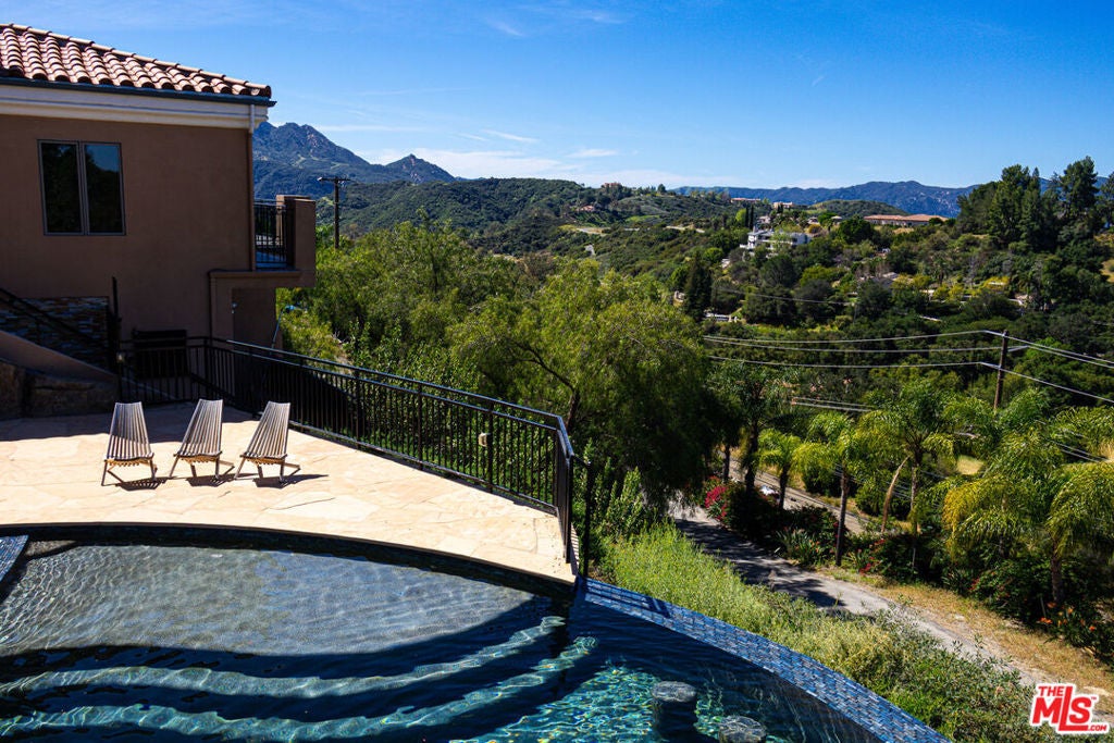 Gated Estate | Fully Landscaped | Unforgettable Views Tucked into the tranquil beauty of the Santa Monica Mountains, this estate is a rare findblending architectural elegance with nature's finest views. Perched just off the iconic Mulholland Highway and resting on nearly an acre of fully landscaped land, this 4,579 sq. ft. residence offers an unmatched lifestyle.Enjoy some of the most breathtaking views in the entire Santa Monica Mountain range, with sunsets off the patio that will truly take your breath away.Originally built in 2008, the home features a brand new negative-edge pool and spa oasis, complete with cascading waterfalls for a true resort-style experience. The outdoor space is an entertainer's dream, boasting a fully equipped kitchen with a built-in pizza oven, high-end grill, and prep areaall set against a stunning mountain backdrop. Inside, the chef's kitchen is outfitted with a Viking 8-burner stainless steel range and an oversized center island, perfect for hosting and everyday living. Throughout the home, you'll find beautiful hardwood flooring, along with rich alder wood finishes including custom casement windows, French doors, interior doors, and baseboards.The main level offers light-filled living areas with a southwest-facing orientation, while four spacious bedrooms are located on the lower level. There is also ample room to further customize the home to your vision. Located just seconds from Viewpoint School and within the award-winning Las Virgenes Unified School District, this gated estate is ideally positioned just minutes from Malibu's beaches and the Calabasas Commonsoffering the perfect blend of natural serenity and everyday convenience.