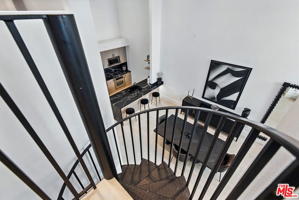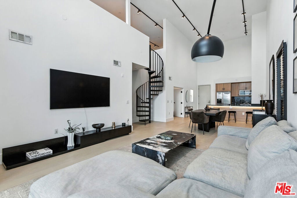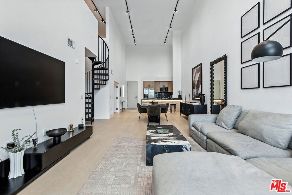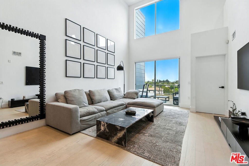 This stunning two-story penthouse offers 2 bedrooms, 2 bathrooms, plus a versatile loft (possible 3rd bedroom), with soaring nearly 20-foot ceilings. Walls of glass frame unobstructed city and mountain views stretching all the way to the Hollywood sign making this residence truly one of a kind. Designed with a sleek, contemporary aesthetic and recently renovated, the home is filled with natural light and features wide-plank white oak flooring throughout living spaces. The spacious living room flows seamlessly into the chef's kitchen, appointed with waterfall-edge Caesarstone countertops, a custom tile backsplash, stainless steel appliances, and a breakfast bar perfect for entertaining or everyday living. One patio extends from the open living and dining areas, creating effortless indoor-outdoor living. The primary suite is a tranquil retreat with a large walk-in closet and a spa-inspired en-suite clad in Carrera marble. A second bedroom also offers its own en-suite bath and custom closet, while the loft provides flexible space for a third bedroom, home office, or creative studio complete with its own 2nd private patio space. Additional highlights include in-unit laundry, central air and heat, custom lighting, two dedicated parking spaces with EV charging, and access to thoughtfully curated community amenities: BBQs, an outdoor fireplace, lounge seating, herb gardens, and citrus trees that create a serene urban oasis. Located in the heart of the Marina del Rey Arts District, this Silicon Beach adjacent residence is moments from Marina Marketplace dining and shopping, with easy access to the 90 freeway and LAX for a seamless coastal lifestyle.
