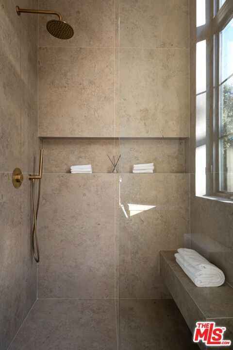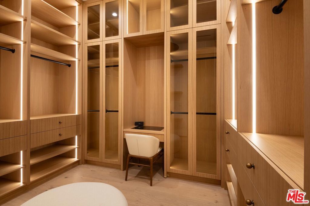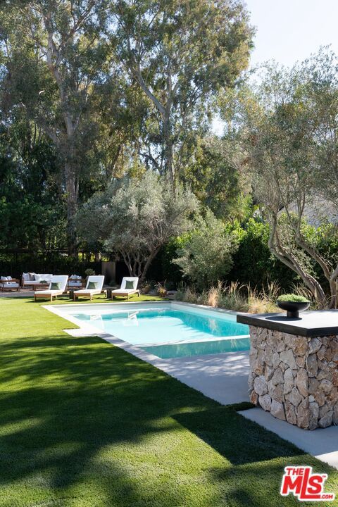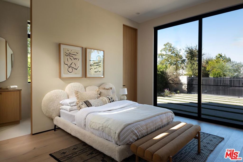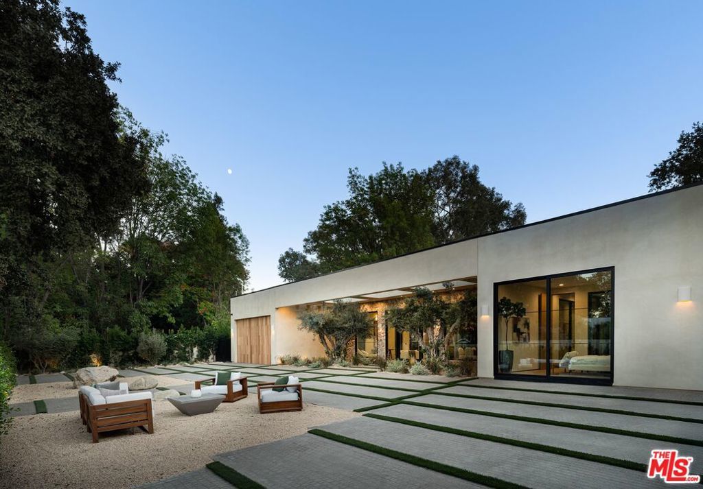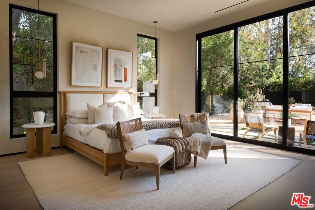 Step into this stunning single-story home situated in the highly sought-after Walnut Acres enclave of Woodland Hills. Designed as a modern nature retreat, this 4BD/4.5BA home celebrates California living and embraces the outdoors in every room. Upon entering, you are greeted by a warm living area, where white oak floors flow effortlessly into the formal dining room with an elegant built-in bar. A gorgeous atrium sits at the heart of the home, infusing the interiors with natural light and a serene connection to the outdoors. The bright kitchen is equipped with Jenn Air appliances including a dual fuel range with a chrome-infused griddle, rustic white oak cabinetry, and an expansive island that invites effortless entertaining. The adjoining family room features built-in shelving and impressive floor-to-ceiling pocket doors that open completely to the backyard, elevating the space. A stylish powder bath is conveniently positioned off the entry, ideal for guests. Tucked along the left hallway, the remarkable primary suite is designed for luxury living with floor-to-ceiling windows, a custom-designed walk-in closet, and private access to the backyard. The sleek primary bath showcases a wet room design with dual vanities, a soaking tub, an oversized shower with built-in bench, and sliding doors that open to a secluded side yard. Located on the opposite wing of the home, the three additional bedrooms include their own en-suite bath and generous closet space. Each secondary bedroom features sliding doors to its own peaceful patios, continuing the home's indoor-outdoor flow. Enjoy endless space for both entertaining and intimate evenings in the backyard, including a sparkling pool with a baja shelf, spa, built-in barbecue, expansive lawn, and multiple lounge areas surrounded by lush greenery. With exceptional craftsmanship and a premier location on Collins Street, this property captures the true essence of Walnut Acres living.