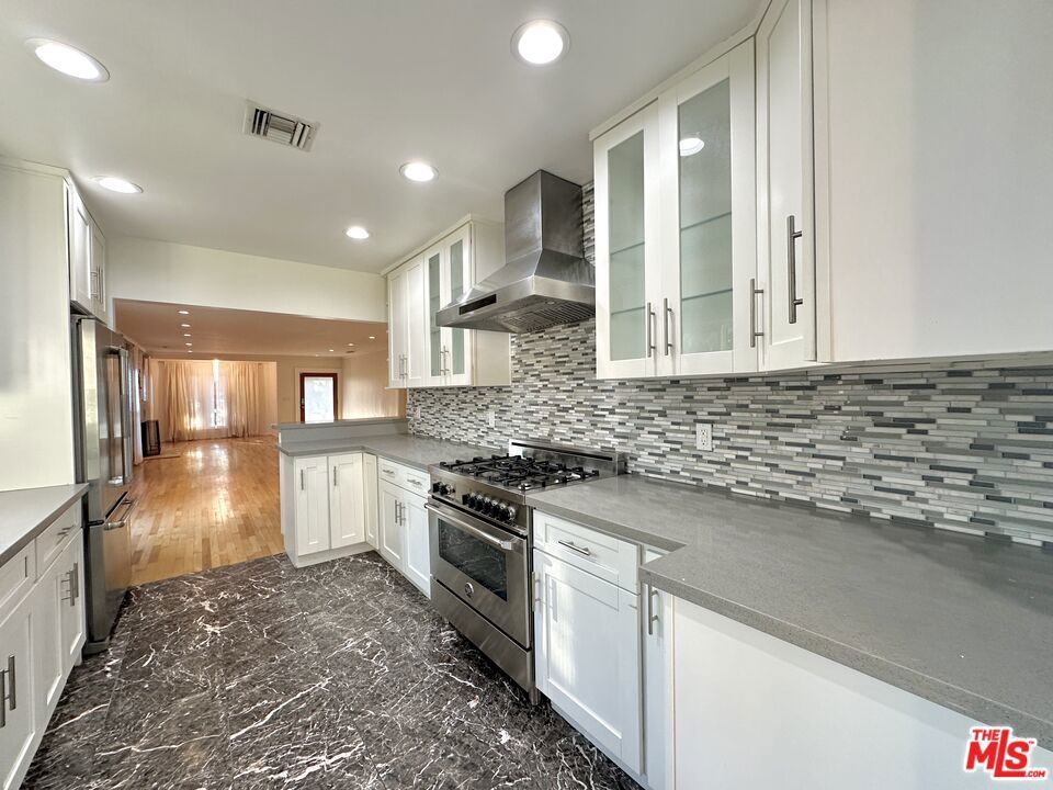 Enjoy the West Hollywood lifestyle in your private large sparkling pool on this gated home with 4 bedrooms and 3 bathrooms including a separate guest house, and a grassy backyard! It's great for entertaining open floor plan includes living, dining, family room all with gorgeous hardwood floors throughout, and modern fireplace. Newly remodeled kitchen with granite countertop w/ backsplash, stainless steel appliances and custom-made cabinetry opens up the dining area, making it a perfect entertaining space. The master suite has a direct access to a large veranda that overlooks the large pool area. Guest House is detached with full bathroom. Long gated driveway with remote control access for two cars. Lot is almost 6300 square ft. Enjoy the West Hollywood Lifestyle!