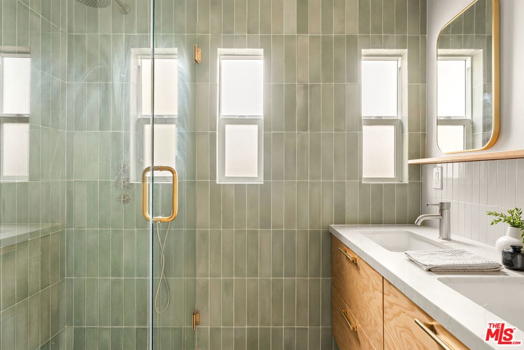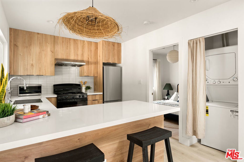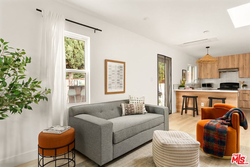 This timeless Spanish bungalow blends classic charm with modern updates, complemented by a clean modern ADU. The front home features 2 spacious bedrooms and a beautifully remodeled bathroom showcasing a dual vanity and designer tiles. The inviting kitchen includes a cozy breakfast nook overlooking the rear yard, perfect for morning coffee or casual dining. A finished one-car garage offers flexibility as a studio, gym, or creative workspace. The rear ADU is thoughtfully designed with 2 bedrooms and 1 bath perfect for rental income or extended family. Its modern kitchen features a breakfast bar with quartz countertops and newer appliances, while abundant natural light and an in-unit washer and dryer add comfort and charm, making it feel instantly like home. Situated thoughtfully on the lot, both homes enjoy excellent separation and generous usable yard space ideal for outdoor living or entertaining.