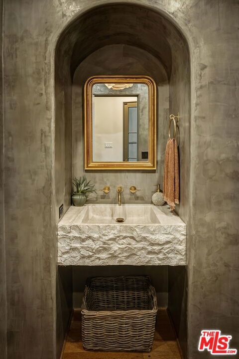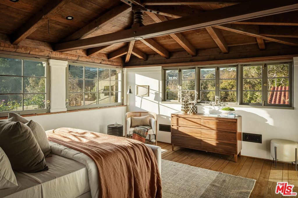Nestled at the end of a long gated drive in Lower Mandeville Canyon, La Casa De Flores is a Spanish Revival estate of rare provenance and timeless beauty. Designed in 1929 by acclaimed architect John Byers and thoughtfully reimagined for modern living, the home sits on nearly an acre of lush, secluded grounds, offering an atmosphere that feels both grand and deeply inviting. Inside, the craftsmanship of the original era remains intact -- with wood-beamed and coffered ceilings, rich hardwood floors, graceful French doors, and hand-crafted casement windows. Sculptural designer lighting fixtures punctuate the interiors, enhancing the interplay of light and texture throughout. The formal living room, framed by garden views, is anchored by a stone fireplace and crowned by thick, solid wood beams. The formal dining room opens to verandas on both sides, creating effortless flow for gatherings, while the warm, inviting family room is wrapped in custom built-ins. The fully remodeled gourmet kitchen blends elegance and function with stone countertops, custom cabinetry, and an expansive dual-surface marble and butcher block island. A Lacanche range sits within a bespoke alcove, complemented by a walk-in pantry. Adjacent, the glass-topped atrium breakfast room dazzles with direct access to the outdoor kitchen and al fresco dining patio outfitted in vibrant Spanish tile and an original fountain. The primary wing offers a serene retreat with a private covered balcony, far-reaching canyon vistas, a corner fireplace, and a designer walk-in dressing room. Its en suite bath, bathed in natural light, features dual marble vanities and a custom-tiled shower. Four additional guest suites, including two joined by a Jack-and-Jill bath, provide comfort and flexibility. A detached office with a tranquil handpainted mural and expansive windows offers an inspiring workspace, while a coved wine cellar adds an indulgent touch. The grounds are a true sanctuary -- mature fruit trees, flowering gardens, peaceful fountains, and sweeping lush views frame a 55-foot swimmer's pool, brick patios, and a pergola lounge with firepit. Accessory structures and a three-car garage complete this rare and private compound, just moments from Brentwood's finest restaurants, boutiques, and top-rated schools. Blending architectural pedigree with modern comfort, La Casa De Flores is not merely a home -- it's a priceless work of art in one of Los Angeles' most coveted neighborhoods.