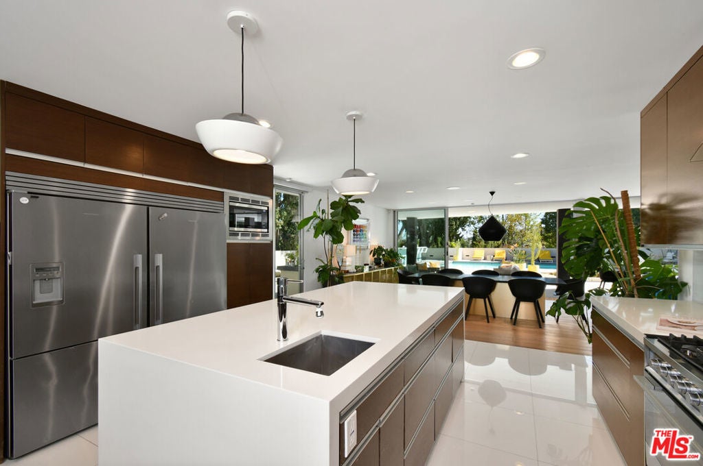 Mid-Century Modern. Palm Springs Soul. Woodland Hills Views.Experience the essence of elevated California living in this exquisite single-story Mid-Century retreat, reimagined with sophisticated Palm Springs energy. Privately gated and perfectly sited on a premier 26,000 sq. ft. pad, this 4-bedroom, 5-bath architectural showcases a seamless harmony between timeless design and relaxed luxury.Step inside to a sunlit great room where clean lines and curated textures create an atmosphere of modern serenity. The open living area unfolds effortlessly a fireside lounge, TV retreat, dining space, and a chef's kitchen designed for connection and flow. Walls of glass invite the outdoors in, revealing panoramic treetop and city-light views.The backyard is pure California magic a sparkling pool and spa, firepit, multiple patio lounges, and a conversation outdoor bar framed by desert-inspired landscaping and views of the mountain's and city lights beyond. It's the ultimate entertainers' oasis.The chef's kitchen stands as a contemporary showpiece, featuring Wenge cabinetry, artisan glass backsplash, premium stainless appliances, and an 8-foot waterfall island that anchors the open-concept design.The bedroom wing features a tranquil primary suite captures resort-style living, with sliding glass doors opening to the private outdoor retreat. The sumptuous primary bath is bathed in natural sunlight and offers an oversized dual-head shower, deep soaking tub, and elegant double vanity. From here, sliding glass doors lead to a serene grassy lawn shaded by mature trees, a perfect space for meditation, morning yoga, or quiet reflection.Every detail has been thoughtfully curated, Porcelanosa and Italian tile bathrooms, hand-stained solid doors, custom aluminum windows, and wide-plank engineered hardwood floors. The gated drive provides ample guest parking and sports court for recreation.A rare opportunity to own an architectural statement revived for today's lifestyle timeless Mid-Century design meets relaxed California luxury in one of the most coveted south-of-the-Boulevard locations.