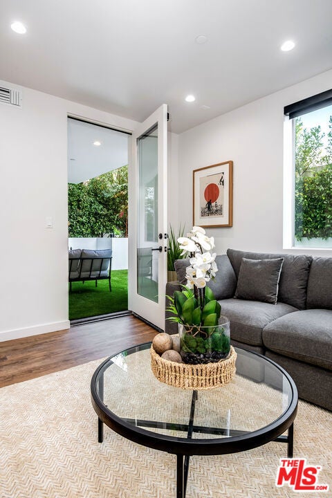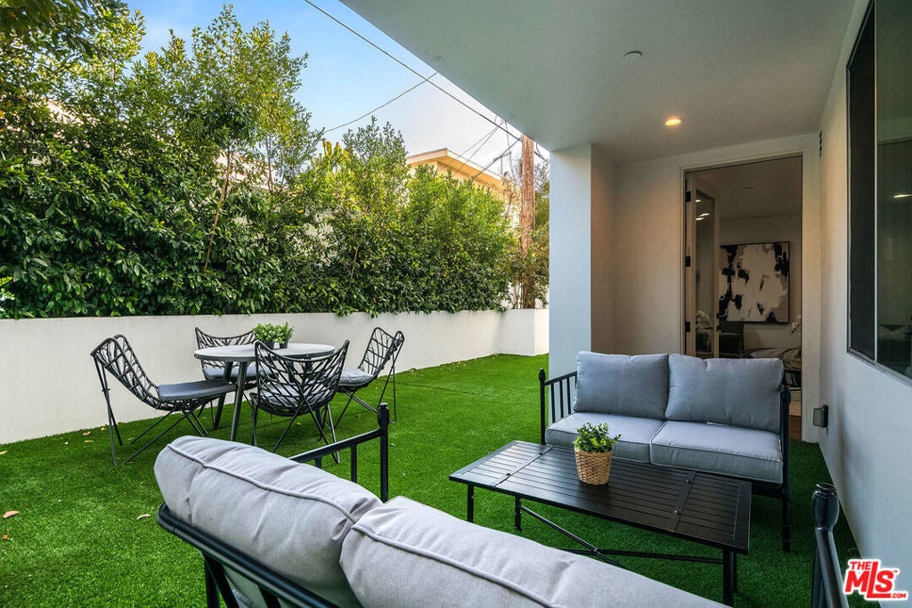 Spacious and fully furnished 1BD/1BA Apartment with rare private backyard in prime Beverly Grove. This well-appointed unit features an open layout with high ceilings, hardwood floors, and direct access to a large private patio from the living room. Modern kitchen with quartz countertops, stainless steel appliances, and custom cabinetry. The oversized bedroom includes a walk-in closet, and the large bathroom offers a soaking tub and glass-enclosed shower. Includes in-unit laundry, central A/C, controlled access, and two gated parking spaces. Located on a quiet, tree-lined street near The Grove, Erewhon, Melrose Place, and top dining and shopping.