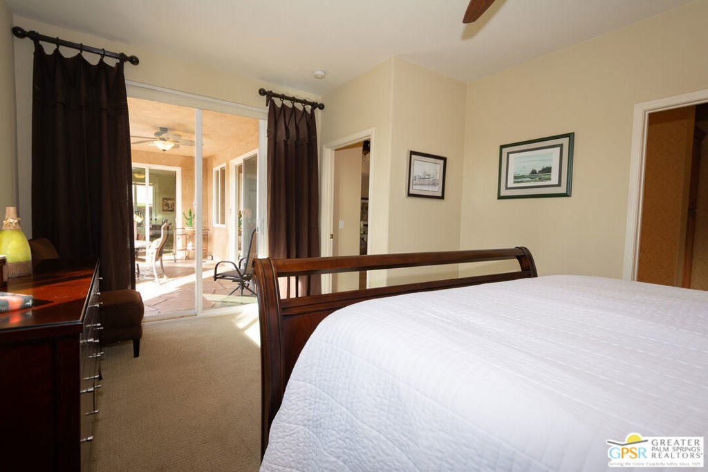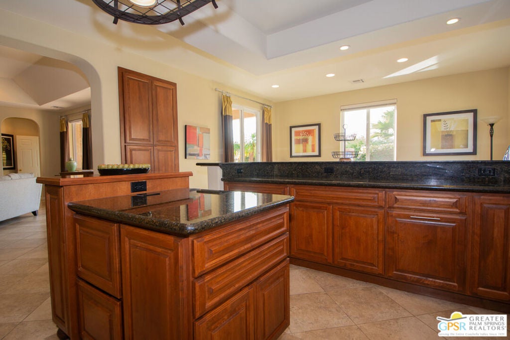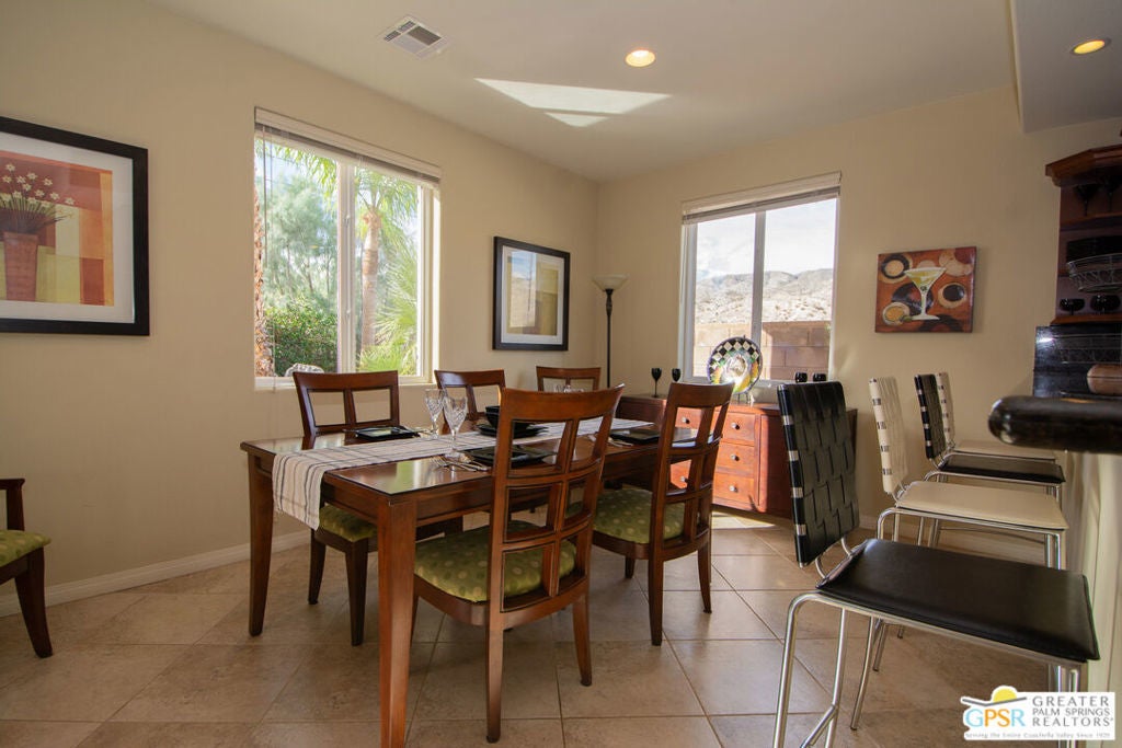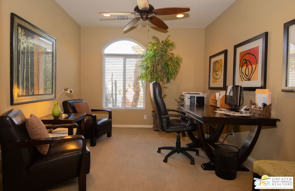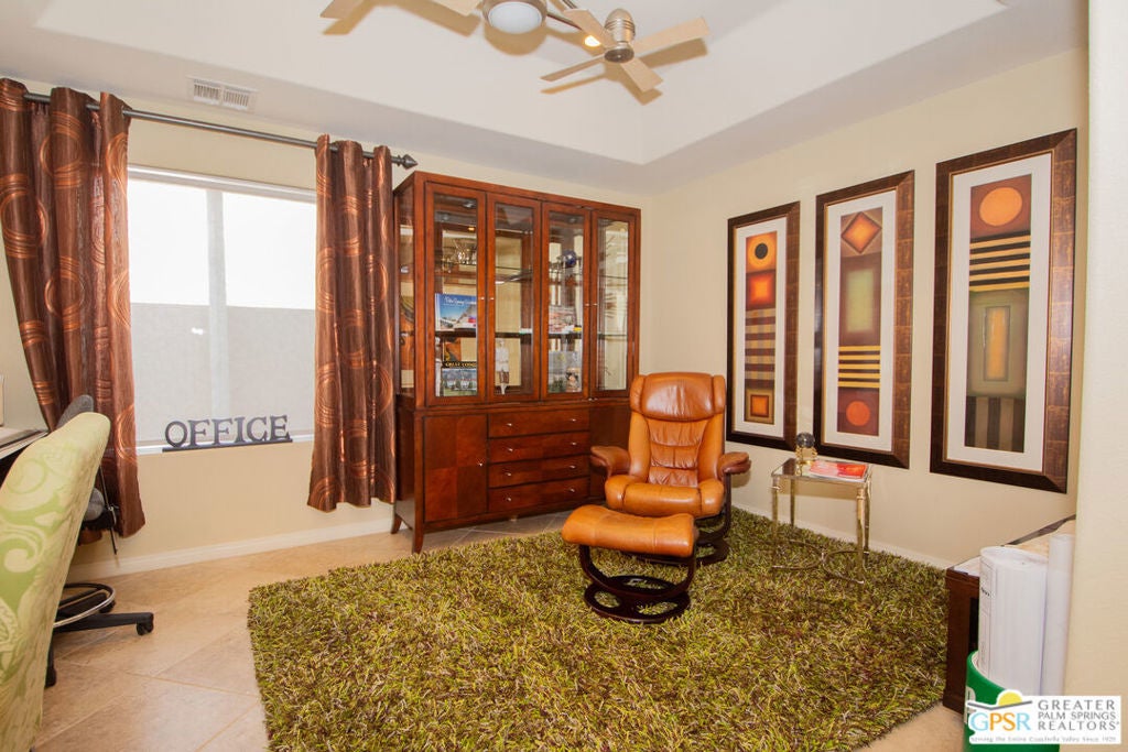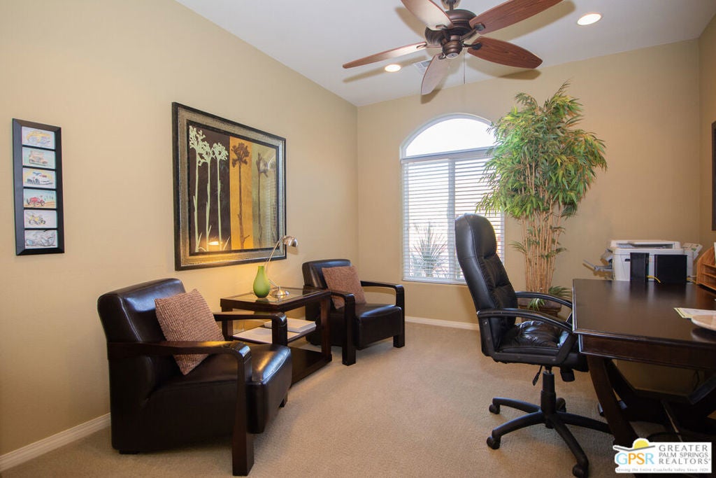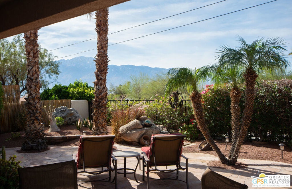 Welcome to 8567 Summit Pass, perfectly positioned on a premium elevated lot within the highly sought-after 55+ gated community of Paradise Springs. This former model home features 2 bedrooms plus a spacious office/den that offers an easy conversion to a true third bedroom, along with 3 baths across 2,338 sqft of bright, inviting living space. The open-concept layout showcases high ceilings, a cozy fireplace flanked by custom built-ins, and a thoughtfully designed kitchen complete with solid-surface countertops, decorative tile accents, and a welcoming breakfast bar. A reverse osmosis water filtration system provides clean, filtered water throughout the home. Indoor living flows seamlessly into the private backyard retreat, where you'll find flagstone hardscaping, a covered patio, and a built-in BBQ ideal for both entertaining and quiet evenings under the desert sky. Enjoy stunning west-facing views of city lights and Mt. San Jacinto, creating a picturesque backdrop year-round. The primary suite opens directly to the backyard and offers a spacious bath and generous walk-in closet, delivering comfort and convenience. Paradise Springs elevates desert living with resort-style amenities, including a clubhouse, fitness center, pool and spas, BBQ/picnic areas, and secure gated access. Residents also benefit from being adjacent to Mission Lakes Country Club, featuring an acclaimed 18-hole championship golf course. With low HOA dues of just $148 per month, this home offers an exceptional blend of comfort, quality, and lifestyle. Schedule your private showing today - opportunities like this are rare.