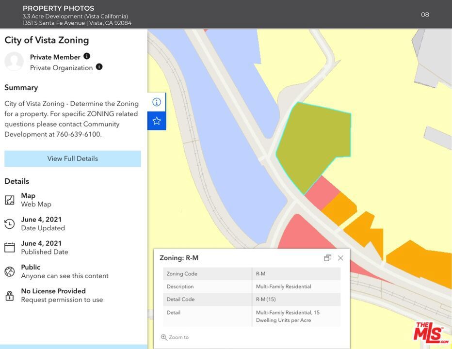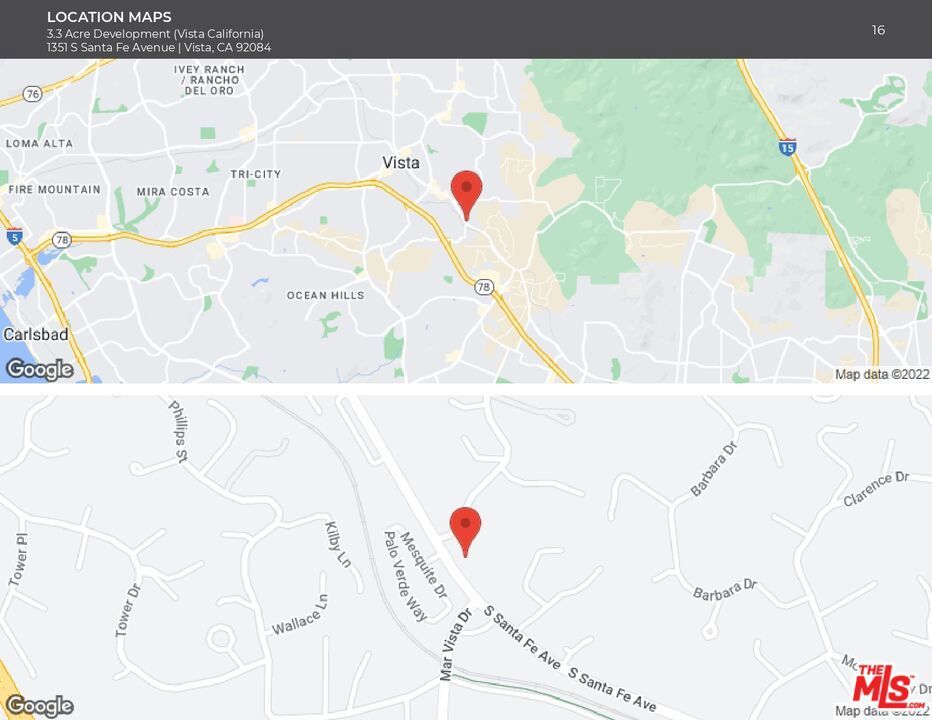 We are proud to exclusively present the Vista California Development located at 1351 S Santa Fe Avenue, Vista, California. This 3.36-acre (146,361 SF) corner parcel, zoned R-M (Medium Density Residential), is prominently situated along the South Santa Fe Avenue Corridor an area undergoing significant transformation under the City of Vista's South Santa Fe Corridor Specific Plan. The property features topography, 290 feet of frontage, and full utility access, creating an ideal foundation for a streamlined and high-quality residential development opportunity. Positioned within a rapidly growing North San Diego County submarket with a population exceeding 100,000 residents, the site sits directly across from a newly completed townhome community and is surrounded by housing, schools, and local retail amenities. Vista continues to experience strong demographic growth, supported by a median household income of approximately $78,800 within one mile, reflecting robust local demand for attainable and modern housing options. The property's R-M zoning offers flexibility for small-lot, townhome, or condominium projects, allowing builders to capture both for-sale and for-rent housing demand. With utilities to the street, no replacement housing requirements, and inclusion in an active redevelopment corridor, the site provides a clear entitlement path and favorable economics for a range of residential configurations. Its strategic proximity to major employment and educational hubs, Kaiser Permanente Vista, Tri-City Medical Center, and California State University San Marcos further strengthens the project's long-term viability and absorption potential. Located minutes from North County Square, Vista Village Center, and LEGOLAND California, the property also enjoys excellent regional connectivity via Highway 78, Interstate 5, and Interstate 15. With its combination of scale, zoning, infrastructure readiness, and prime corner positioning within one of North County's most active residential corridors, 1351 S Santa Fe Avenue represents a premier infill development opportunity offering both immediate feasibility and strong long-term appreciation potential.