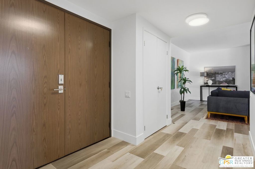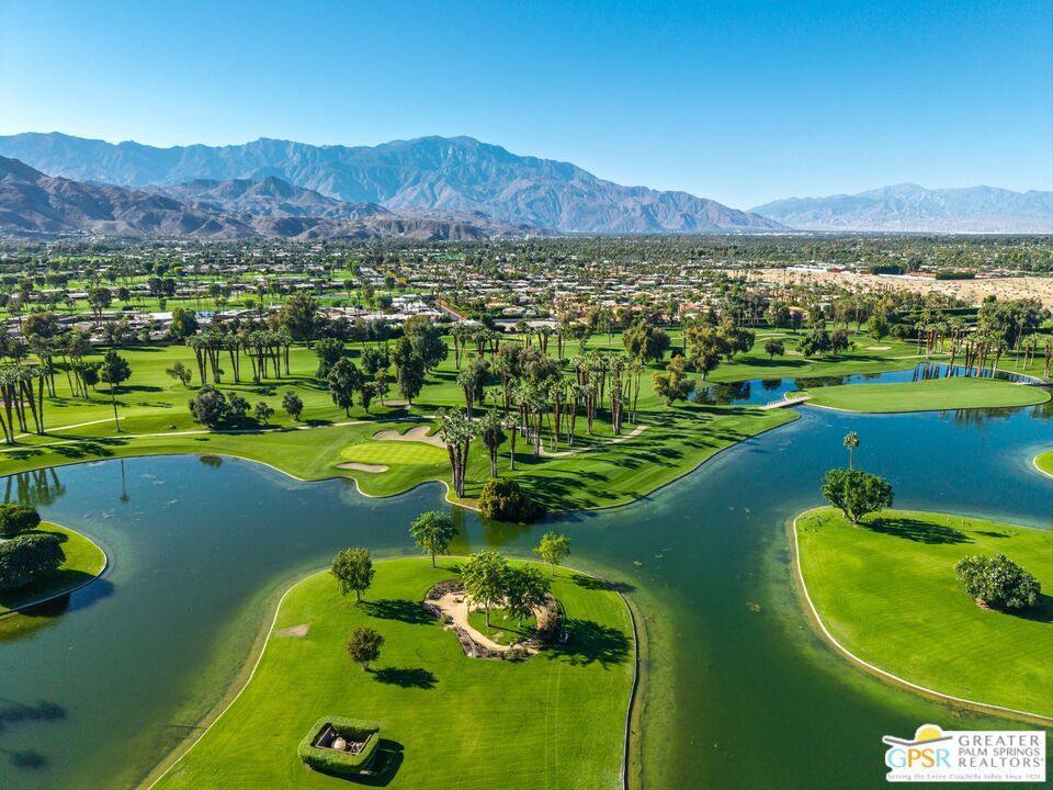 IMPROVED PRICE. Seller Motivated. This exquisitely remodeled residence showcases breathtaking southern views of the Santa Rosa Mountains, shimmering lake, and lush golf course visible from nearly every room. Step onto your expansive 500 sq. ft. covered terrace, the perfect setting to unwind, entertain, and embrace the quintessential indoor-outdoor desert lifestyle. A formal entry welcomes you into a bright and spacious living room featuring wood-look ceramic tile floors, a cozy gas fireplace, and dramatic 9-foot walls of glass that open seamlessly to the terrace. The modern chef's kitchen impresses with sleek quartz countertops, custom cabinetry, and stainless-steel appliances all in a serene, neutral palette. Both bathrooms have been beautifully updated with quartz vanities, designer tile, and contemporary fixtures, adding to the home's refined appeal. Set within the exclusive Desert Island community a gated, mid-rise enclave surrounded by a sparkling lake and an impressive 18-hole golf course residents enjoy resort-style amenities including scenic walking paths, tennis and pickleball courts, heated pools and spas, and 24-hour guard-gated security. HOA dues conveniently cover cable TV with HBO/Showtime, high-speed Wi-Fi, water, gas, trash, and more. Ideally situated in the heart of Rancho Mirage, just moments from Eisenhower Health, Sunnylands, and world-class shopping and dining, this sophisticated home offers the perfect blend of comfort, style, and convenience. Some furnishings may be available per seller inventory.