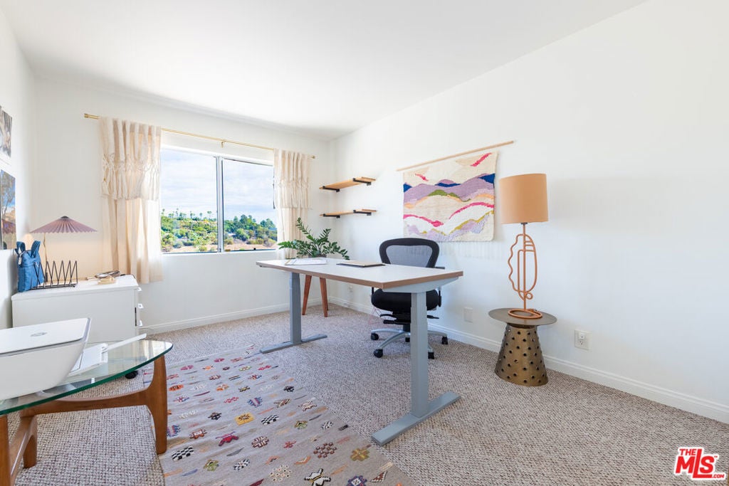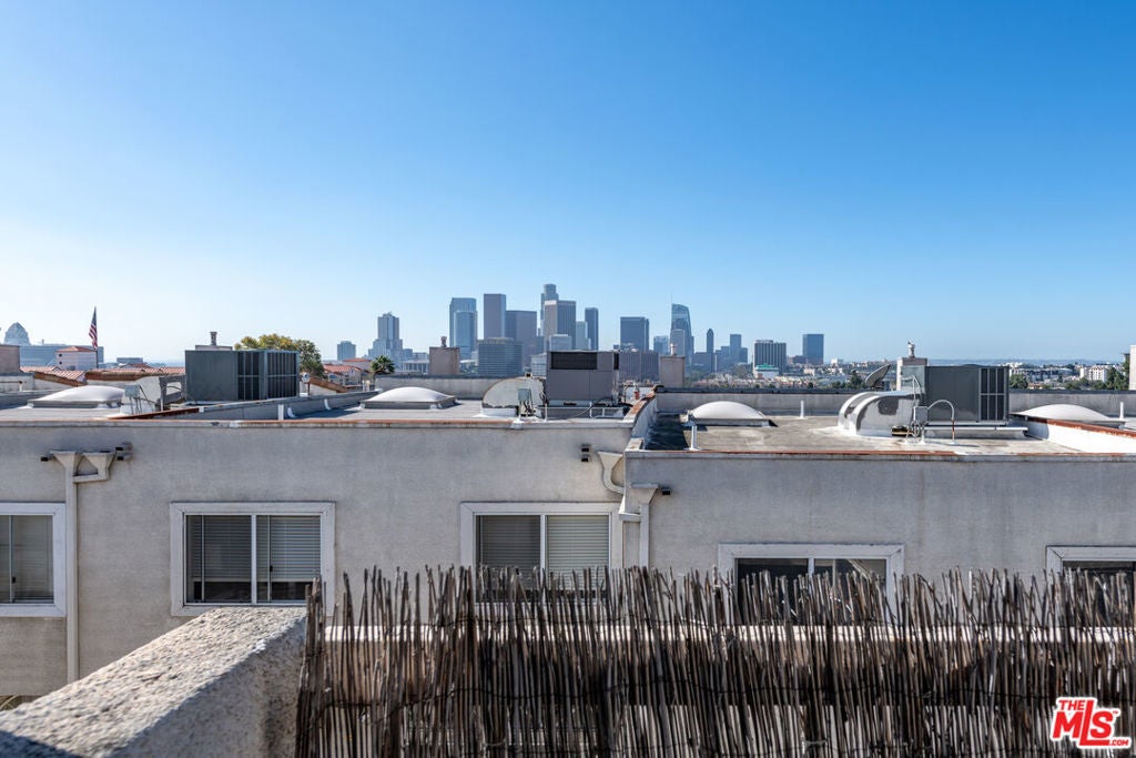 Perched atop Victor Heights in a secure gated community, this beautiful multi-level townhouse offers panoramic views of the Downtown Los Angeles skyline & Dodger Stadium. Combining comfort, convenience, & style, it's a perfect retreat in one of LA's most vibrant and connected neighborhoods. Step through the front door into an open & bright living room with high ceilings, wood floors, & access to an outdoor patio; ideal for outdoor dining, or enjoying a morning coffee. Just up the split-level staircase is the spacious dining area leading into the remodeled kitchen, featuring granite countertops, a full suite of appliances including stove, oven, microwave, & dishwasher, & ample counter space for food prep. The stunning primary bedroom comfortably fits a king-size bed and features a walk-in closet, a hotel-quality ensuite bathroom, & a private balcony with incredible skyline views. Two additional bedrooms offer flexibility for guests, a home office, or a yoga space, each easily accommodating a queen-size bed. Additional highlights include central heat & air, elegant wood shutters throughout, an attached double garage with parking for 2 cars & in-garage laundry, plus guest parking within the gated community. Located near Chinatown, Downtown LA, and Echo Park, this home offers easy access to an array of cafes, restaurants, shops, and entertainment; a rare opportunity to enjoy both tranquility and proximity to the best of Los Angeles living.