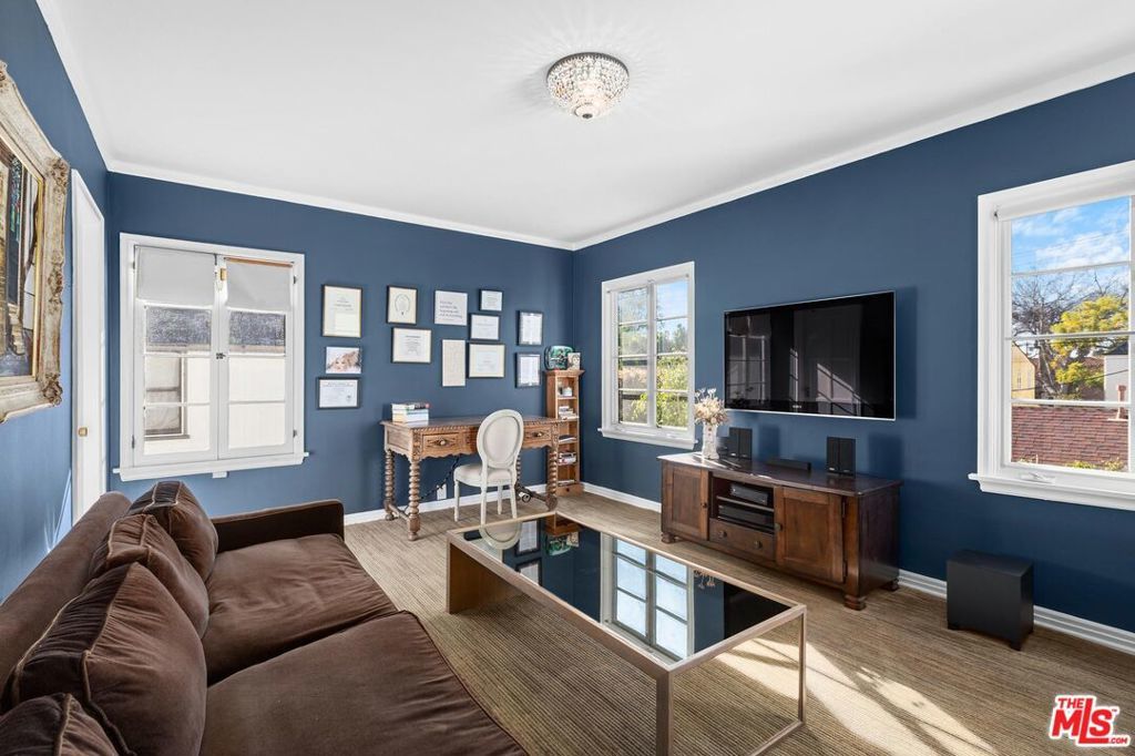 This exquisitely restored Spanish residence sits on a prime tree-lined street in Hancock Park, blending timeless 1920s architecture with refined modern touches. The home offers four bedrooms and three bathrooms spanning over approximately 3,500 square feet. Inside, classic details abound, from arched passageways and richly hued hardwood floors to exposed wood beams and handcrafted tilework along the grand staircase. A gracious living room centers around a fireplace framed by original casement windows, while the chef's kitchen opens to a sunlit family room for effortless flow. French doors lead to a private, lushly landscaped patio, a peaceful retreat perfect for relaxing or entertaining.