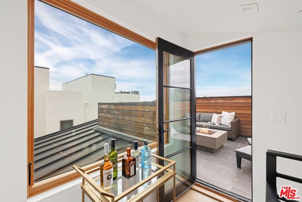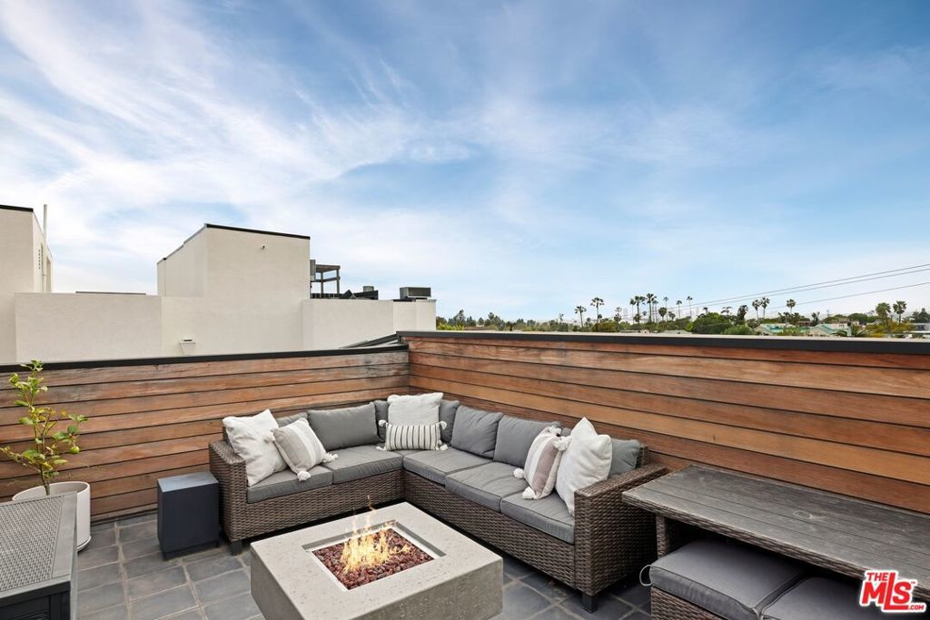 Experience elevated West Hollywood living in this architecturally bold multi-story home one of only four in an exclusive small-lot subdivision. Enter through striking exposed concrete walls and a dramatic floating staircase that rises from the ground-floor garage with car lift to a private rooftop terrace boasting direct views of the Hollywood Sign, Griffith Observatory, downtown LA, Century City, and beyond. The main level features an airy open layout, with a sleek chef's kitchen, stainless steel appliances, and breakfast bar seamlessly flowing into a sun-drenched living/dining space with soaring ceilings and an inviting patio. Upstairs, the expansive primary suite offers a generous walk-in closet, while two additional bedrooms share a chic Jack-and-Jill bath. On the rooftop, a gas fireplace anchors 360-degree views for the ultimate Hollywood lifestyle all just moments from Melrose Place, Plummer Park, and the best of the city.